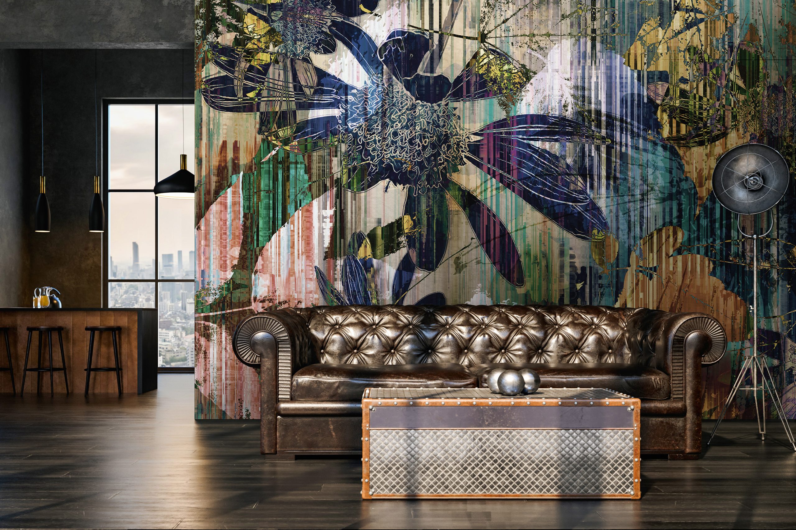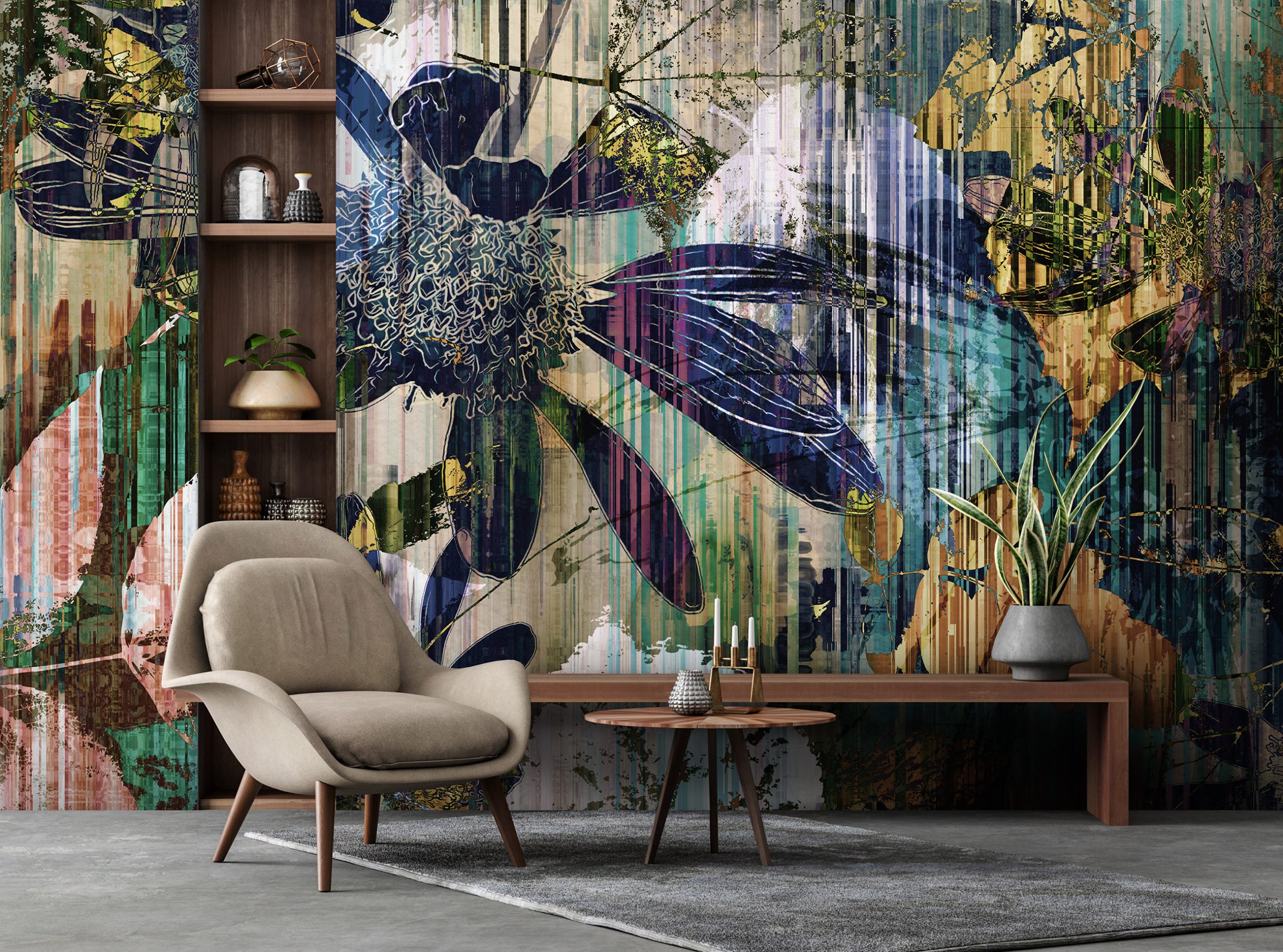Színes absztrakt virágmintás fotótapétánkkal feldobhatja az enteriőr hangulatát. Látványos mintája remekül kiemeli a fókusz falat.