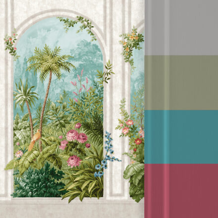 Színes egzotikus dzsungel tájkép, melynek játékos keretet biztosít a márvány boltív mintája. Az életkép inspirációját Kambodzsa híres antik romja, Angkor ihlette, melynek ősi épületeit benőtte a dzsungel és belakták a vadon állatai.