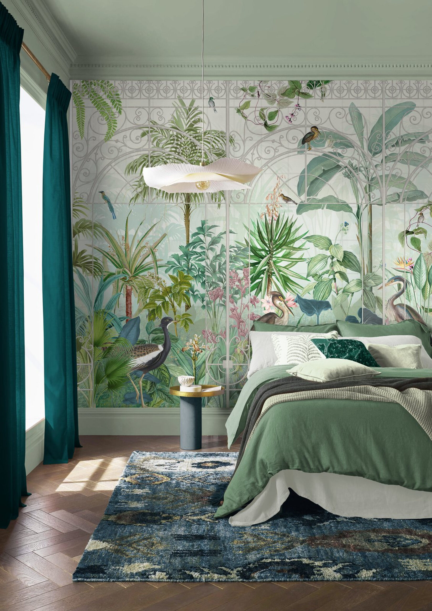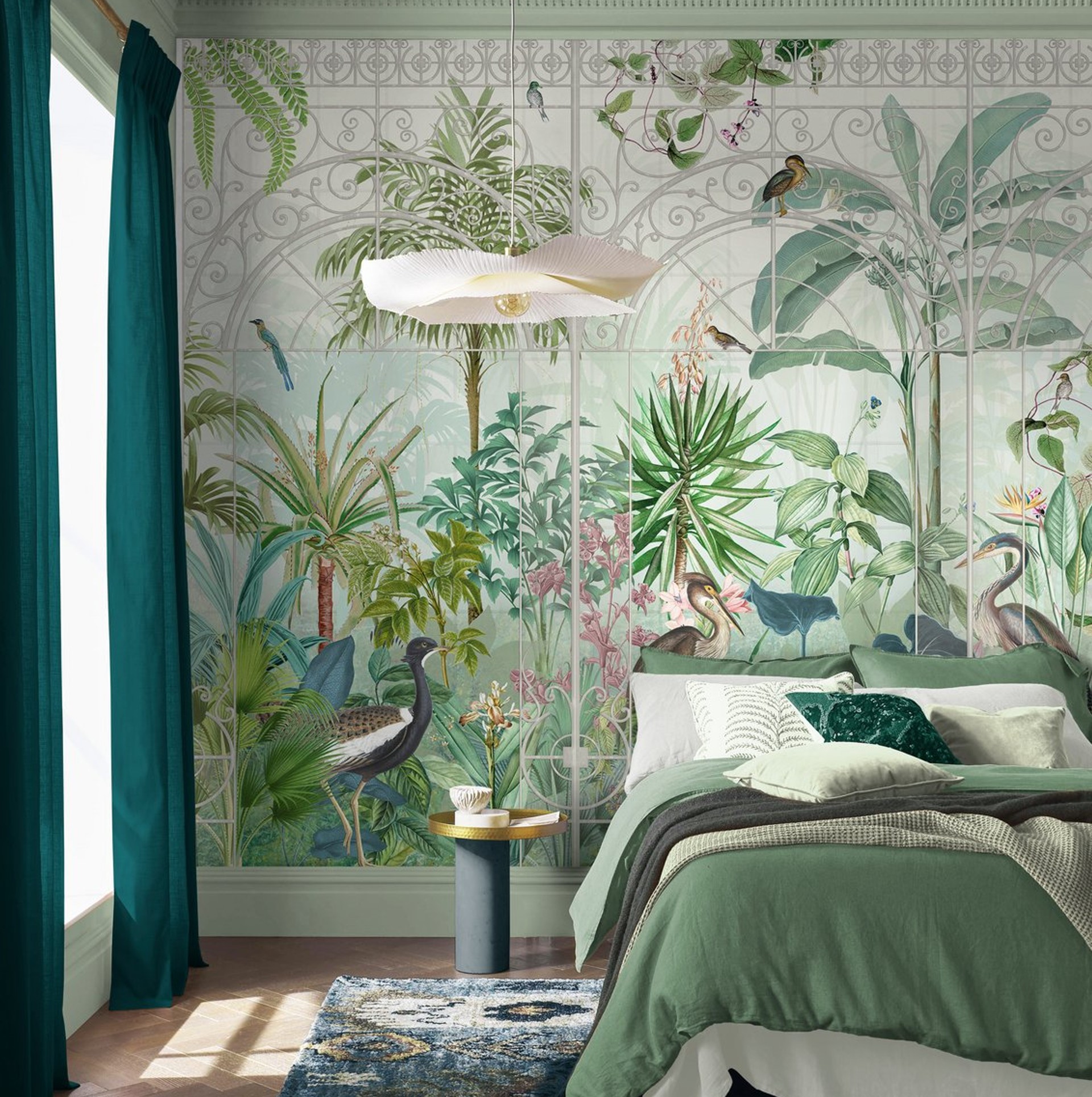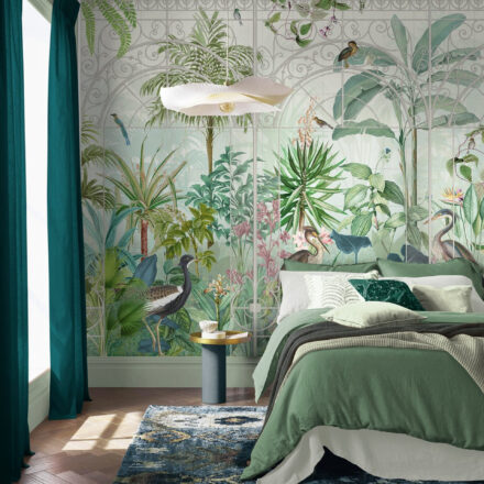 Színes egzotikus fotótapéta trópusi madárház képével, mely a dús növényzetben fenséges madarakkal bukkannak elő. Gyönyörűen megkomponált jelenet, mely az enteriőr meghatározó pontja lesz.