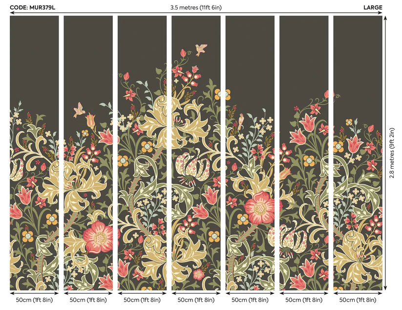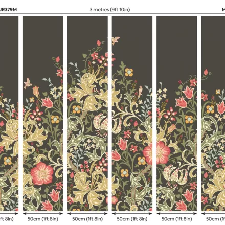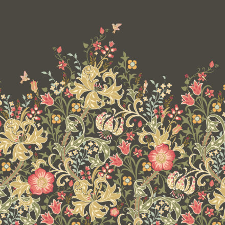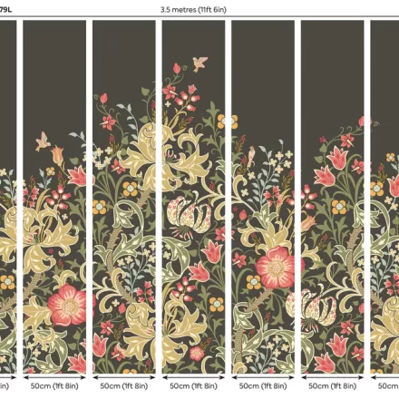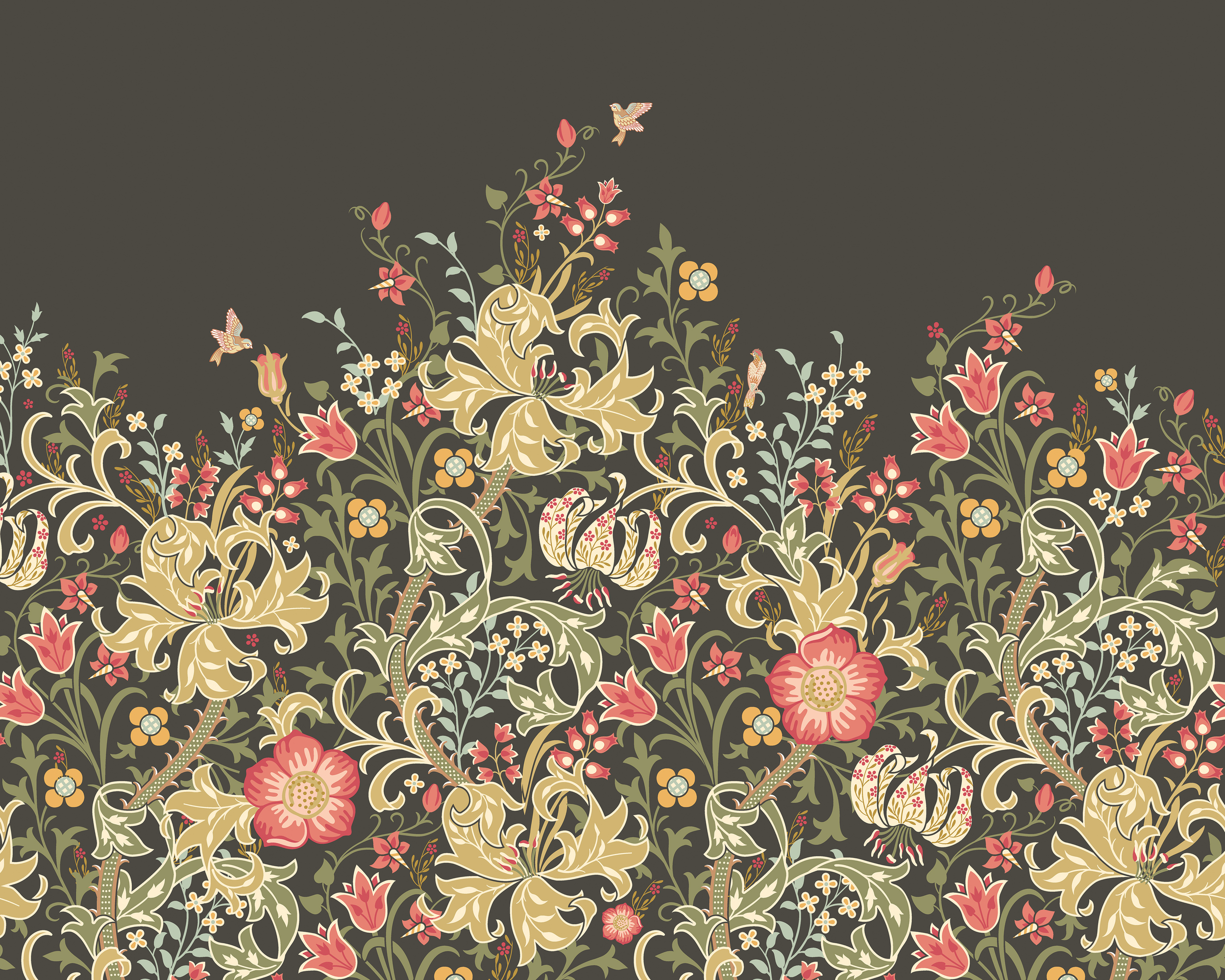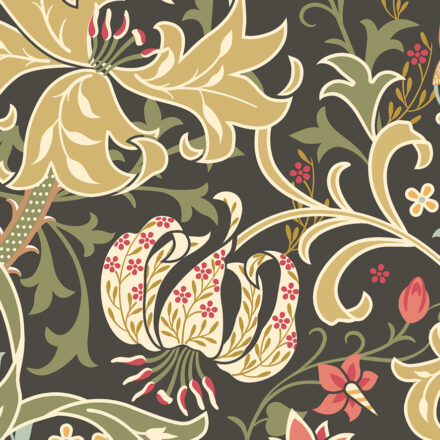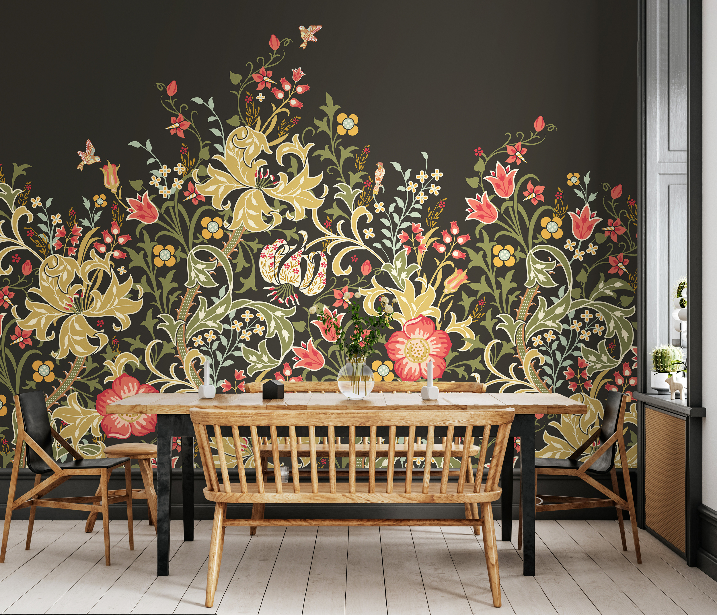 Színes liliomvirágos fotótapéta klasszikus indamintával, melynek motívumát William Morris munkássága ihlette.
