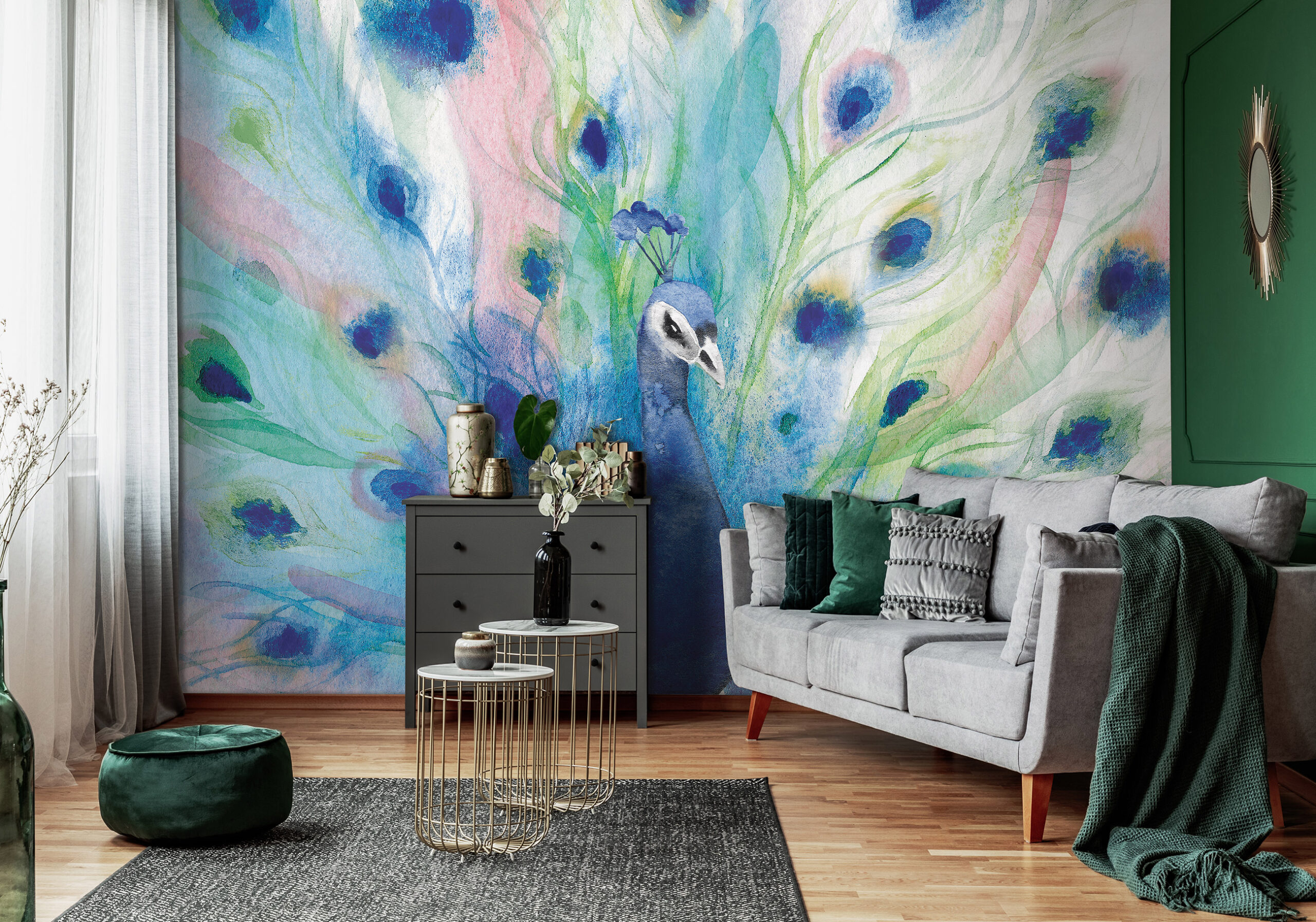 A női szépség kifejezője a pávamadár, melynek színpompás tollai dekorálják különleges fotótapétánkat.