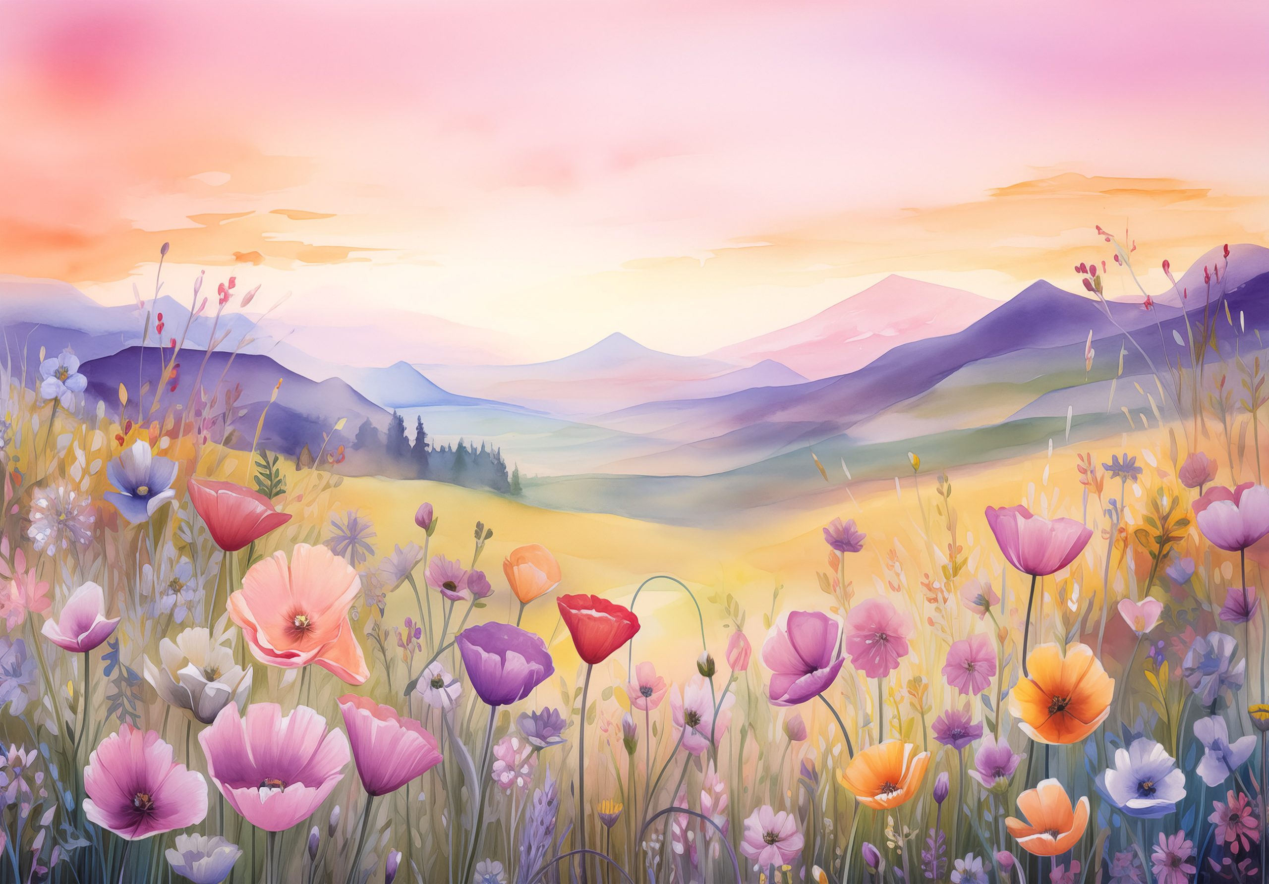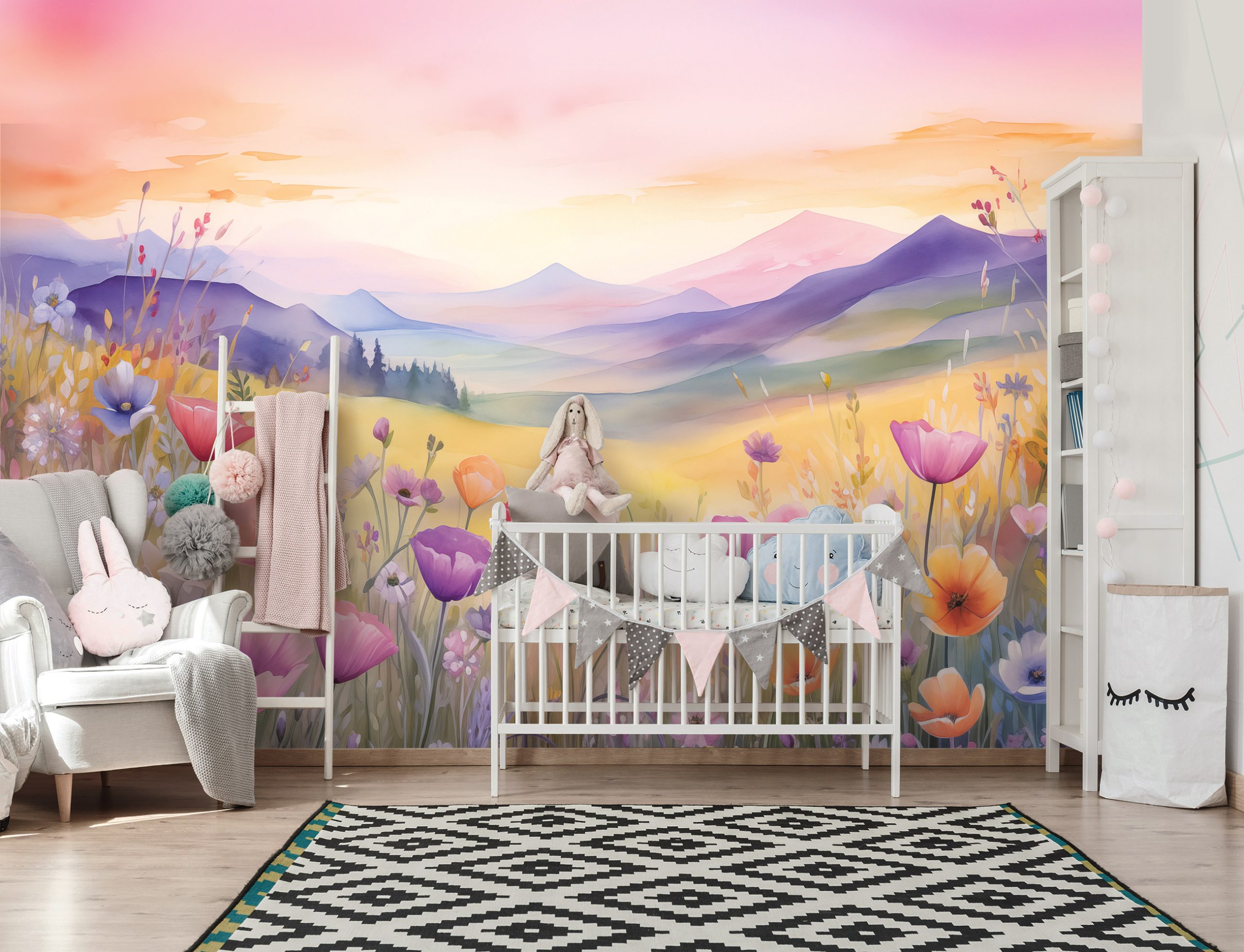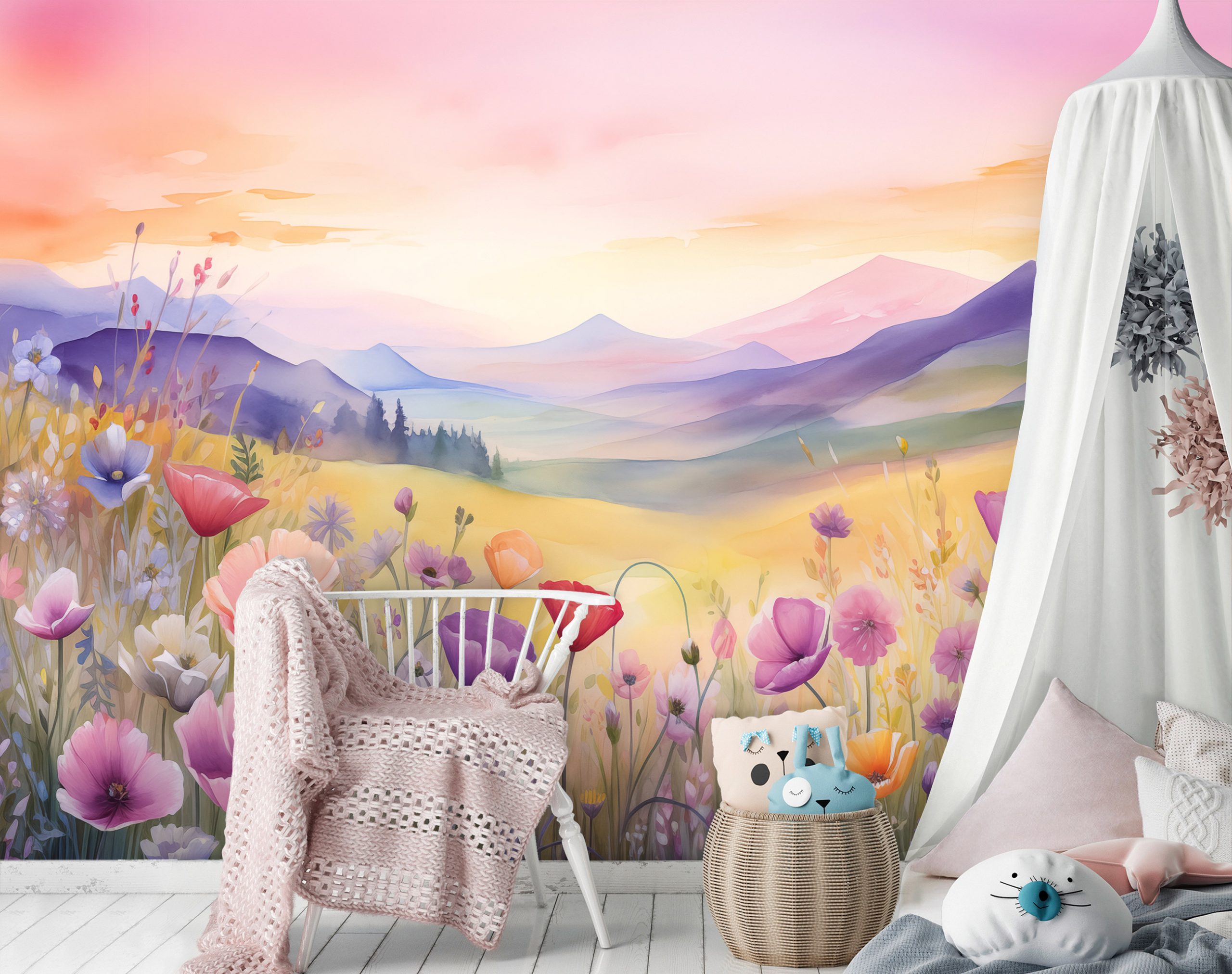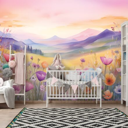 A tavaszi mezők színpompája jelenik meg a fotótapétán, melynek rózsaszín – lila árnyalata tökéletesen illik lányok szobájába.