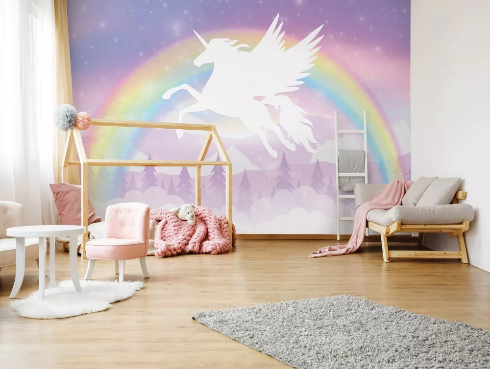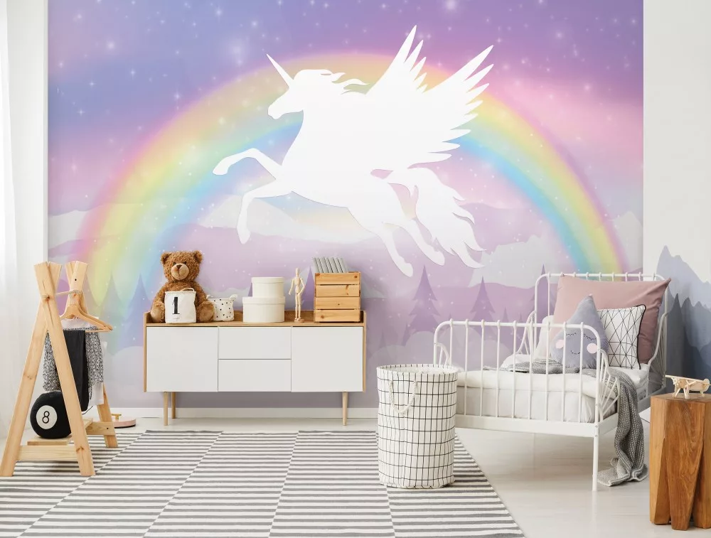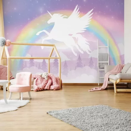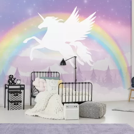 Színes unikornis gyerek fali poszter, ahol az egyszarvú sziluettje a szivárvány felett repül át.