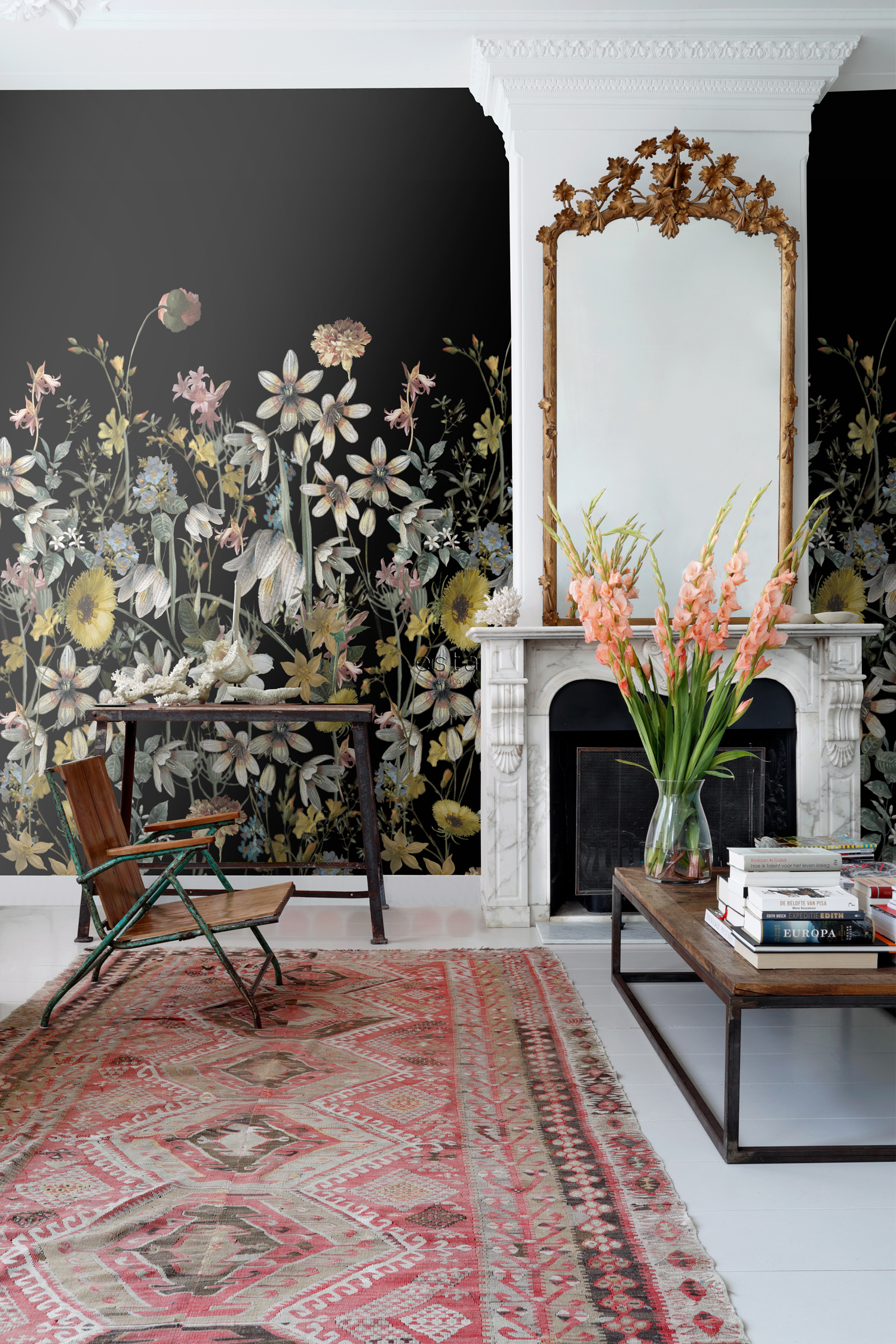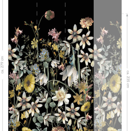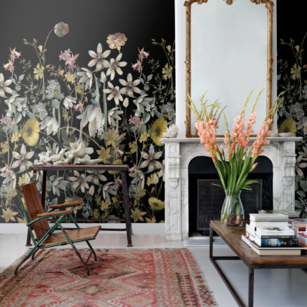 A színes vadvirágos fotótapéta fekete alapszínével drámai kontrasztot teremt, a színpompás virágok kiemelkednek a sötét alapból és romantikus atmoszférát teremtenek.