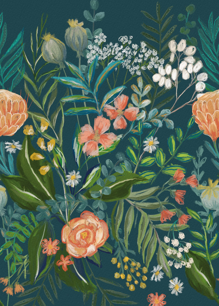 Vadvirágos mezőt ábrázoló fotótapéta, melynek drámai hátteret ad a sötétkék alapszín. A fotótapéta sajátossága, hogy egymás mellé sorolható, így a minta illesztődik, és nagy felület tapétázására is alkalmas.