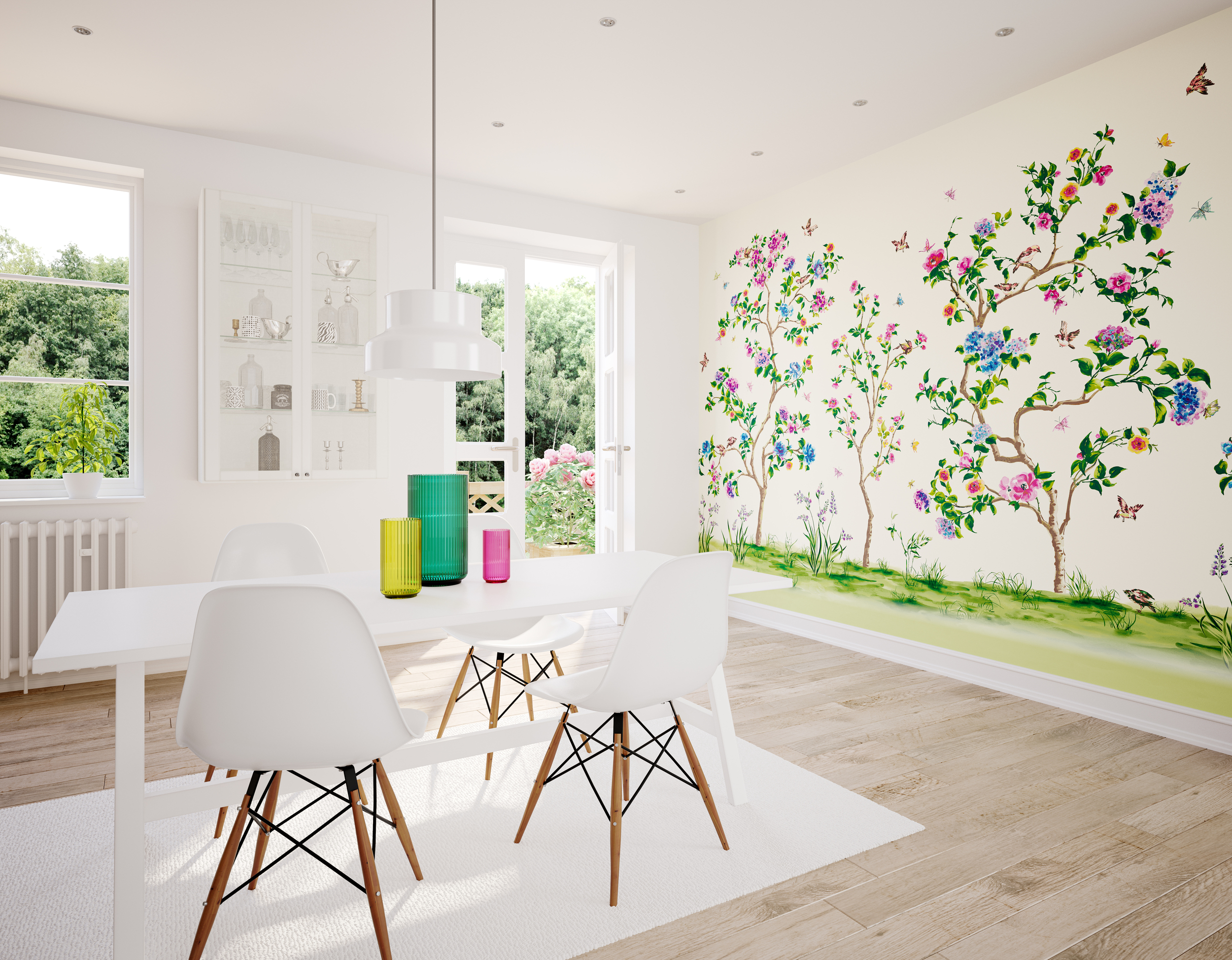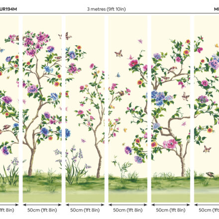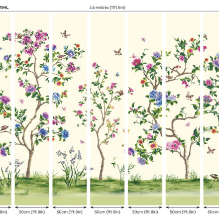 A keleti kultúrákból származó chinoiserie minta dekorálja a tapétát, melynek romantikus virágai között törékeny énekes madarak húzódnak meg.