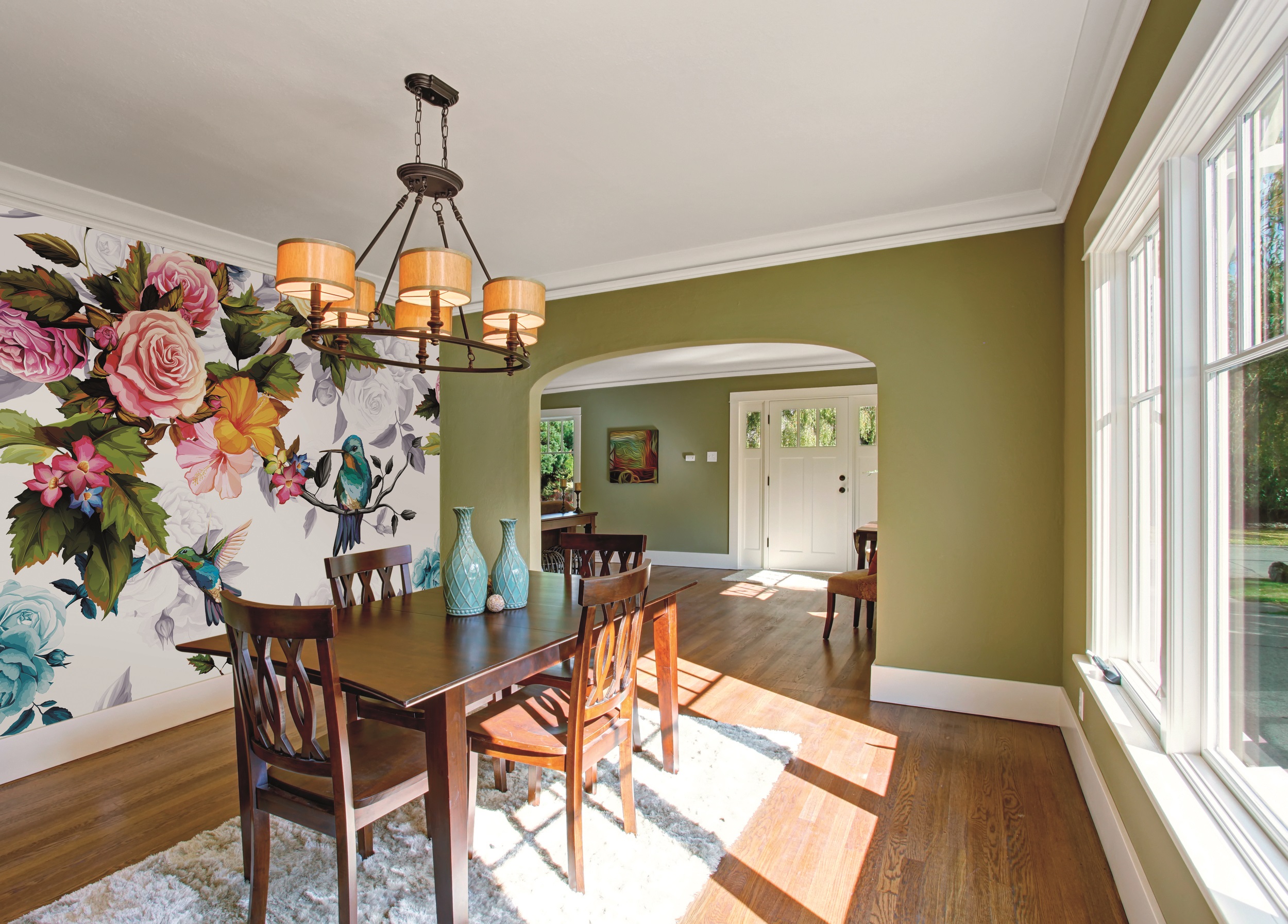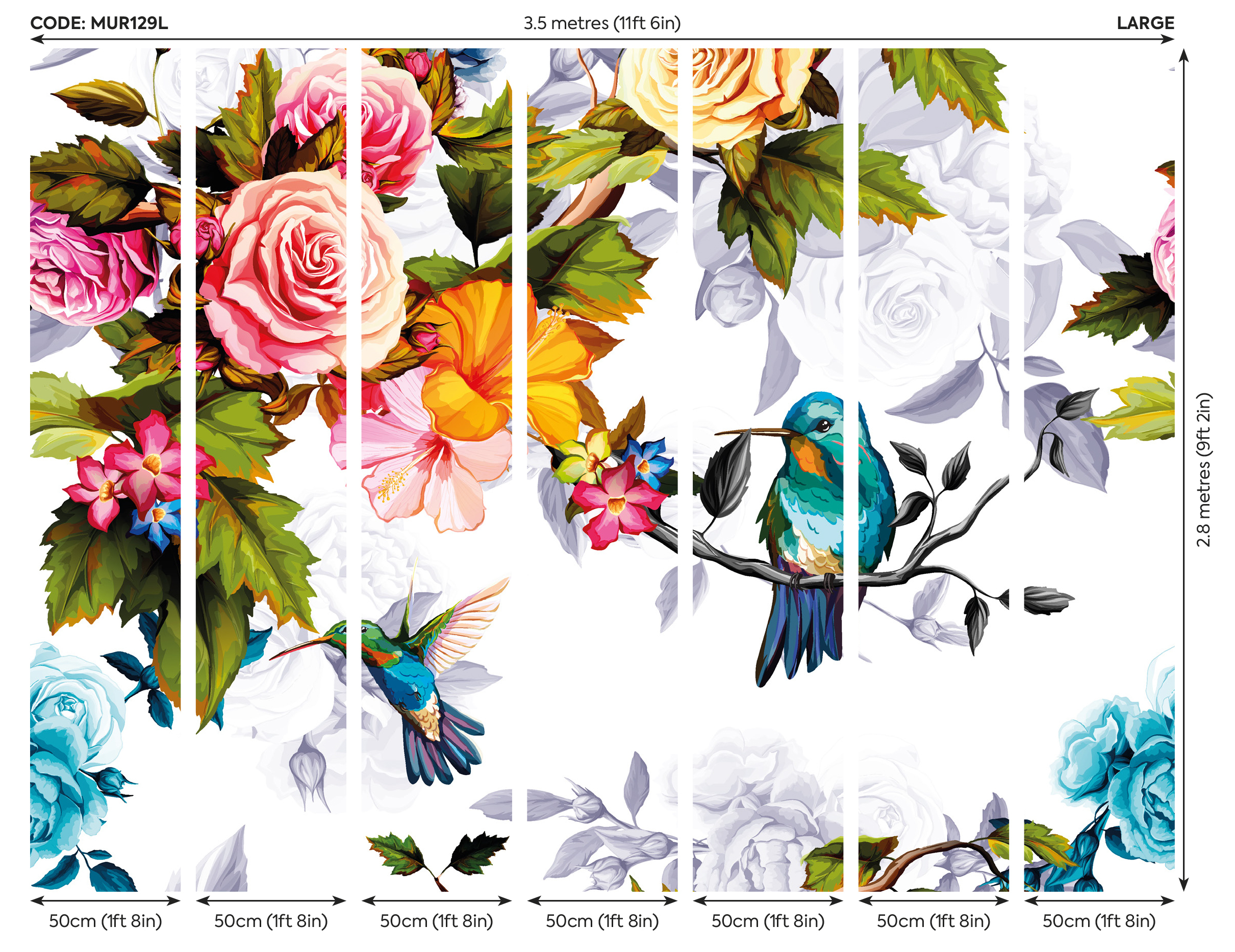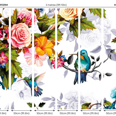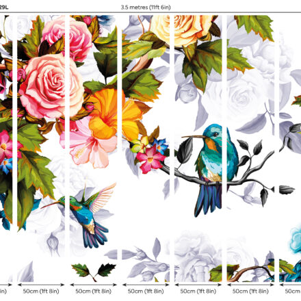 Színes virágos fotótapéta, melyet egyedivé tesznek a kék kolibri madarak. A fotótapéta romantikus atmoszférát teremt az enteriőrben.