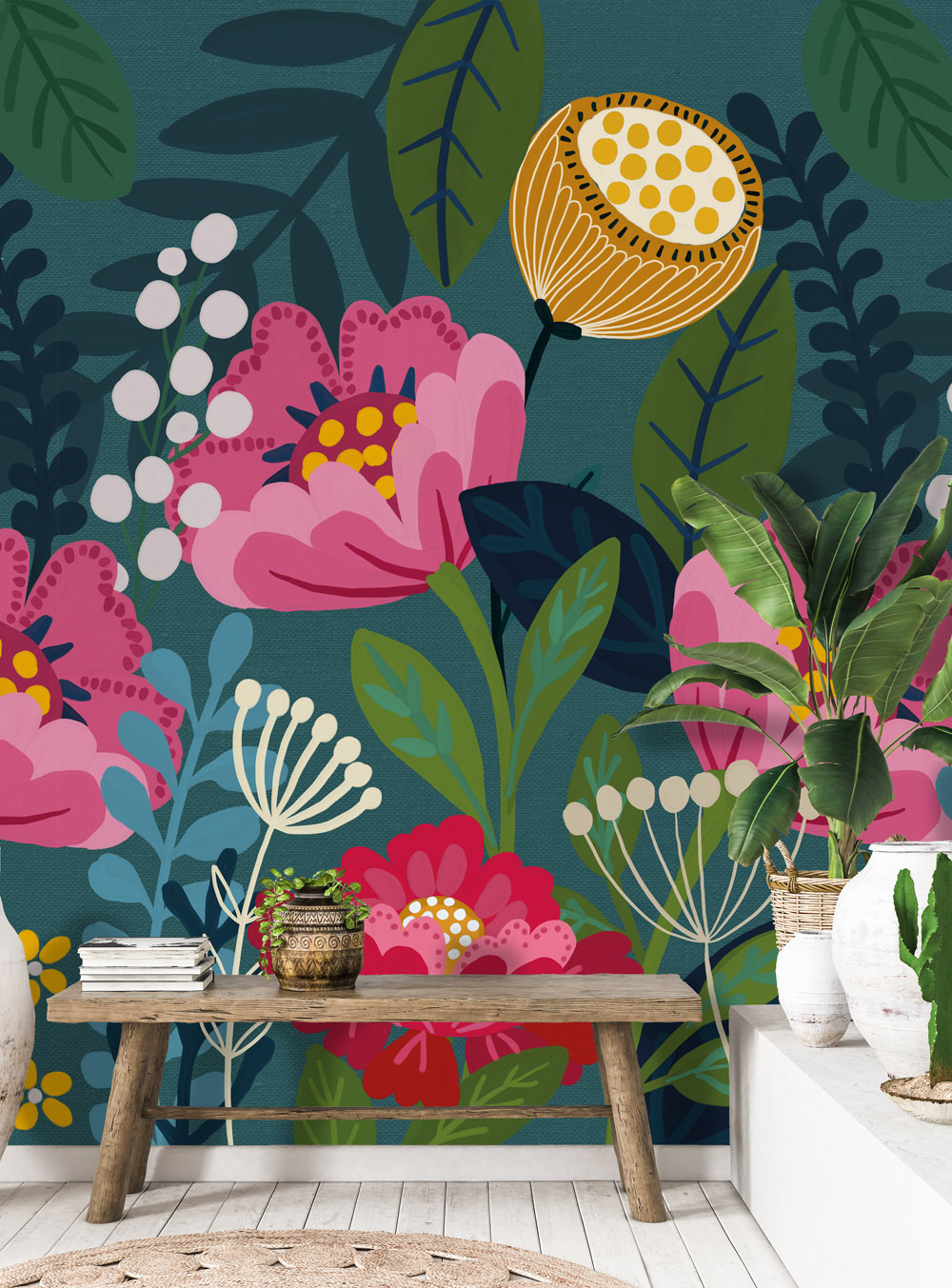 Fiatalos hangulatú virágos fotótapéta, melynek rajzolt virágai látványosan dekorálják az enteriőrt. A fotótapéta sajátossága, hogy egymás mellé sorolható, így a minta illesztődik, és nagy felület tapétázására is alkalmas.