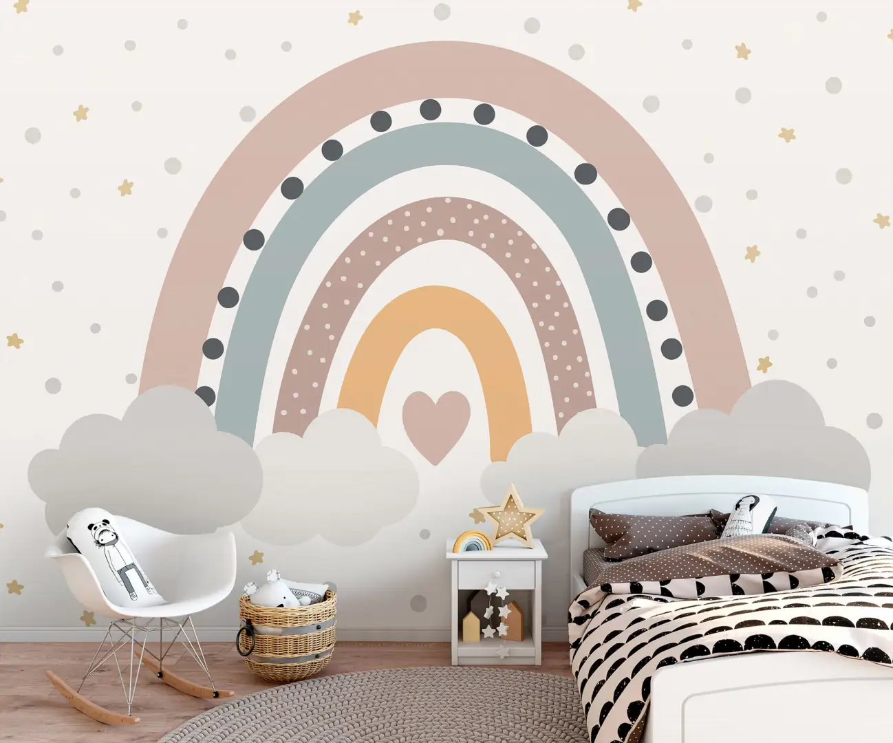 Skandináv stílusban berendezett gyerekszobák kedvelt dekorációja a szivárvány, melynek letisztult formája dekoratív, ugyanakkor vidám atmoszférát teremt.