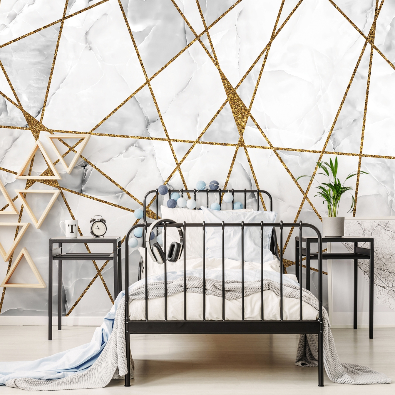 Glamúros hangulatot ébreszt a fotótapéta, melynek bézs márvány alapján arany erezetként fut végig a geometriai minta.