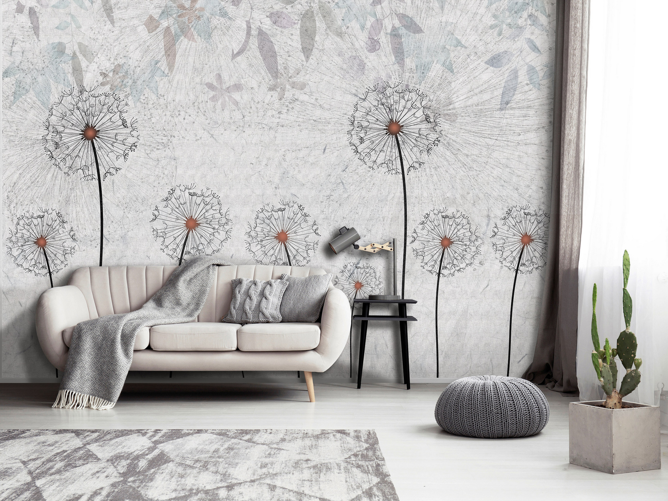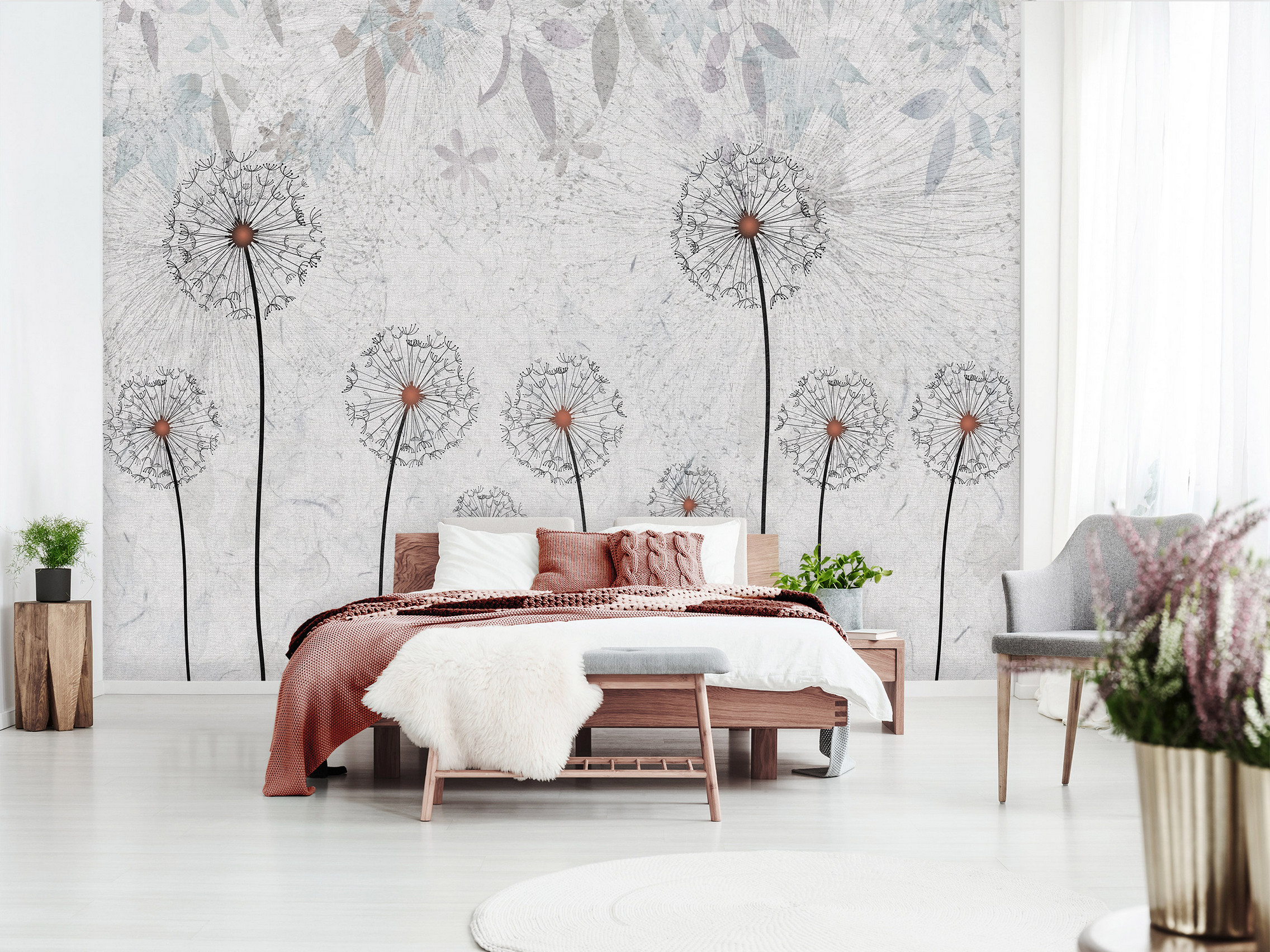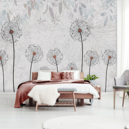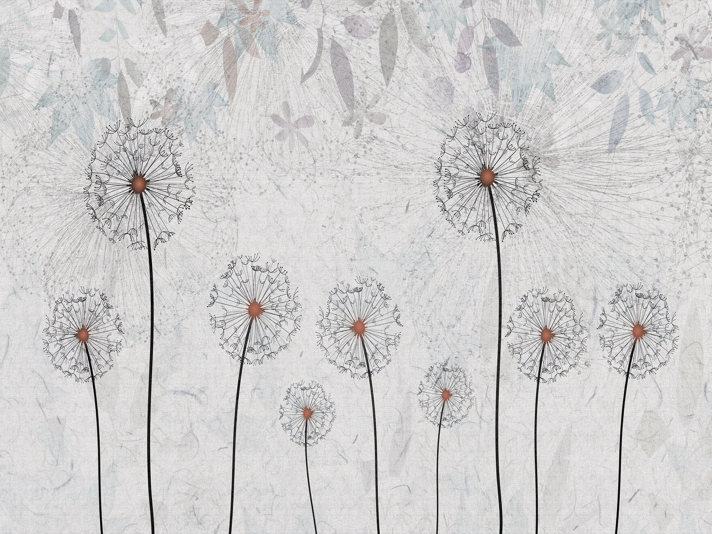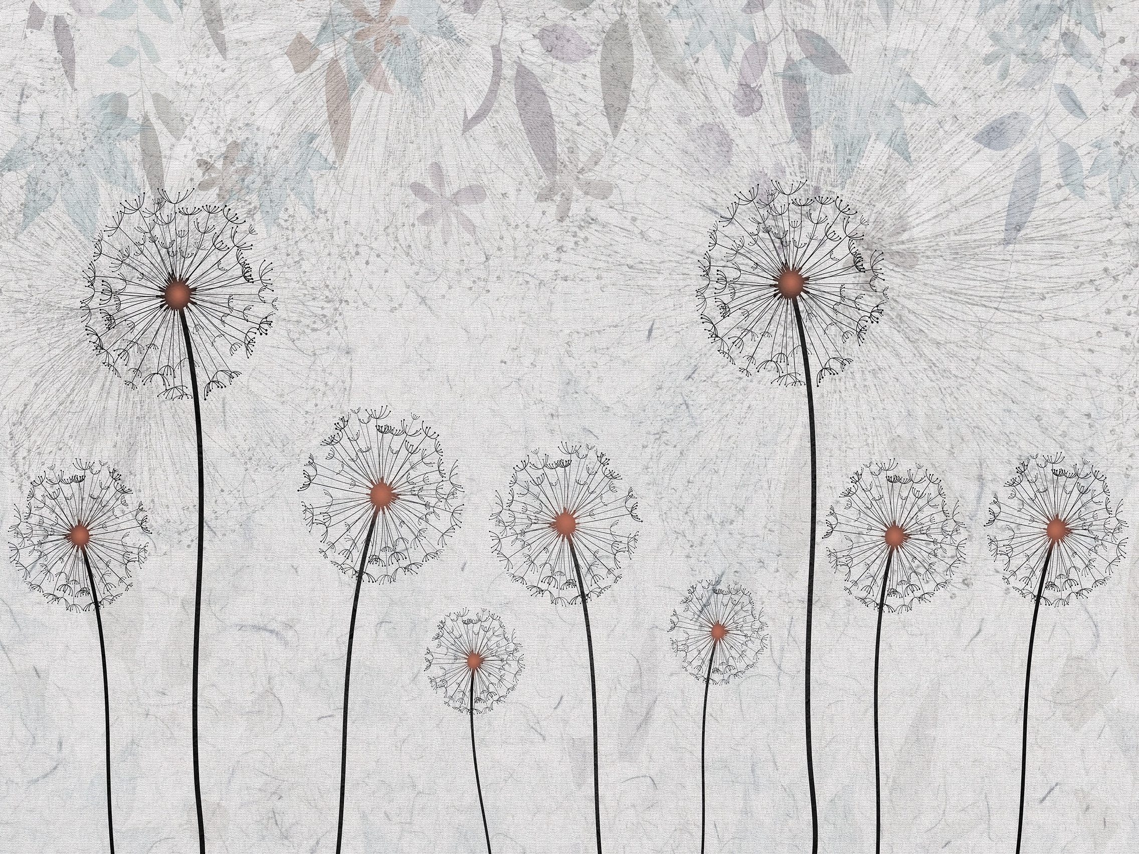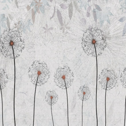 Bájos pitypang virágokat ábrázol a fotótapéta. A felnagyított virágok a természet szépségét hozzák el a szobába, miközben modern atmoszférát teremtenek rajzolt formájukkal.