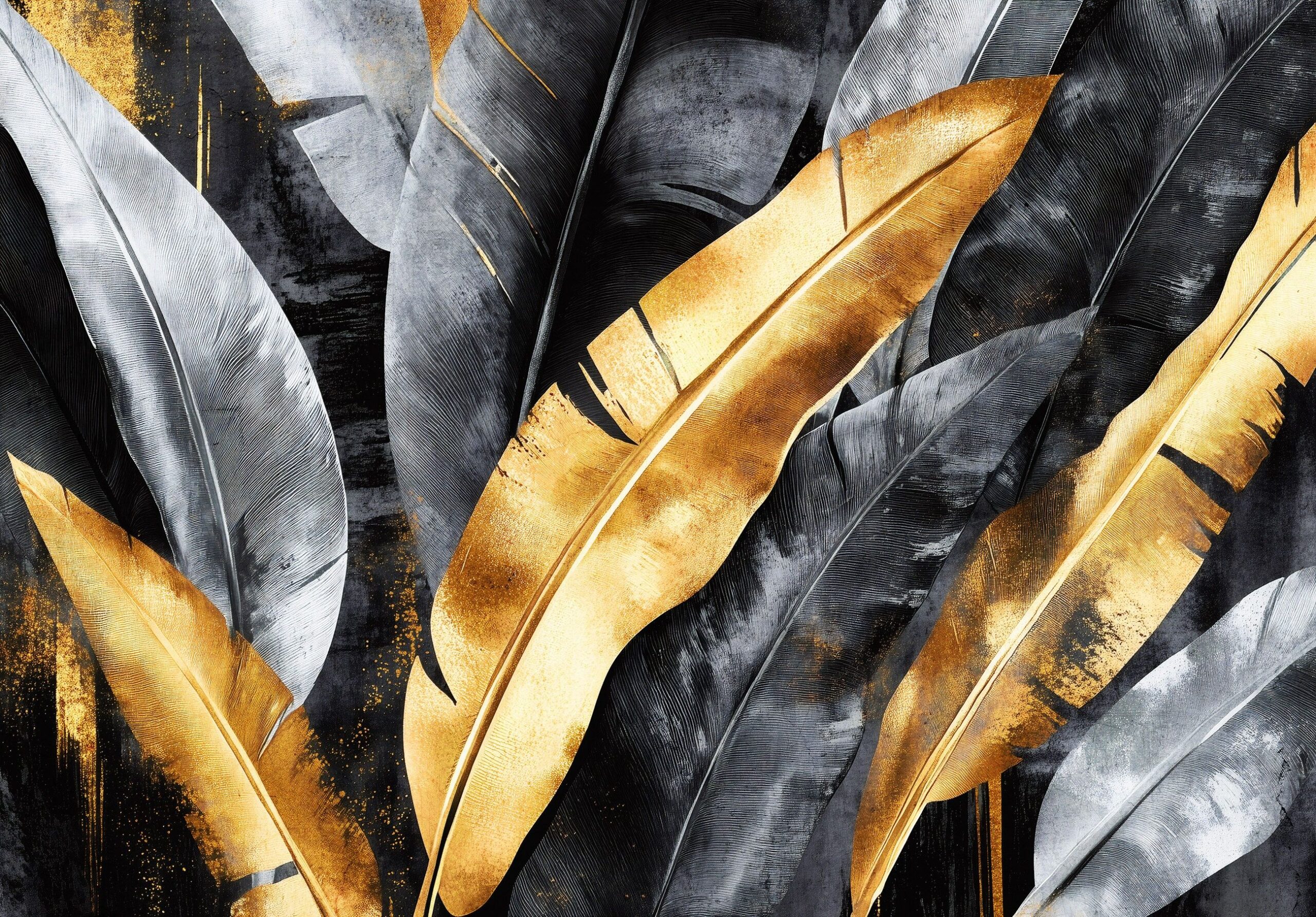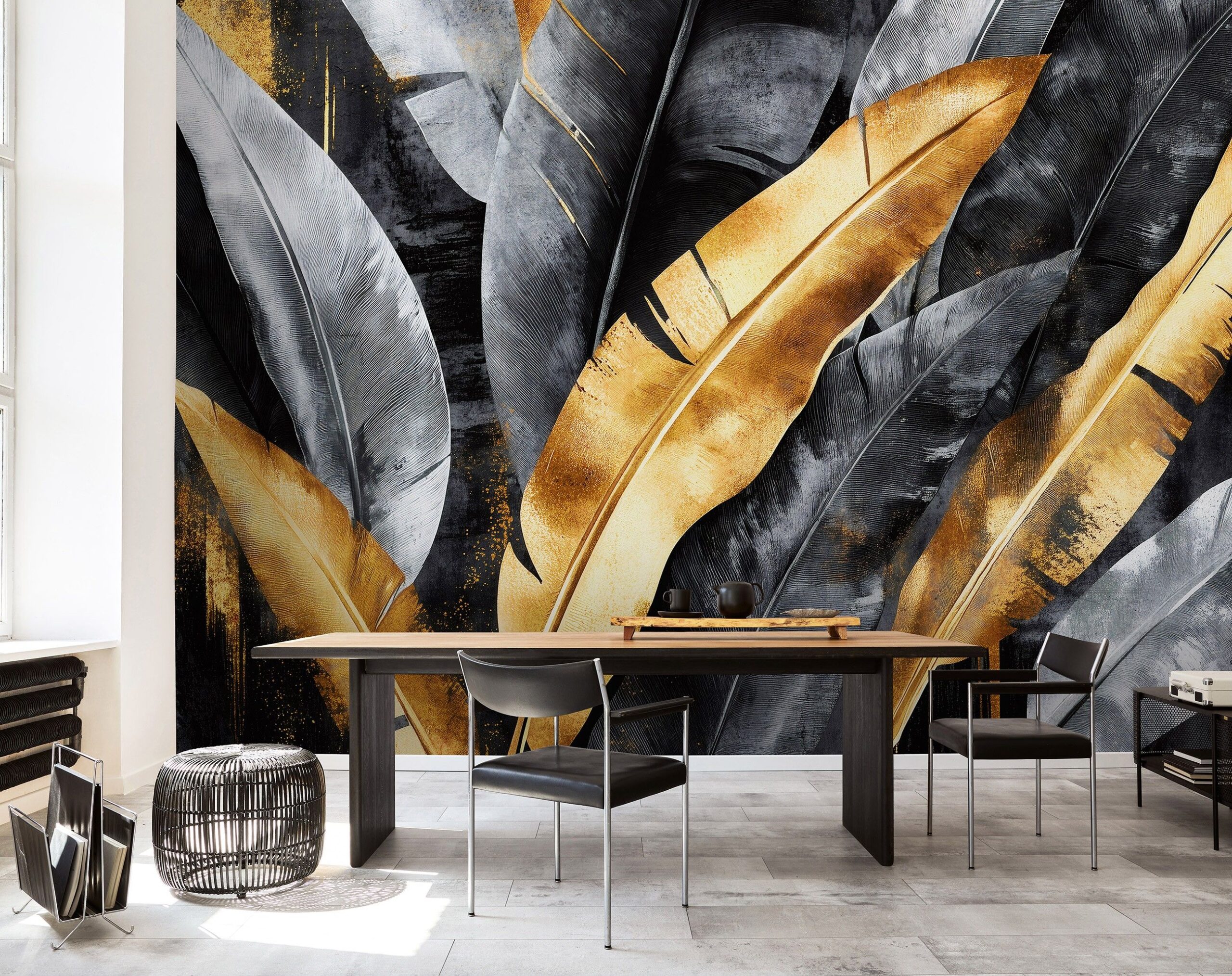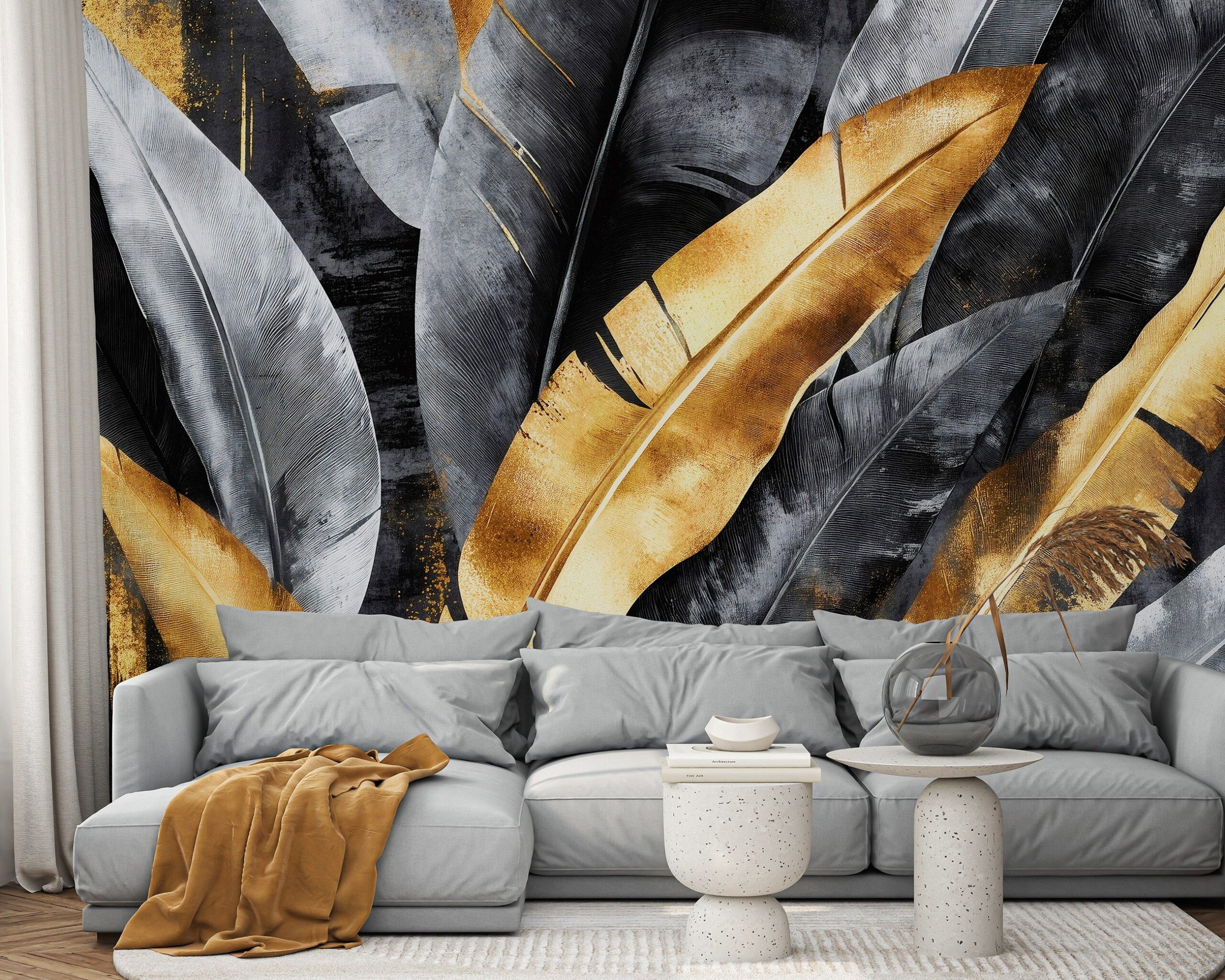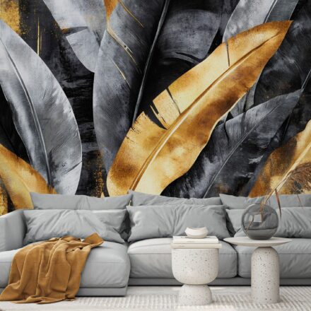Szürke – sárga egzotikus levélmintás fotótapéta, mely tökéletes választás modern enteriőrök számára.