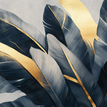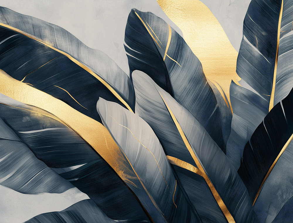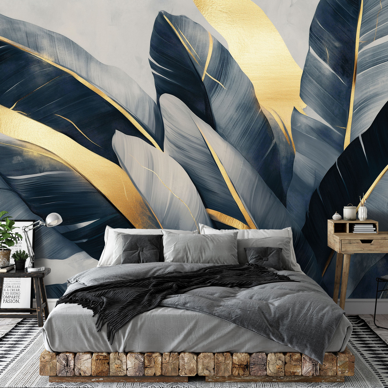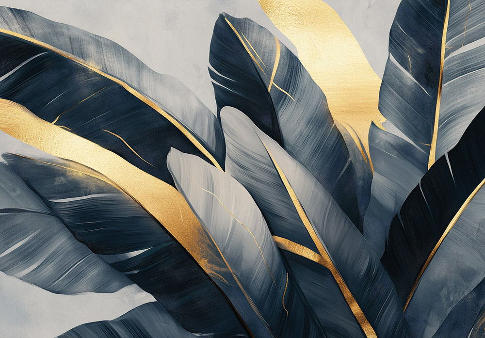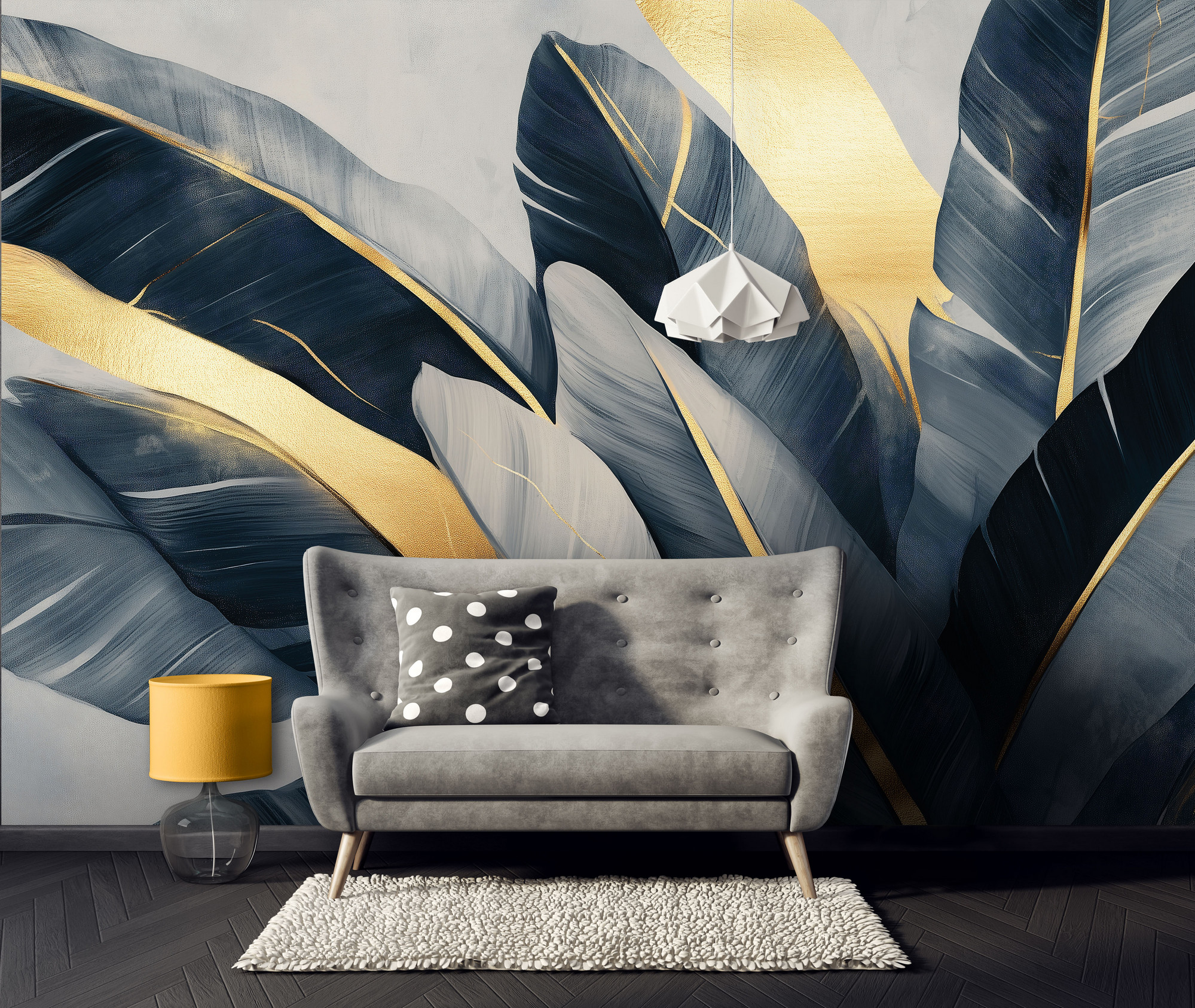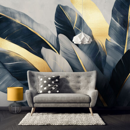 Kékes szürke – sárga fotótapéta nagy méretű levélmintával, mely modern eleganciával és egzotikus hangulattal tölti meg a teret.