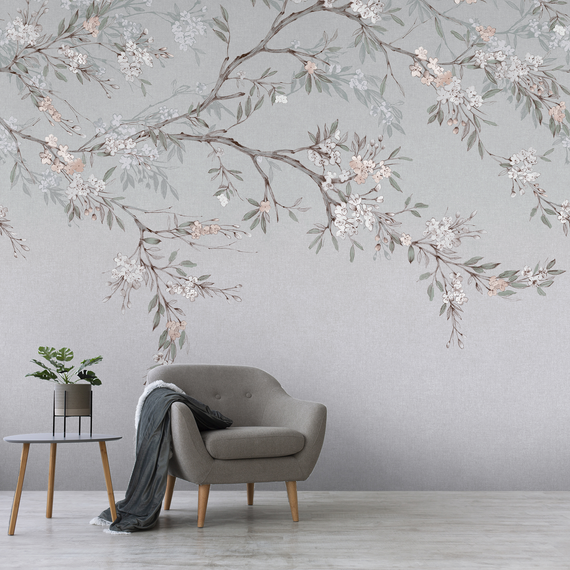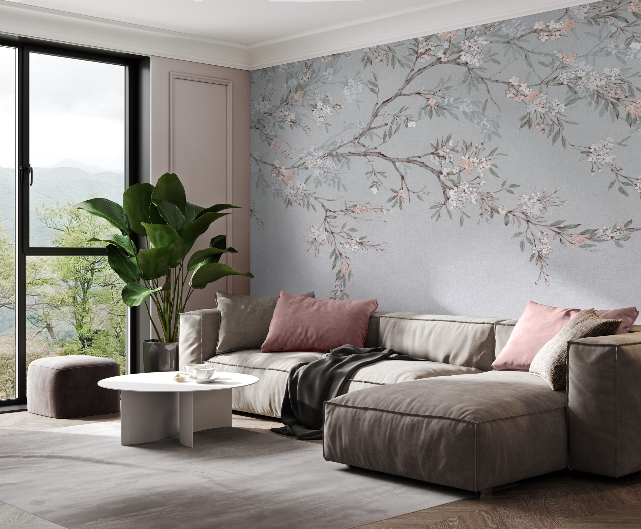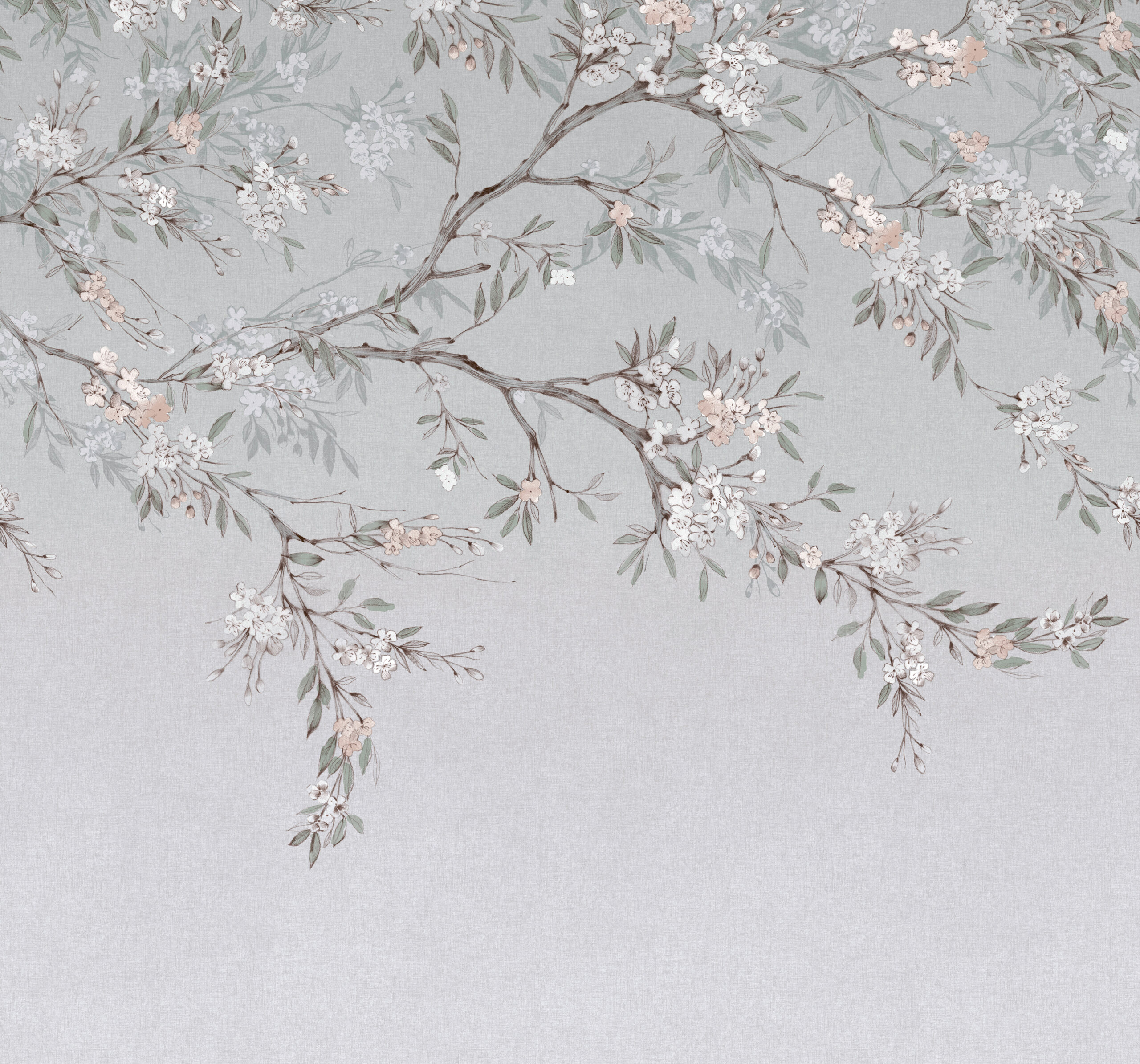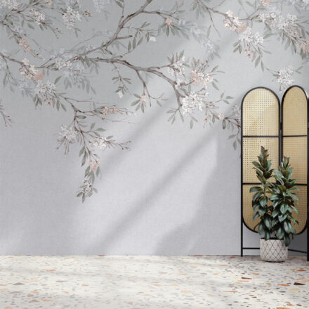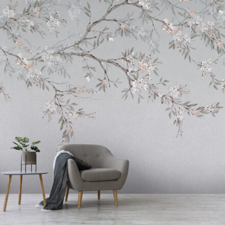 Kék fotótapéta virágos faág mintával, mely a tavasz szépségét és frissességét hozza el otthonodba. Gyönyörű dekoráció nappaliba és hálószobába.