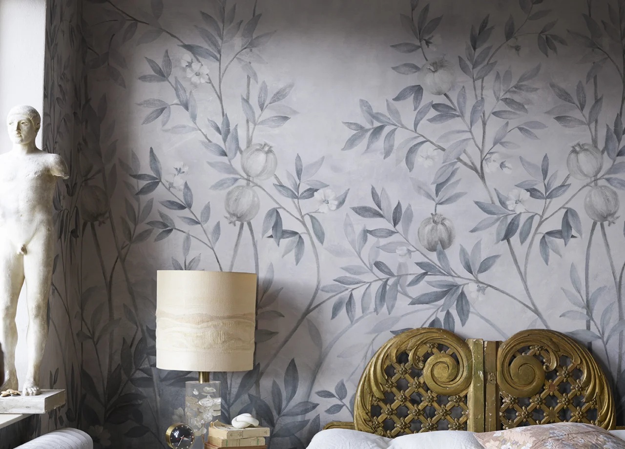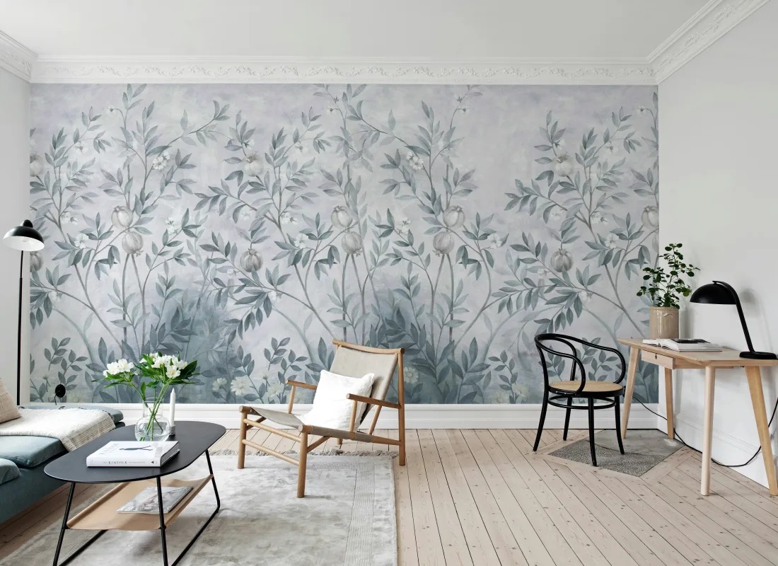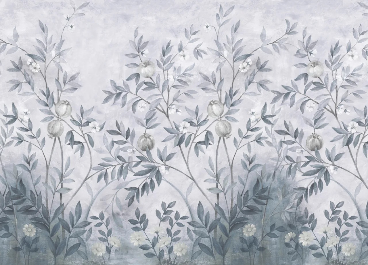 Szürkés kék Rebel Walls fotótapéta elegáns botanikai mintával, egy lenyűgöző, kézzel festett chinoiserie fotótapéta, mely egy varázslatos gyümölcsöskertbe repít: gazdag növényzet, virágba borult ágak és érett gránátalmák bújnak meg a lágy akvarell-ecsetvonások között. A látvány megnyugtató és álomszerű, a természet legszebb arcát mutatja.