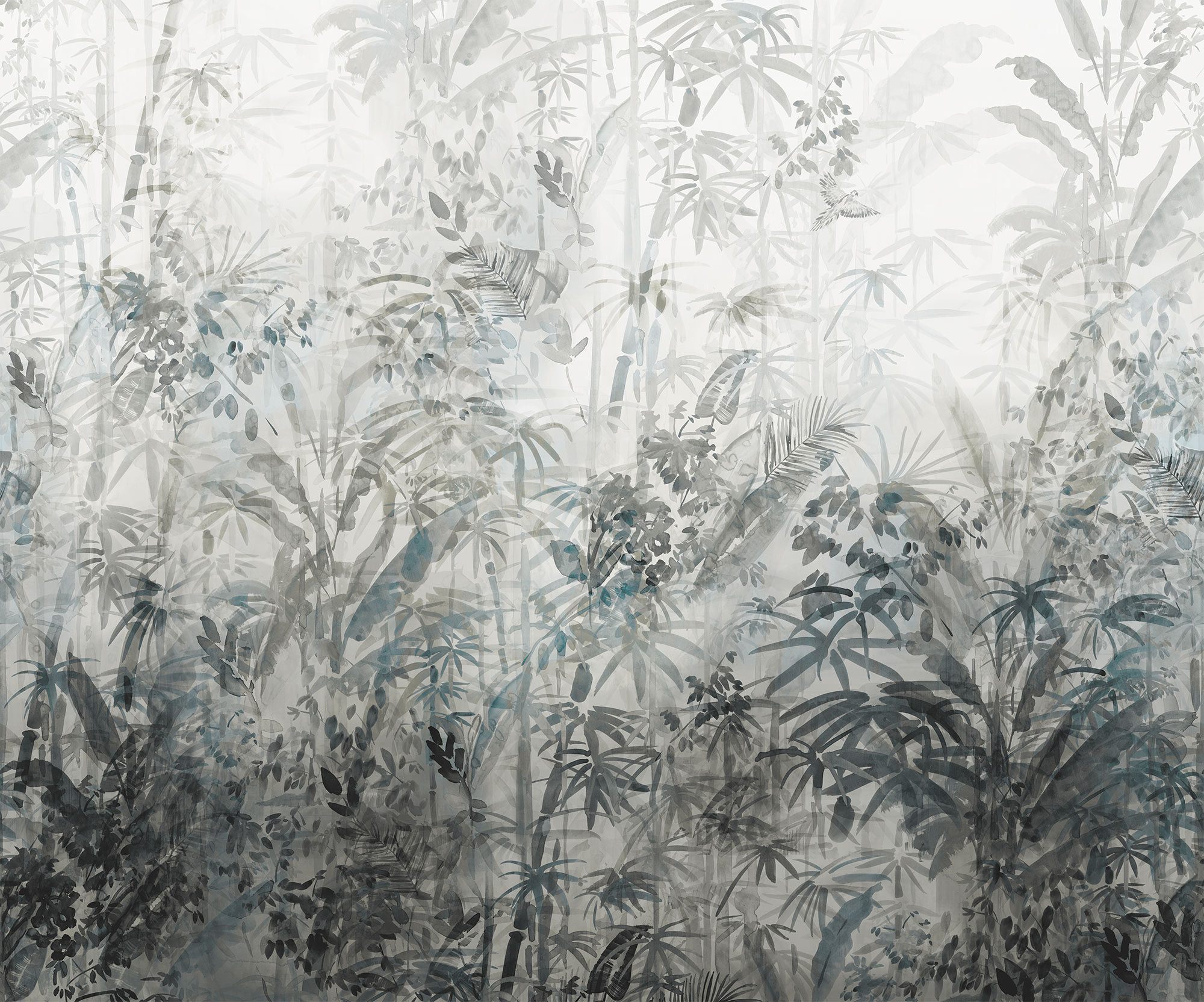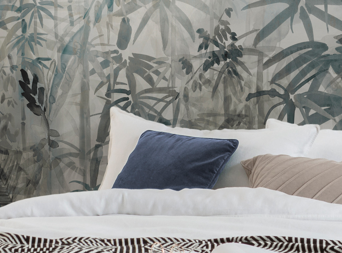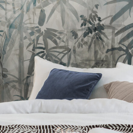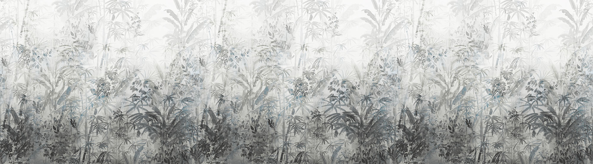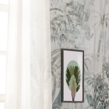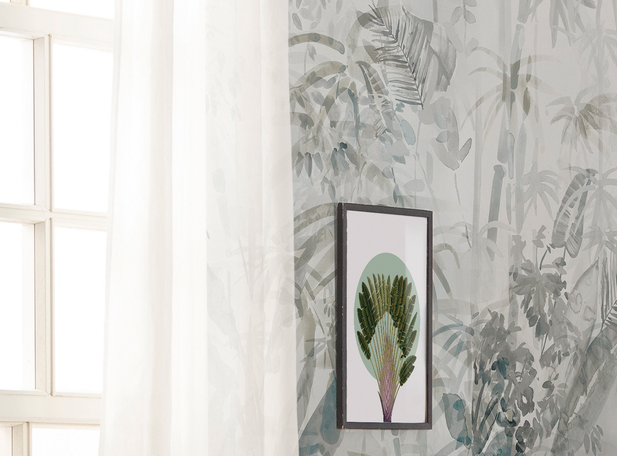 Kifinomult trópusi minta dekorálja a tapétát, melynek akvarell festmény jellege kiemeli a képet az átlag fotótapéták közül. A finom kékes szürke árnyalat időtlen eleganciát és kifinomultságot tükröz.