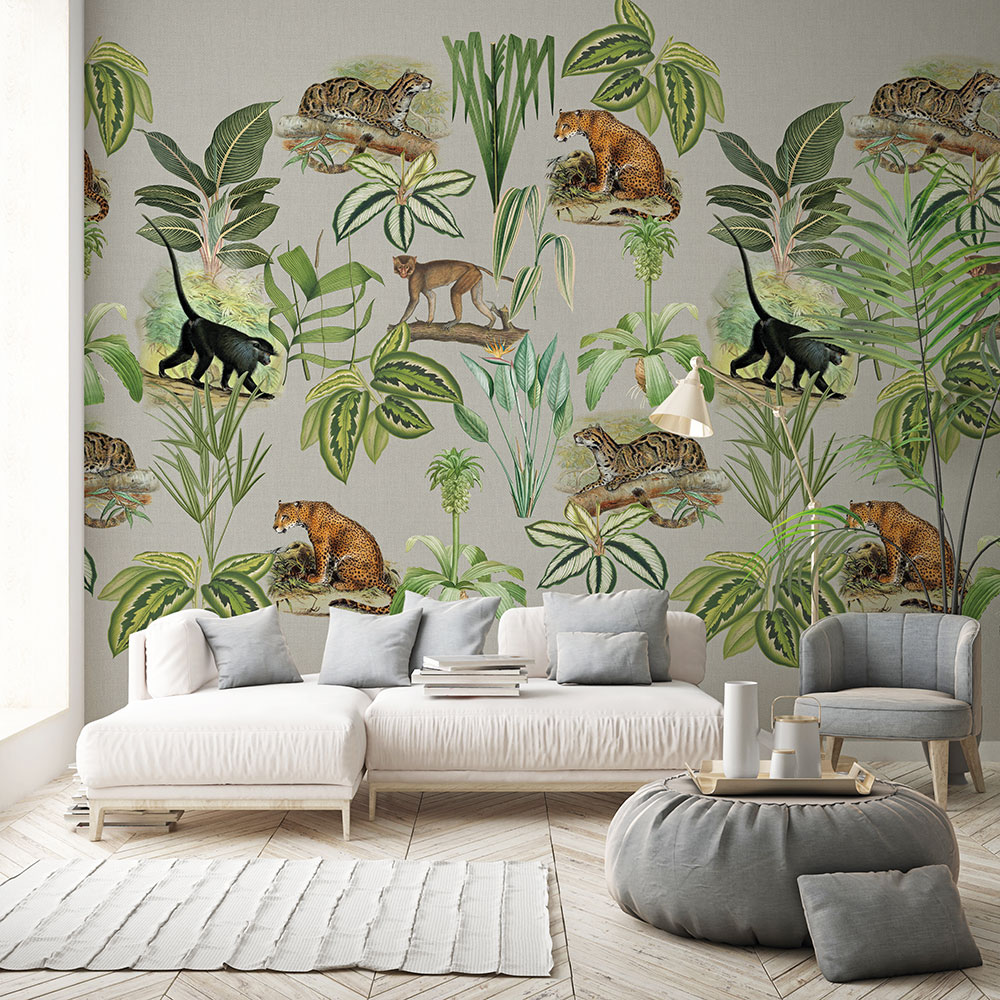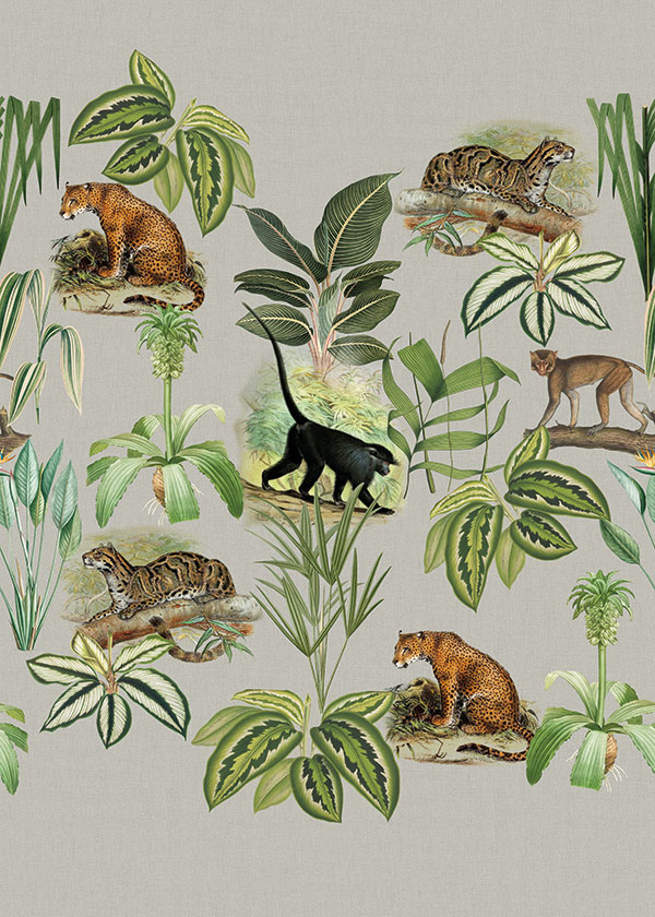 A fotótapéta a dzsungelek vadállatait ábrázolja zöld falevelek mögé rejtve. Egzotikus atmoszféra lengi be tőle a teret. A fotótapéta sajátossága, hogy egymás mellé sorolható, így a minta illesztődik, és nagy felület tapétázására is alkalmas.