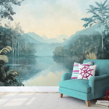 Tóparti hegyvidék fotótapéta – csodás hegyek és nyugodt tó látványa jelenik meg ezen a romantikus faldekoráción. A finom kék árnyalatok és a természeti táj megnyugtató hangulatot áraszt, ideális választás nappaliba vagy hálószobába.
