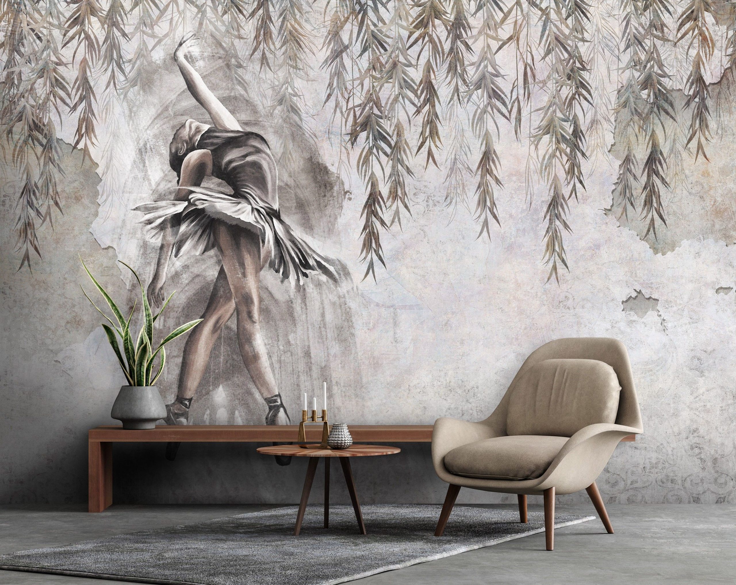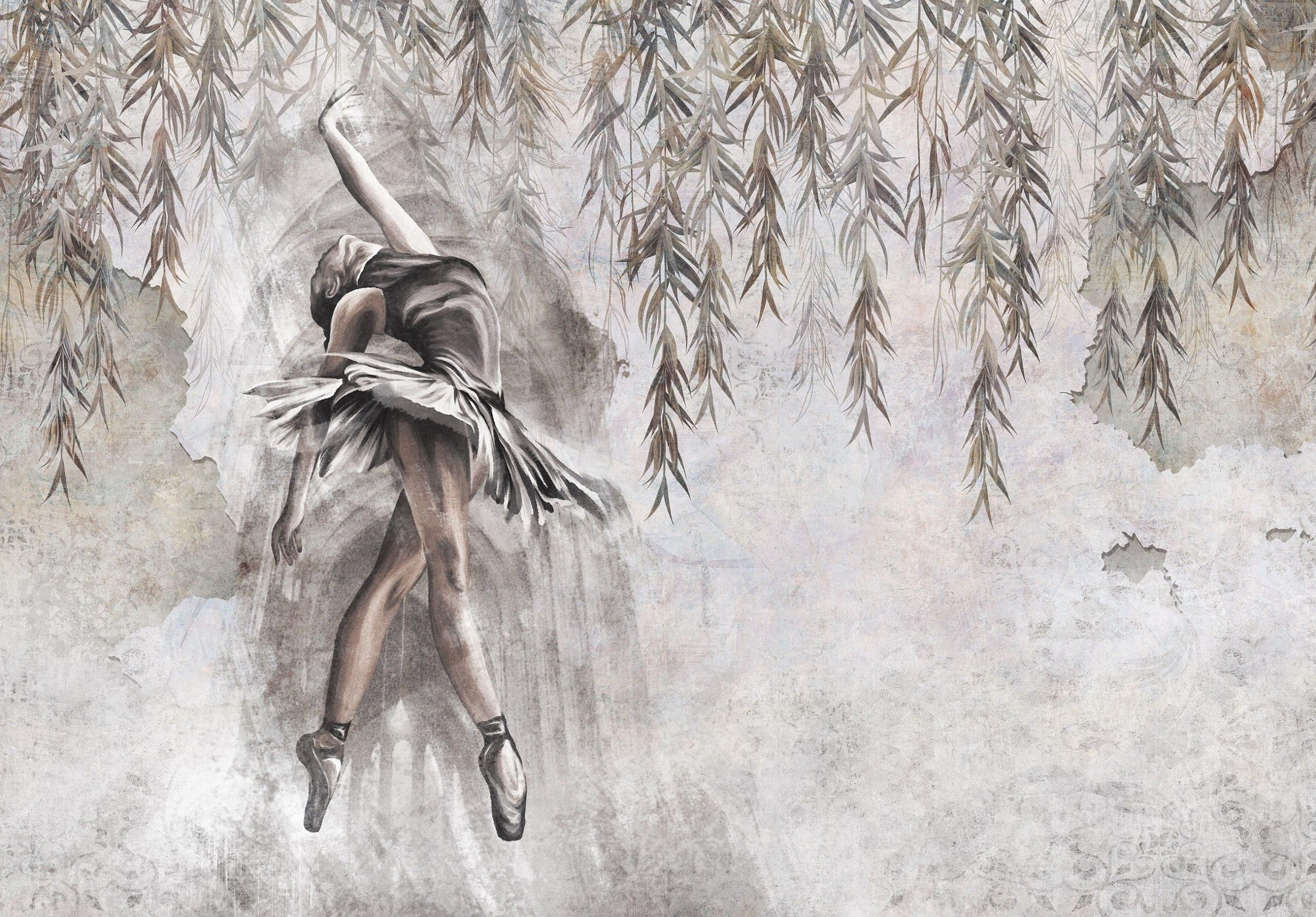 Trendi fotótapéta lecsüngő levélfüzérrel és balerinával, melynek egyedi formát kölcsönöz az antik falat imitáló fotóalap.