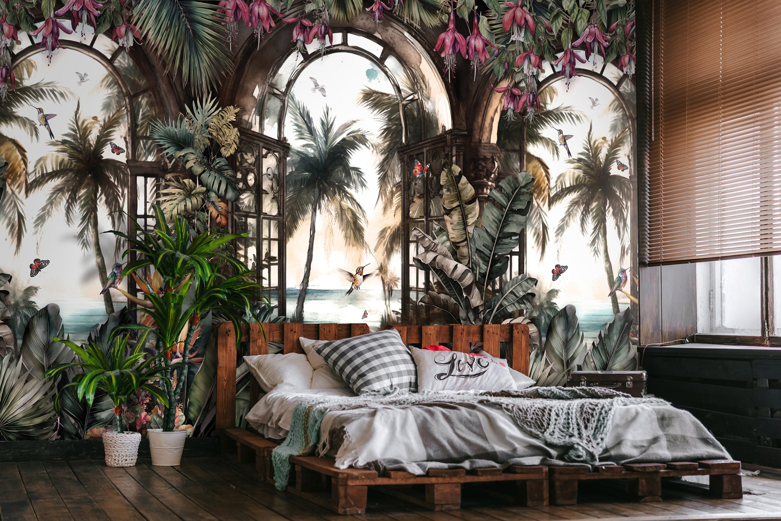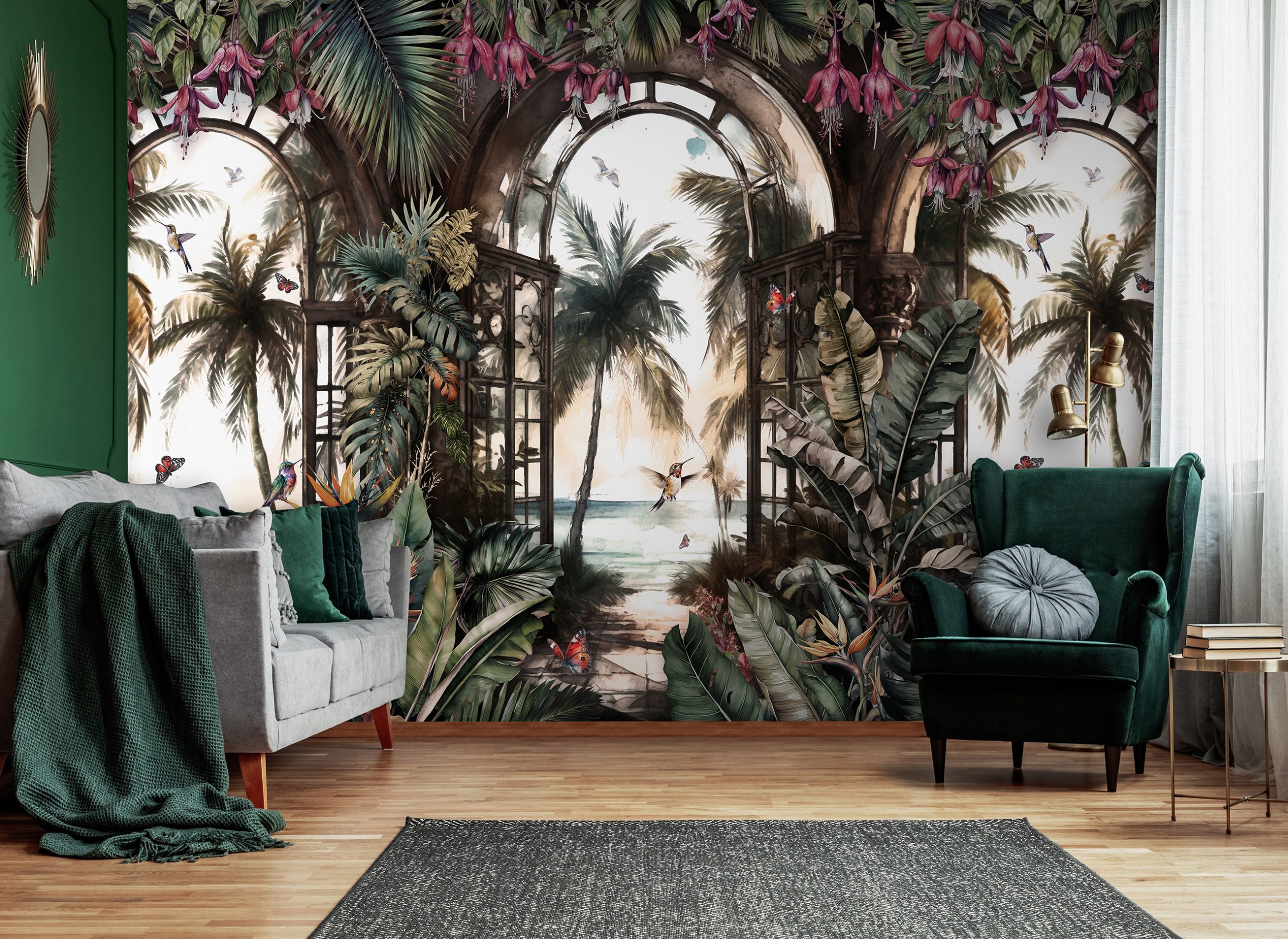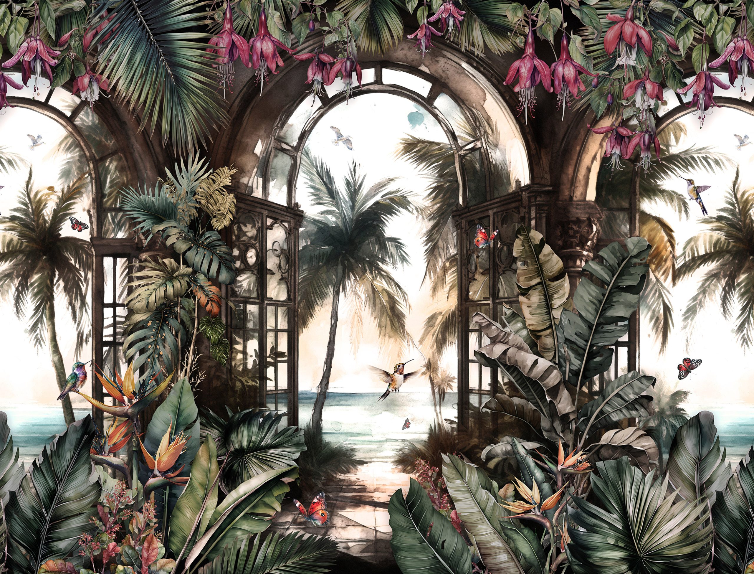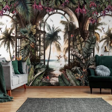 Paradicsomi hangulatot teremtő fotótapéta, melynek gazdag növényzetében egzotikus kolibri madarak tűnnek elő. A mintában megjelenő ablakok továbbá térnövelő hatással rendelkeznek.