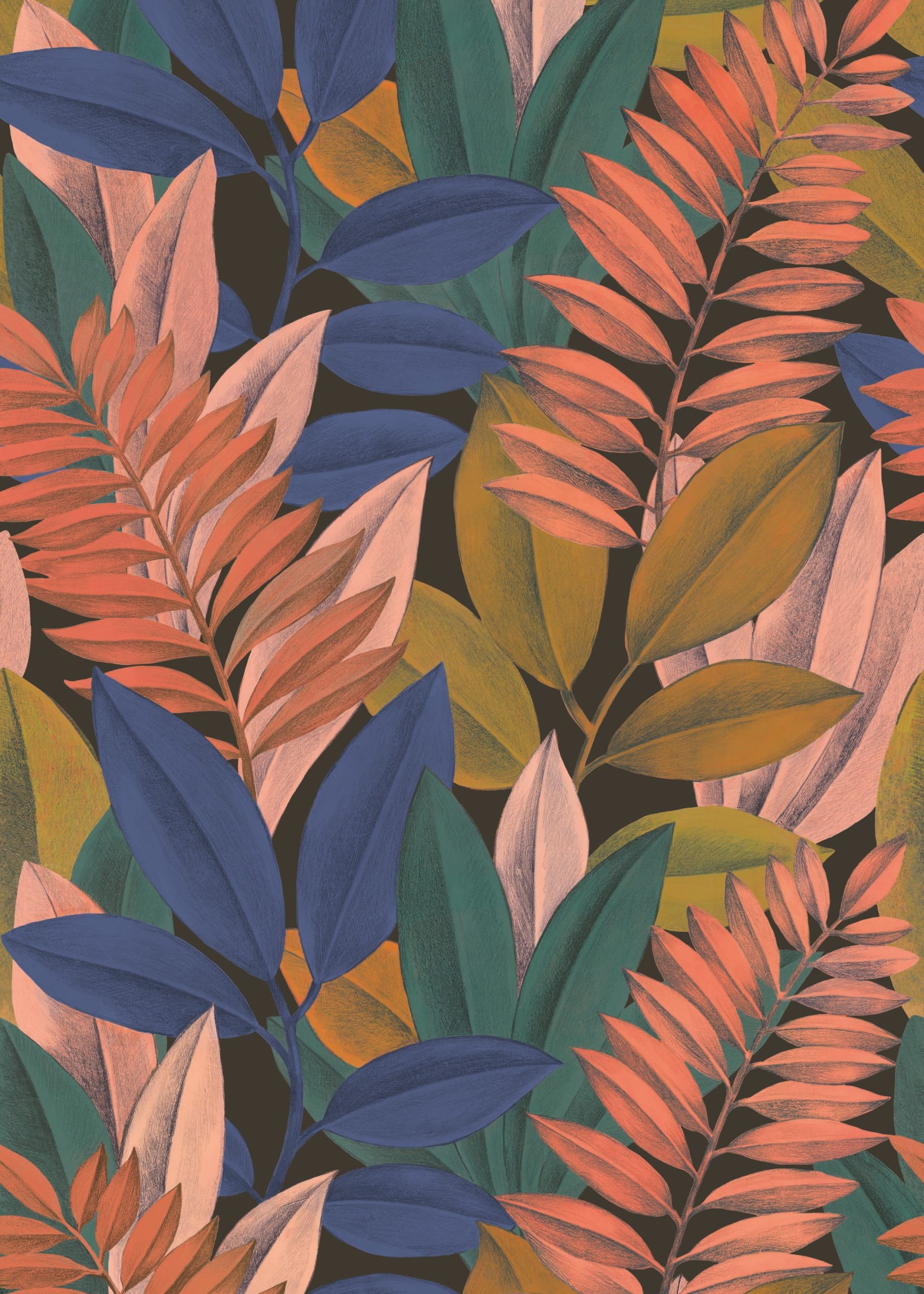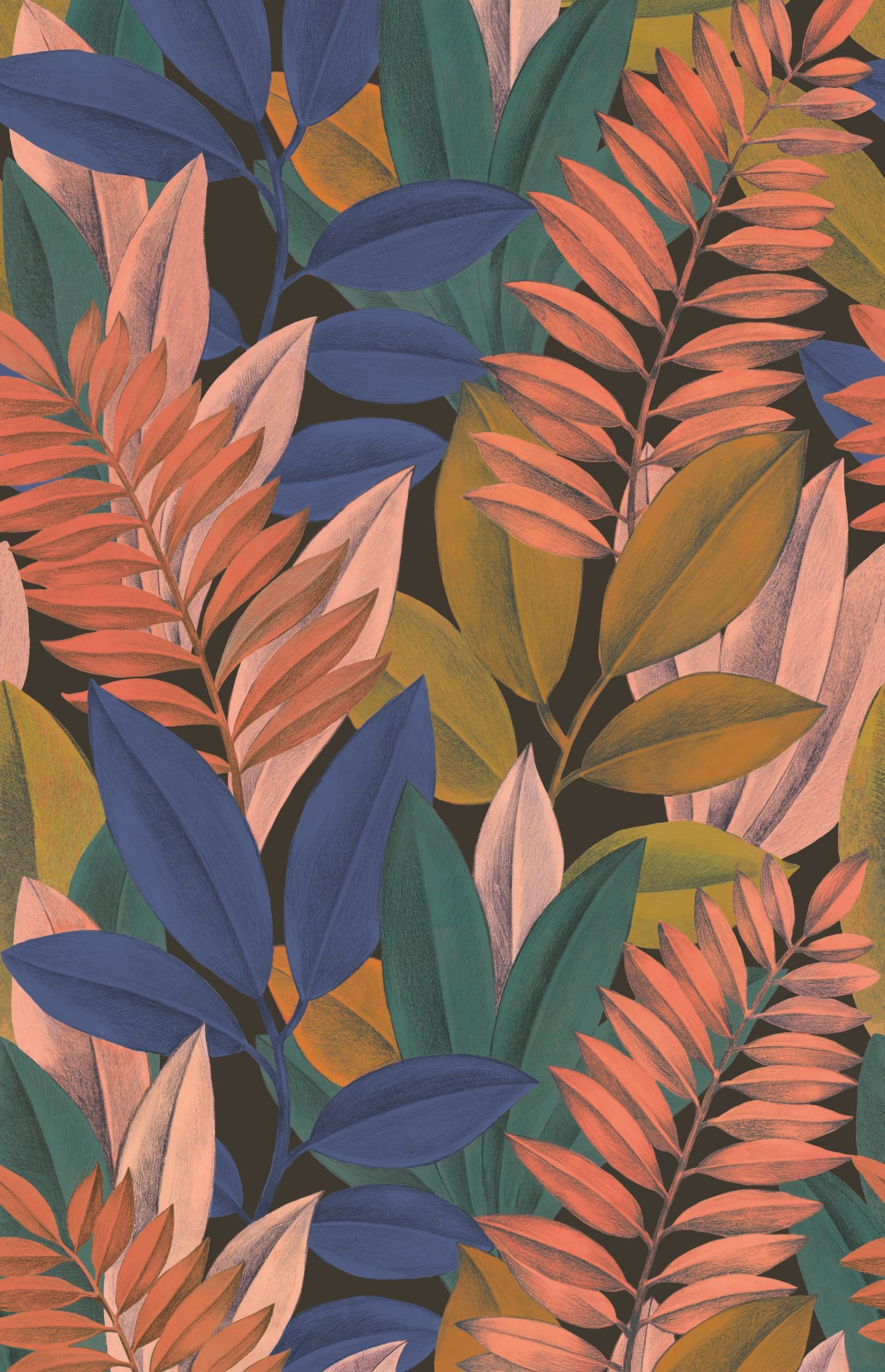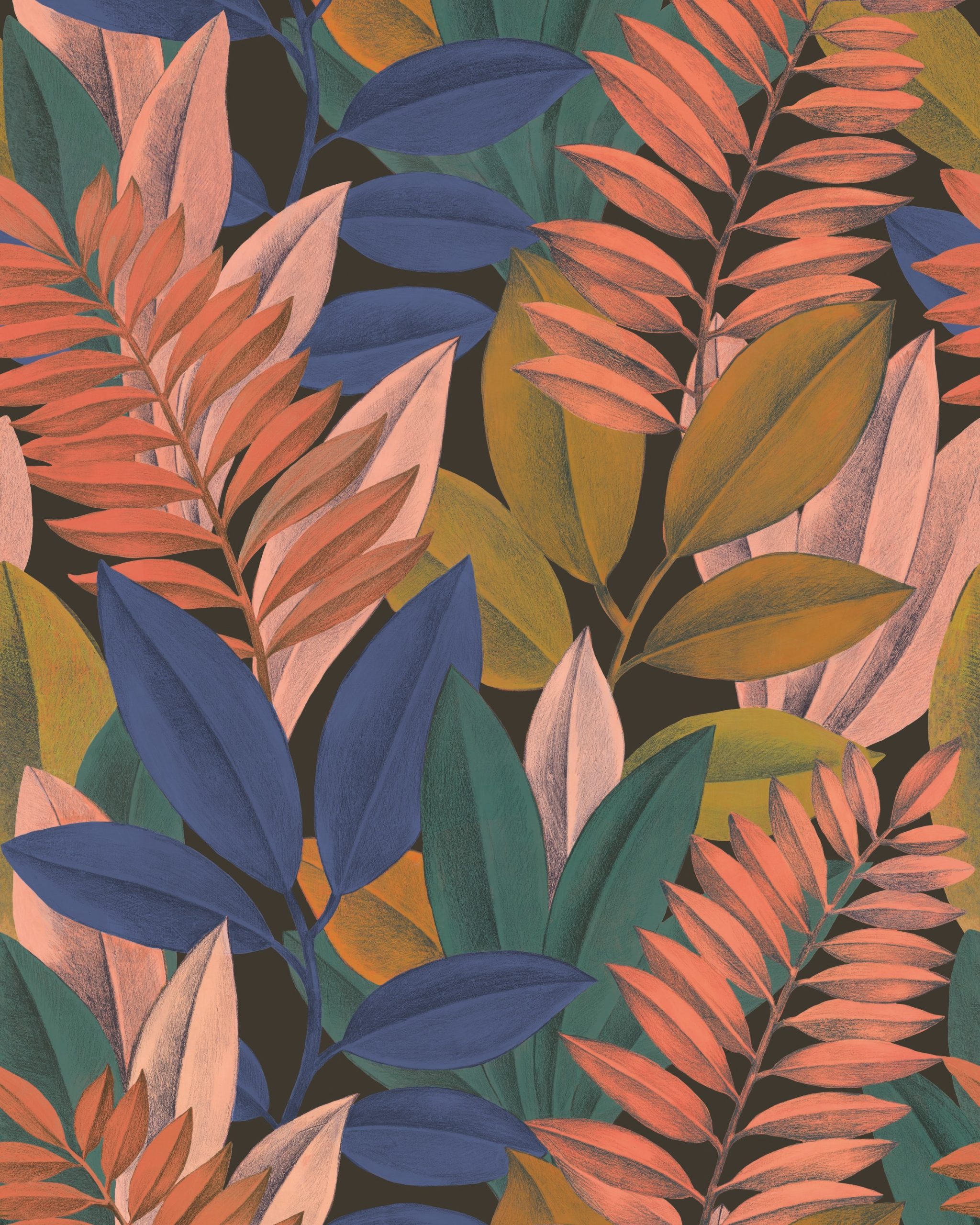 Trópusi levélmintás fotótapéta őszies színekben, mellyel látványos dekorációt teremthetsz otthonodban.