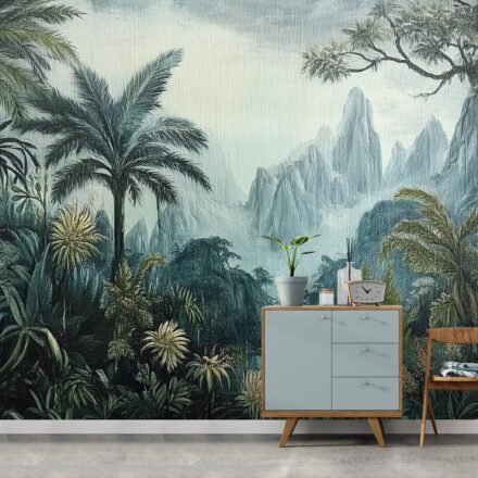 Trópusi pálmafás dzsungel fotótapéta – lépj be egy misztikus trópusi világba ezzel a különleges mintával. A zöld és kék árnyalatok, valamint a részletgazdag növények egzotikus, mégis elegáns légkört teremtenek otthonodban.