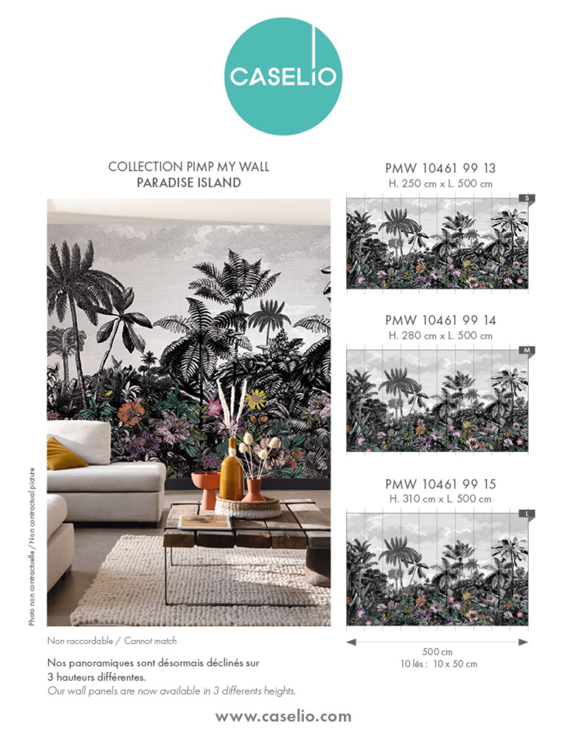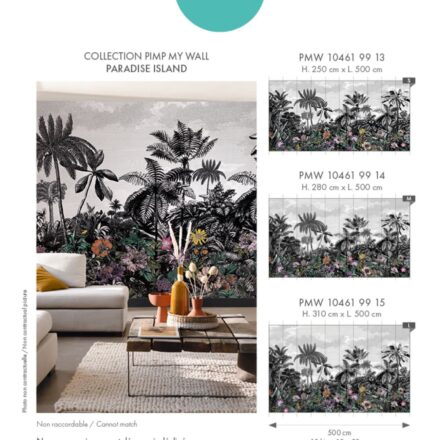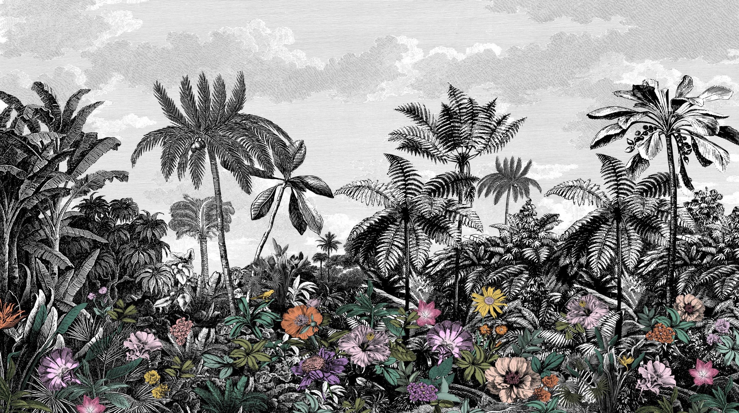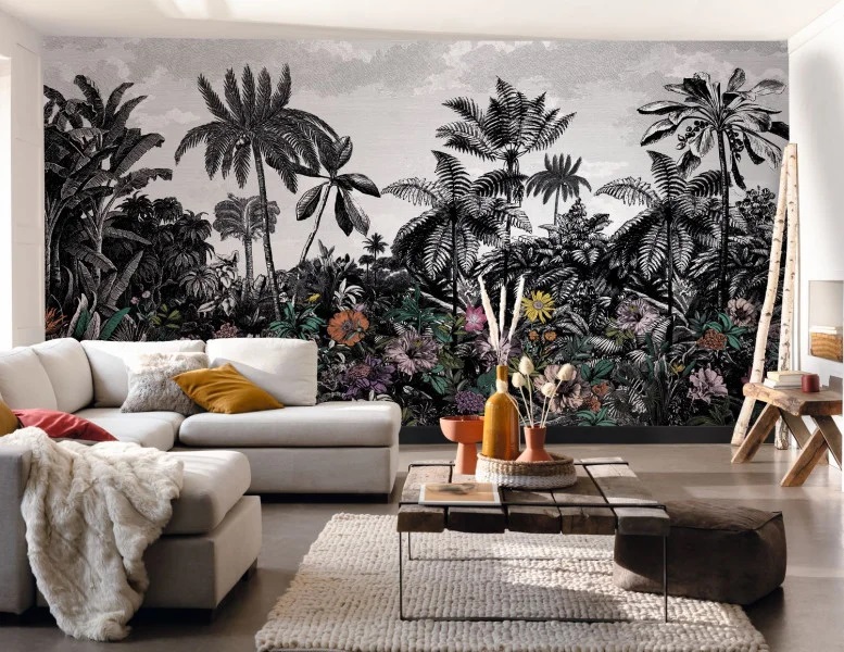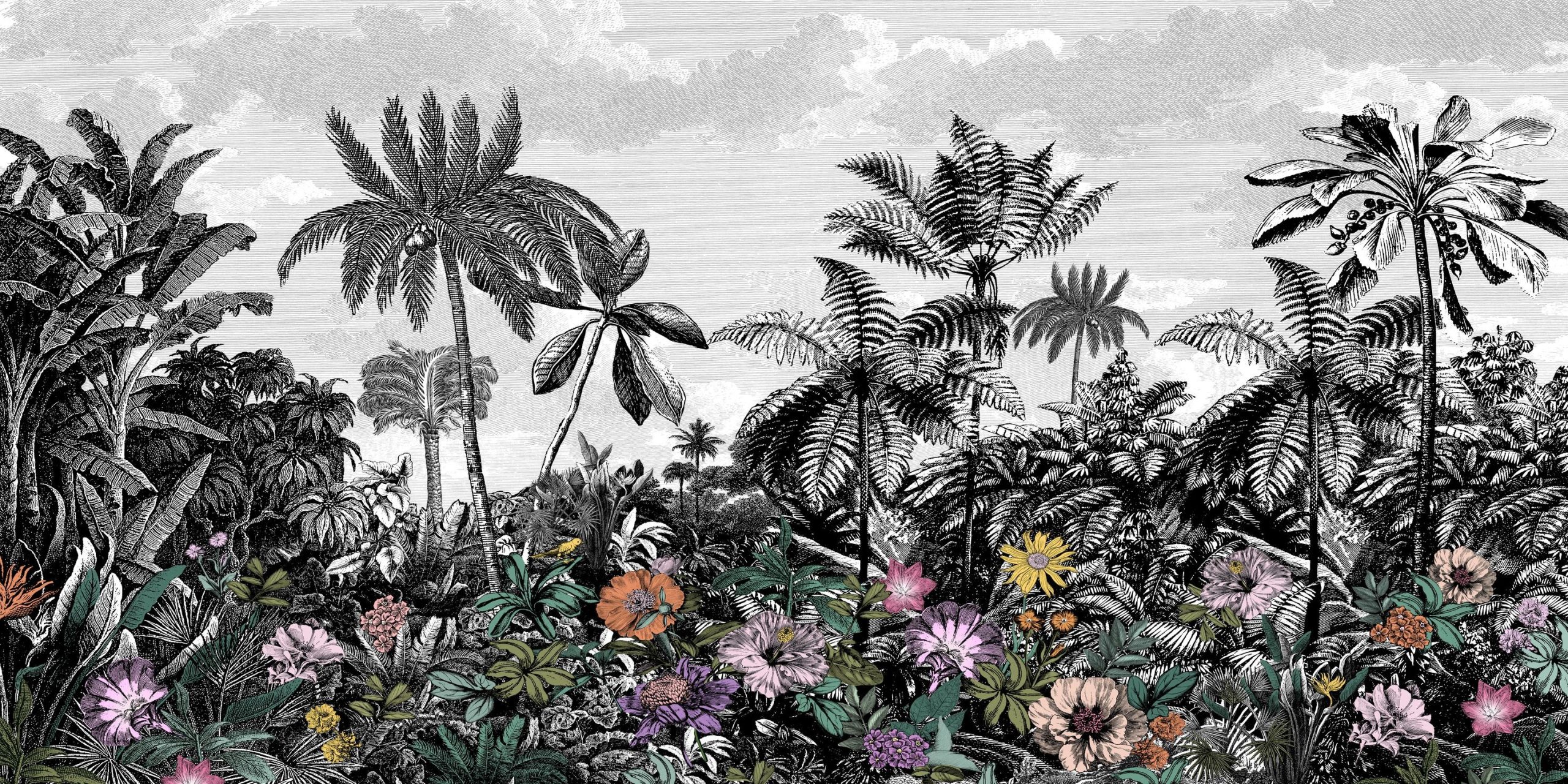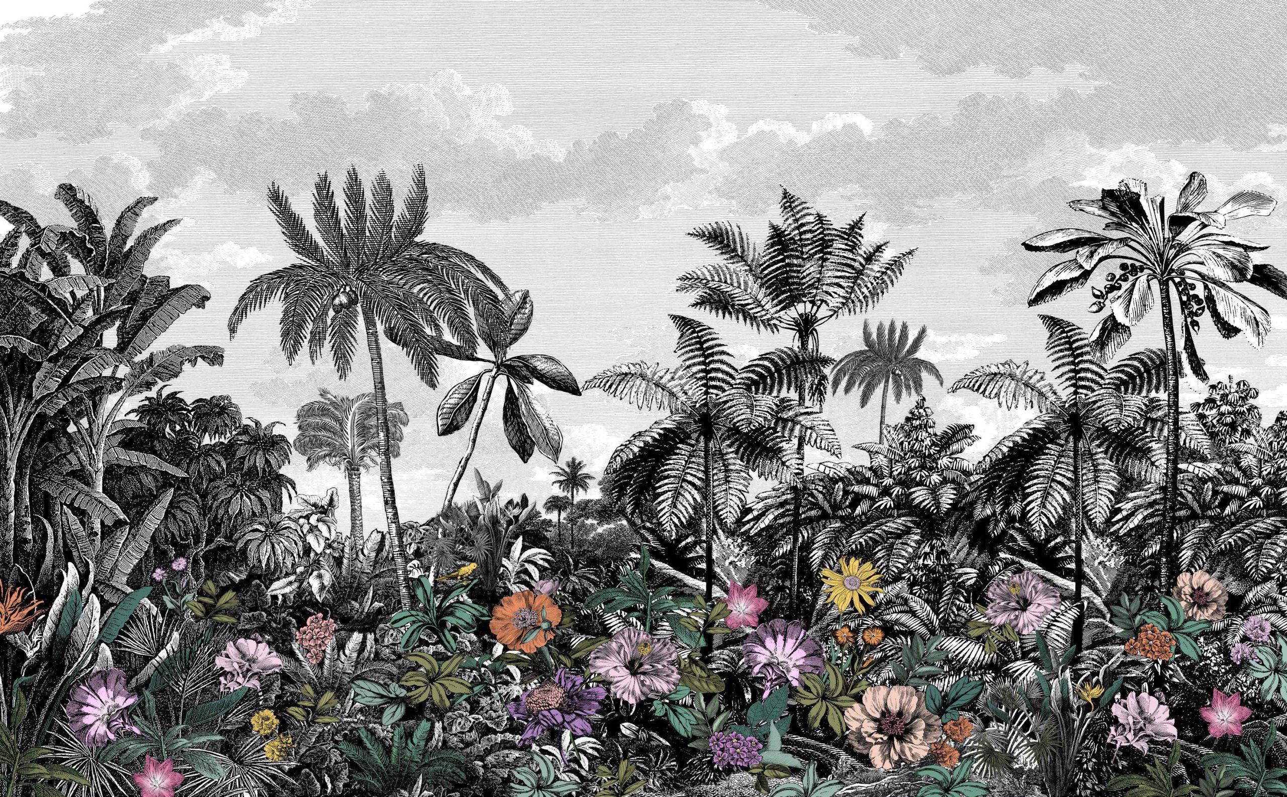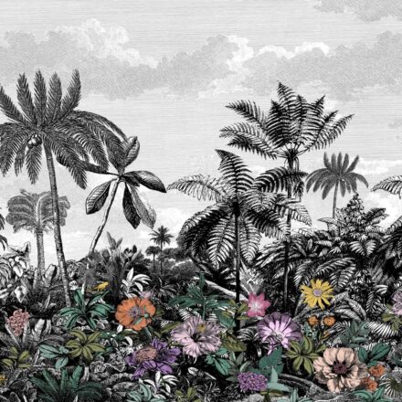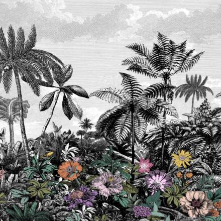 Trópusi tájkép fotótapéta, melynek fekete-fehér pálmafáit színpompás egzotikus virágok teszik különlegessé. Vigyél egy csipet egzotikumot otthonod atmoszférájába gyönyörű fotótapétánkkal!
