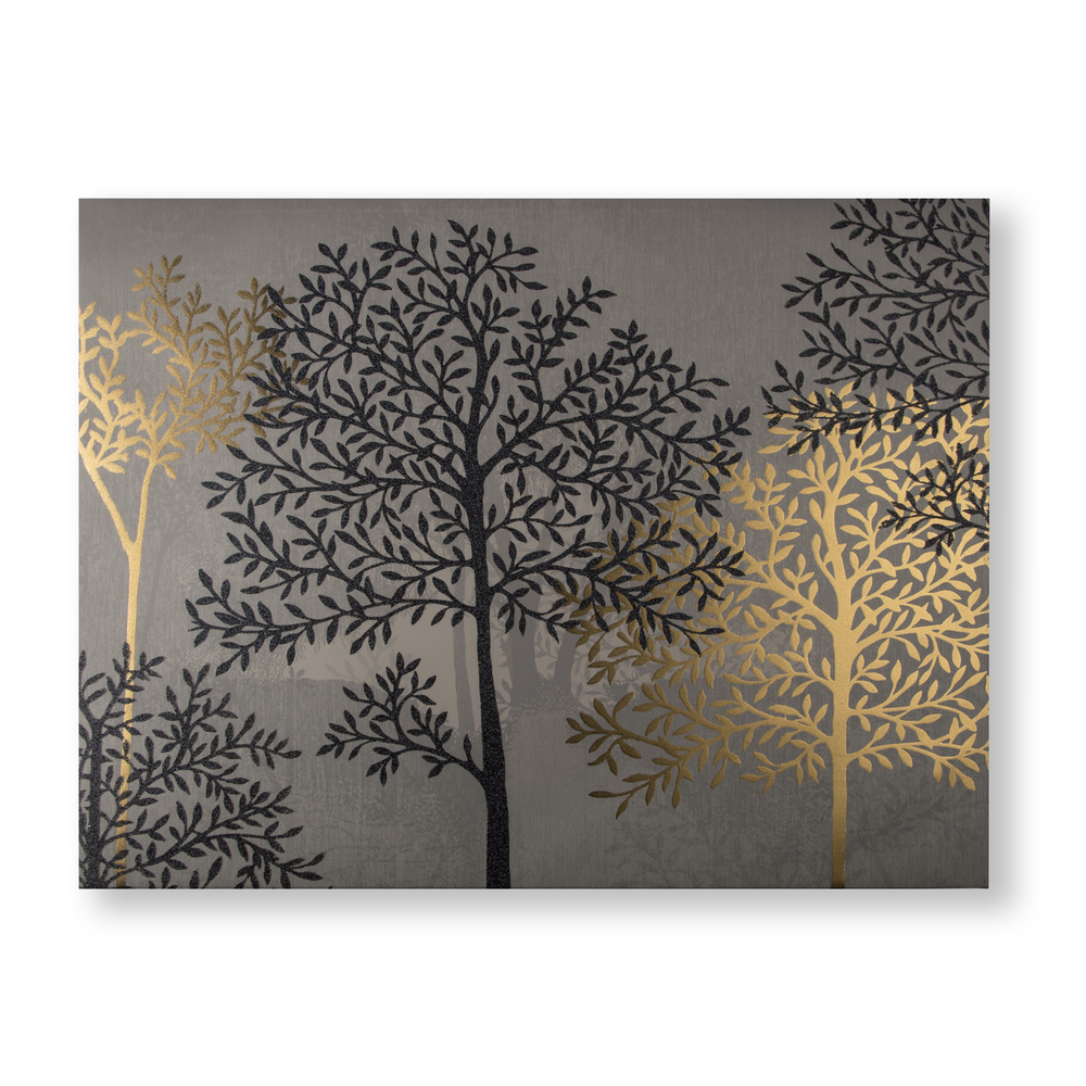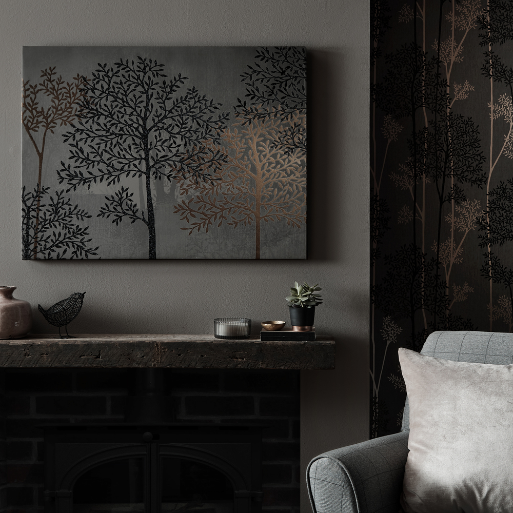 Vászonkép fa ábrázolással, melynek natúr barna alapján fényes fekete és bronz színekben emelkednek ki a fa minták. Otthonos atmoszférát, és különleges eleganciát áraszt az enteriőrben.