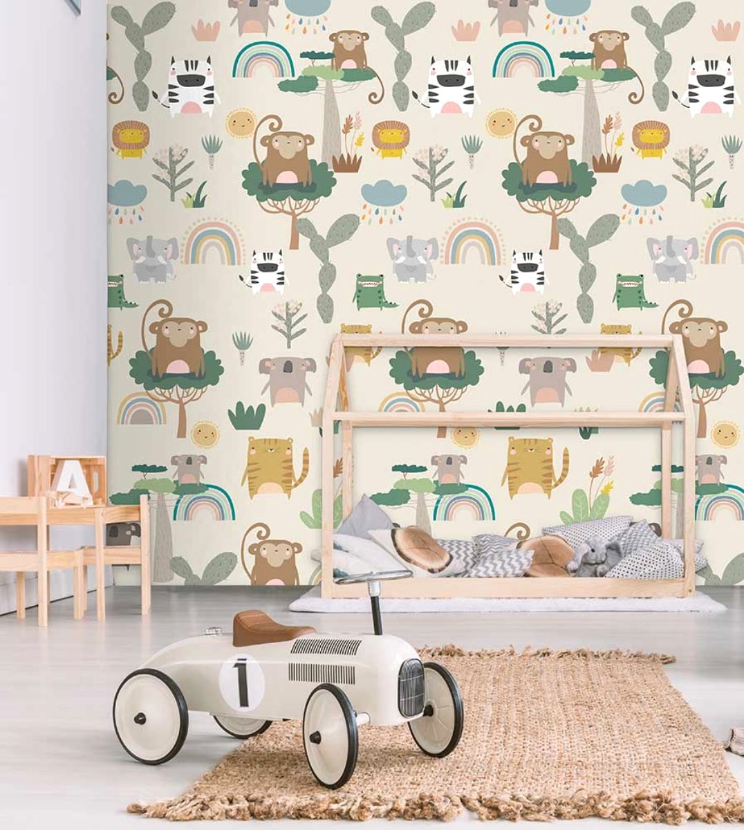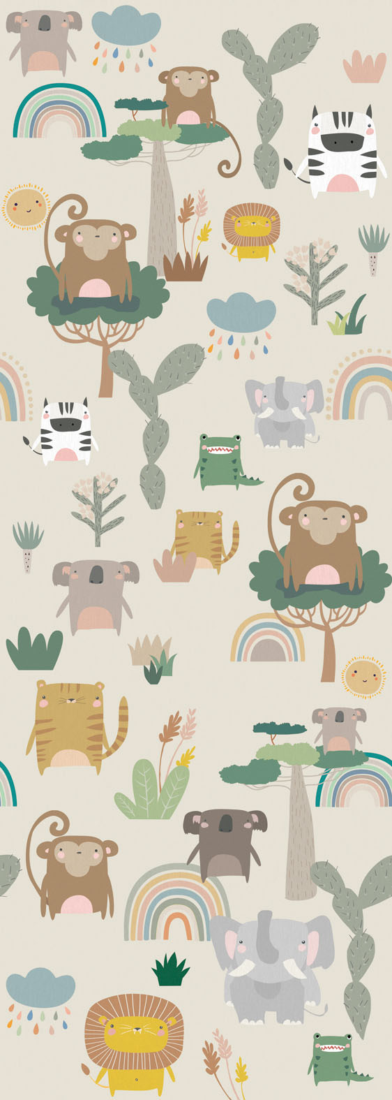 A dzsungelek vidám, játékos hangulatát idézik a majmokkal, elefántokkal dekorált tapéta. Az állatok gyermeki rajzra emlékeztető formája otthonos légkört teremt a gyerekszobában.