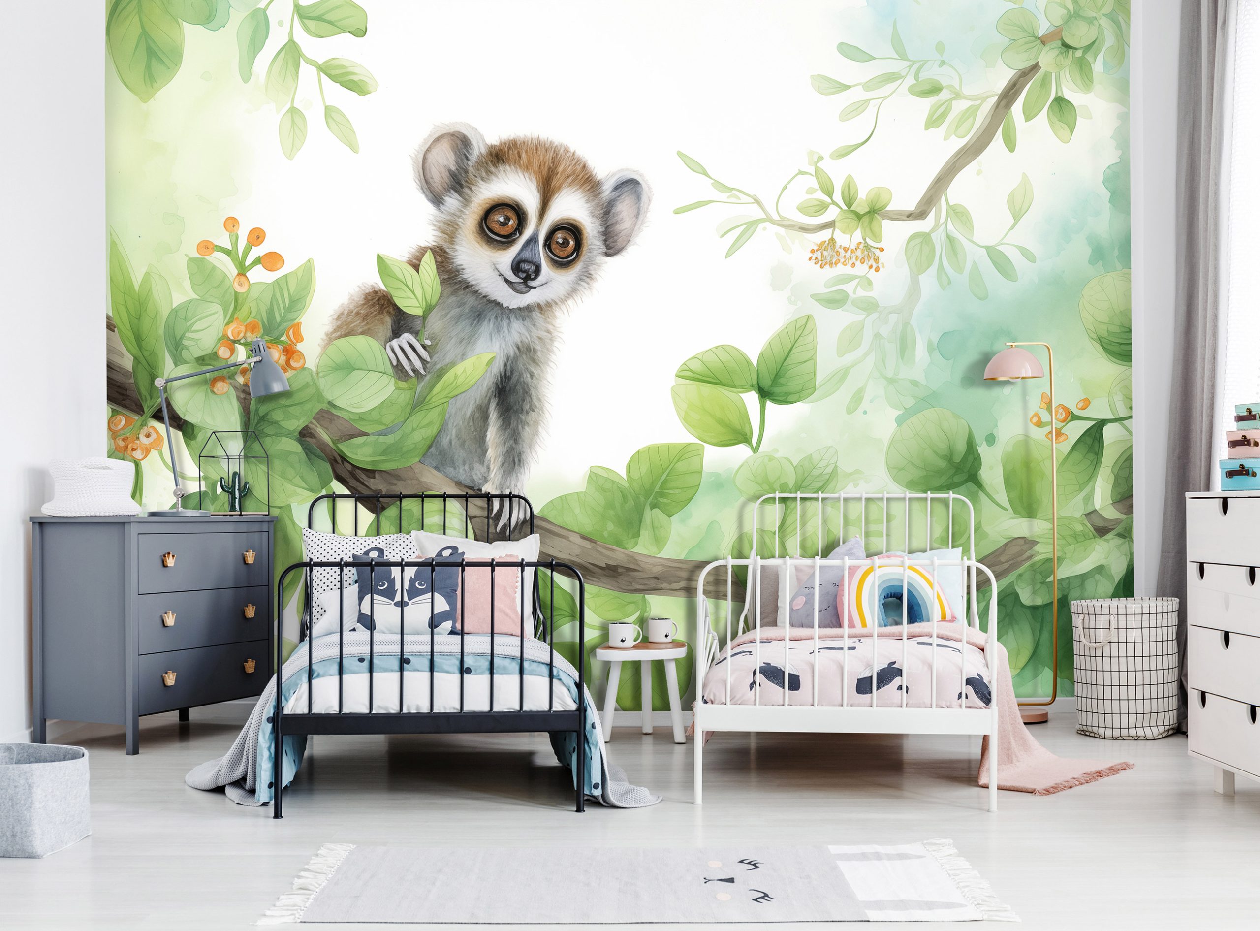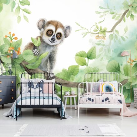 Vidám, mosolygós maki majmok néznek le ránk a tapétáról és teremtenek otthonos hangulatot a gyerekszobában.