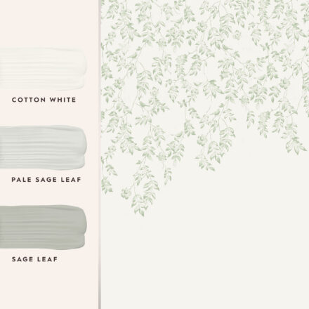 Laura Ashley fali panelje divatos, felülről leomló levelek mintáját dolgozza fel, melyet az énekes madarak tesznek különlegessé.