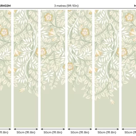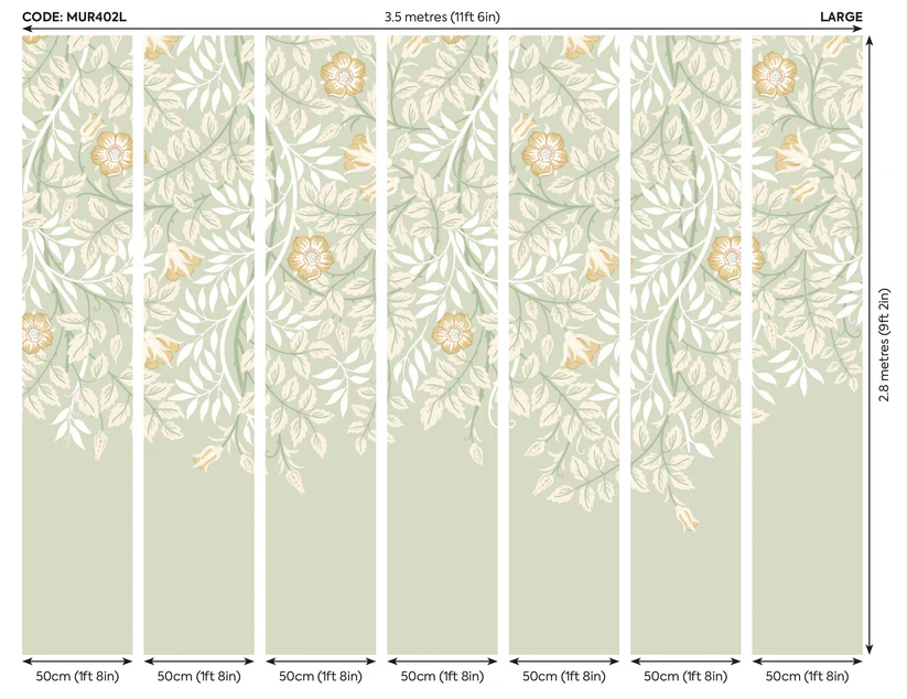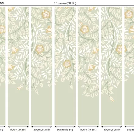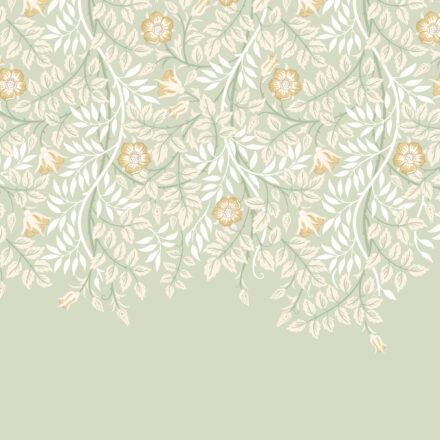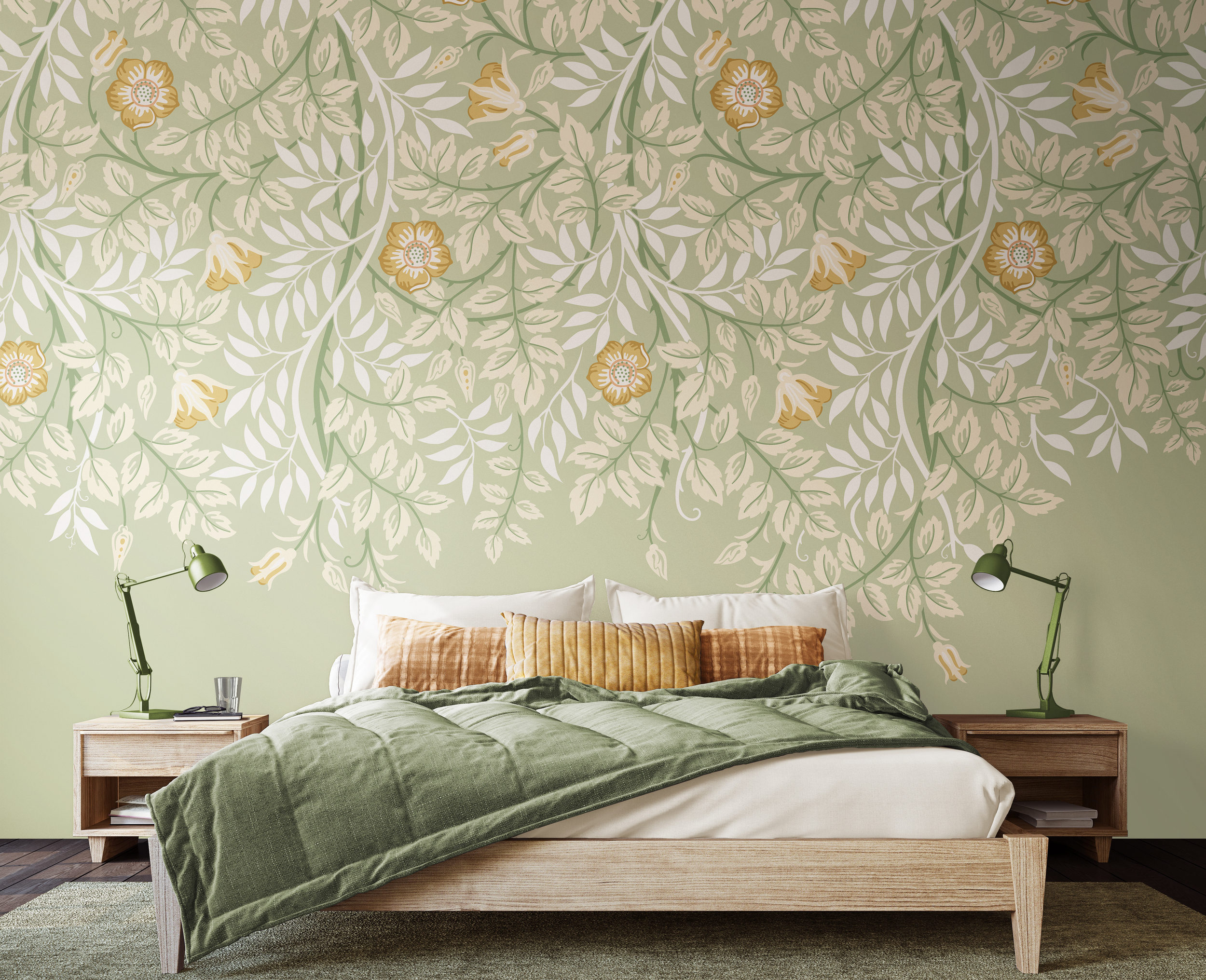 Világos zöld romantikus fotótapéta leomló virágokkal, mely tökéletes dekoráció ágy vagy kanapé mögötti falra, hogy egyedi atmoszférát teremtsünk otthonunkban.
