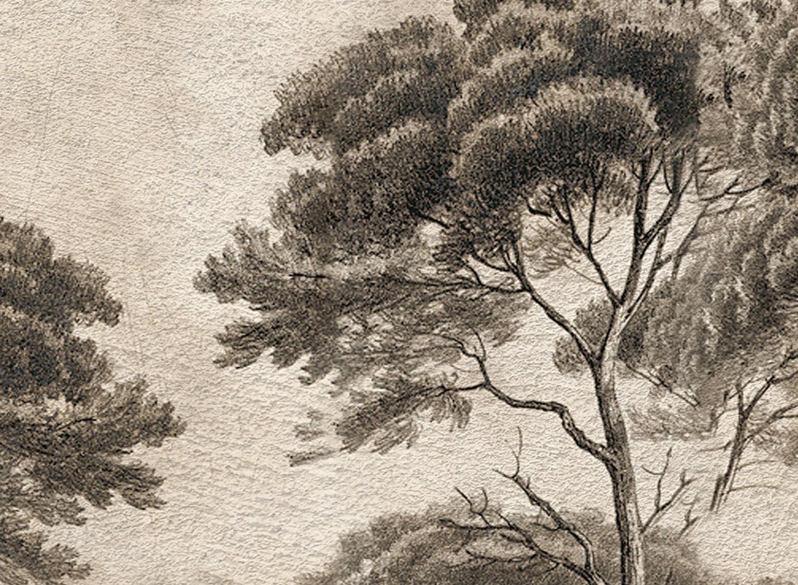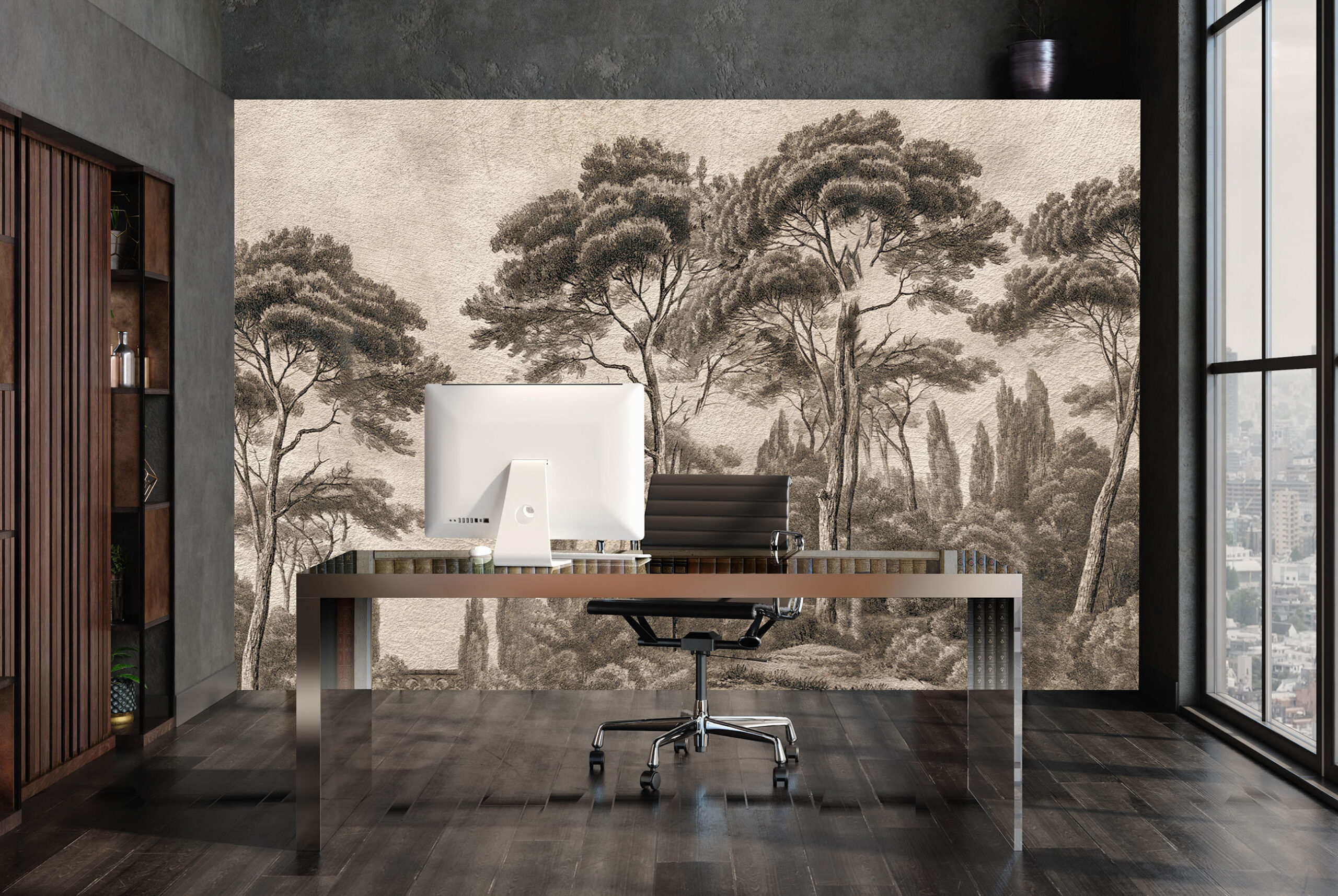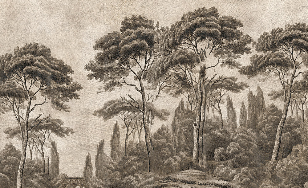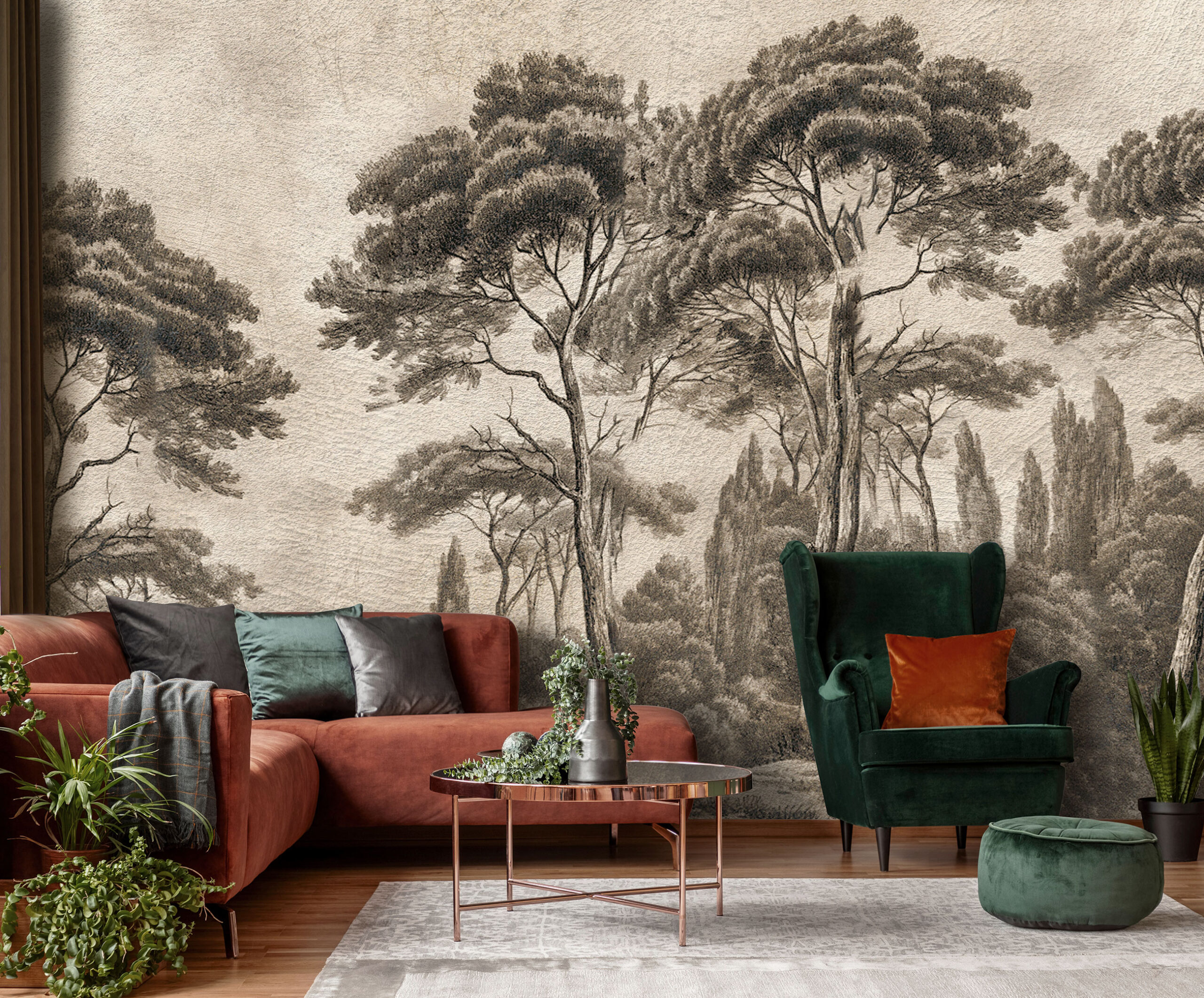 Vintage fotótapéta fa mintás tájképpel, mely otthonos melegséget áraszt az enteriőrben. A képen látható mandulafenyők a mediterrán tájak hangulatát idézik.