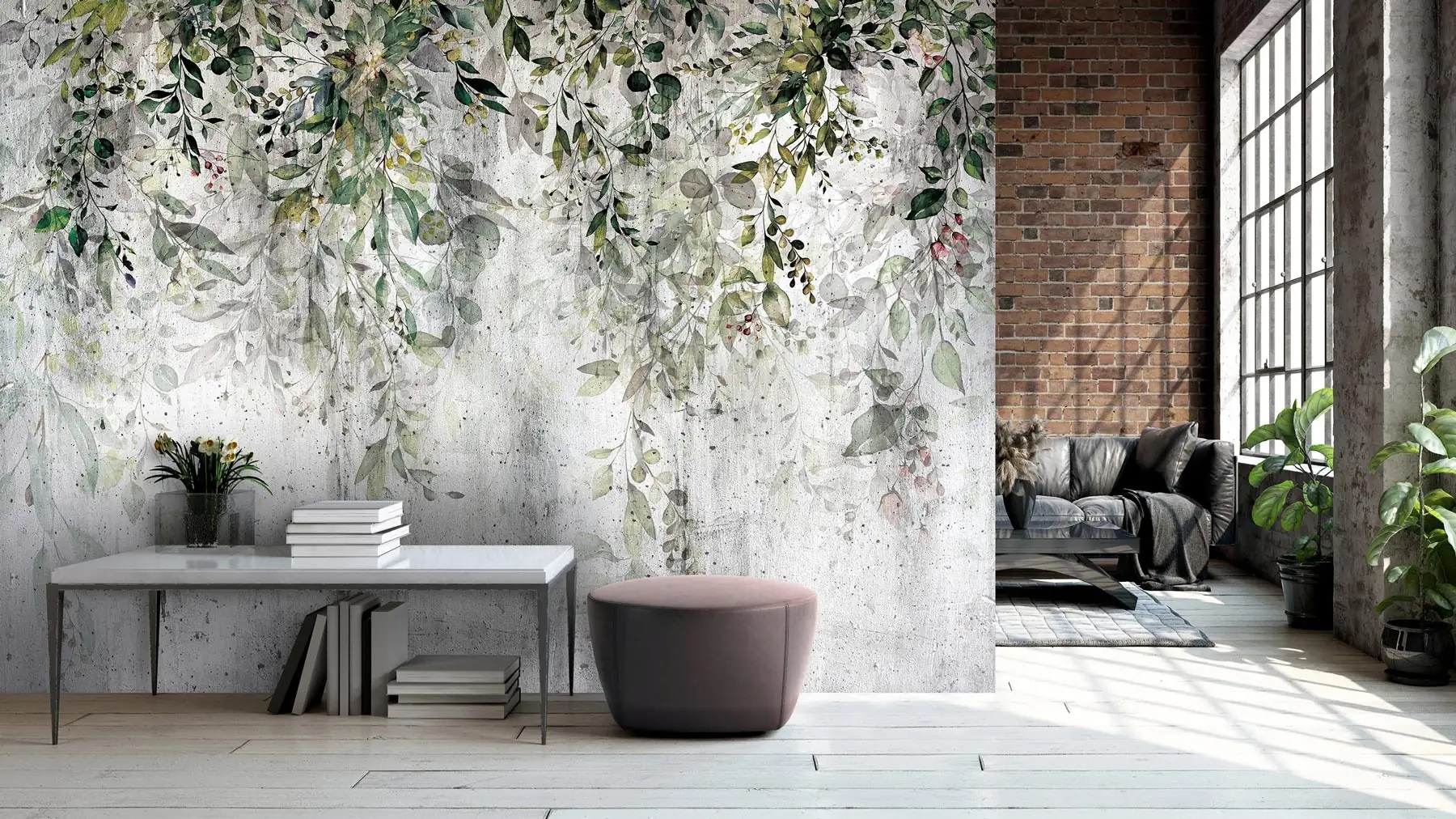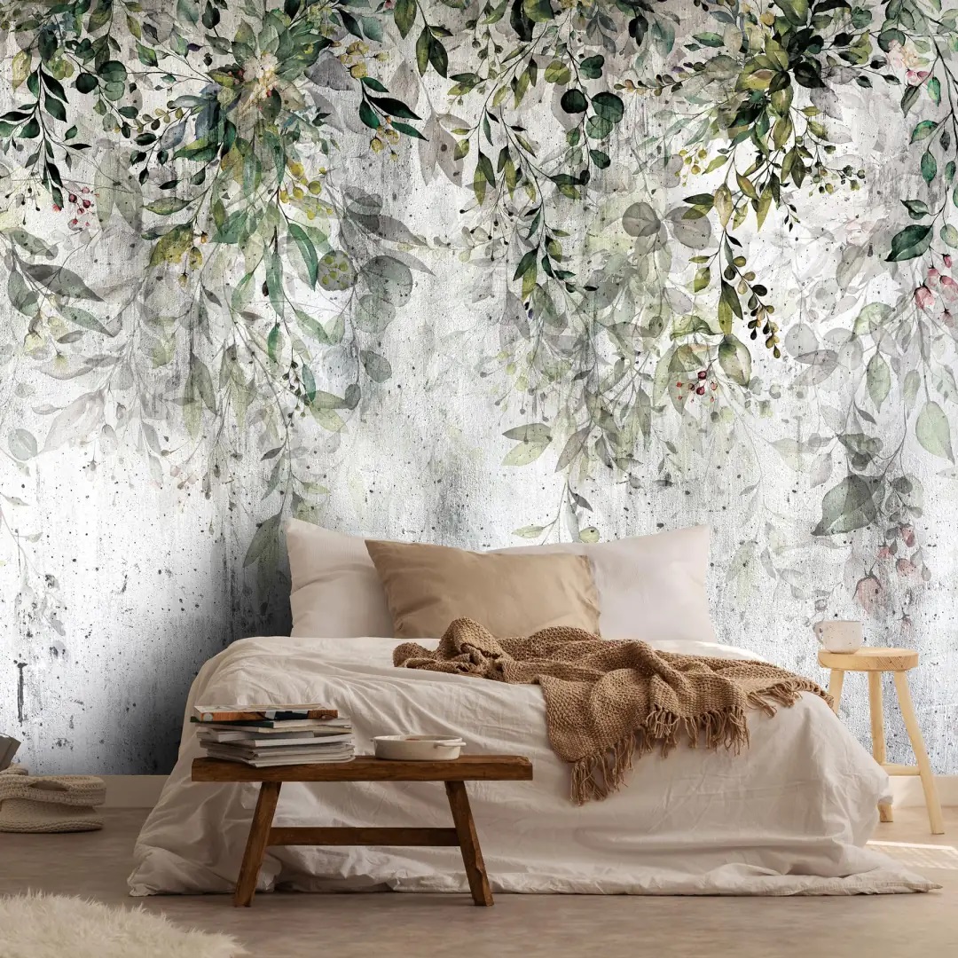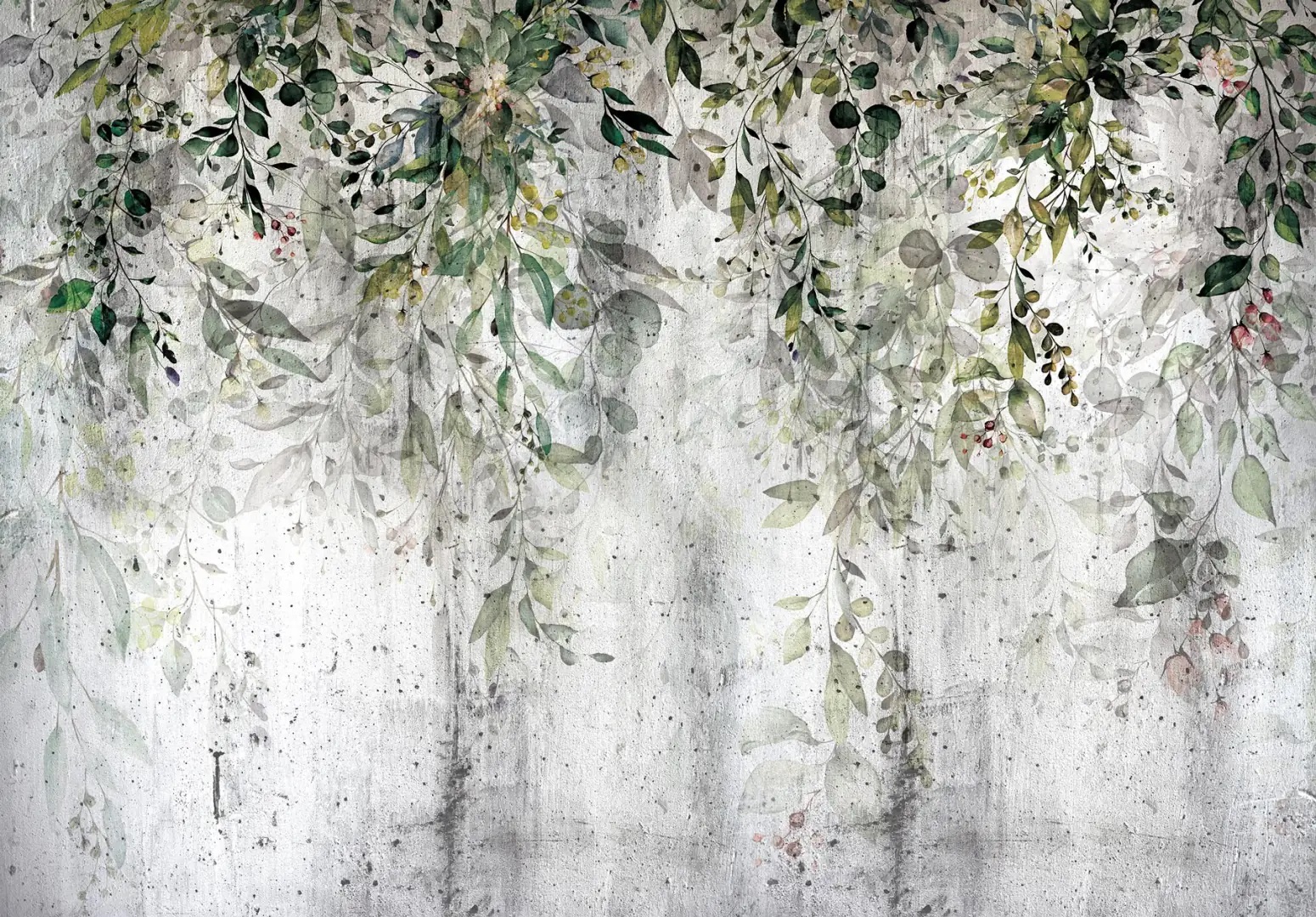 Trendi fotótapéta mintánk alapját betont imitáló fotó alkotja, melyen a leomló levélminta különleges, egyedi atmoszférát teremt.