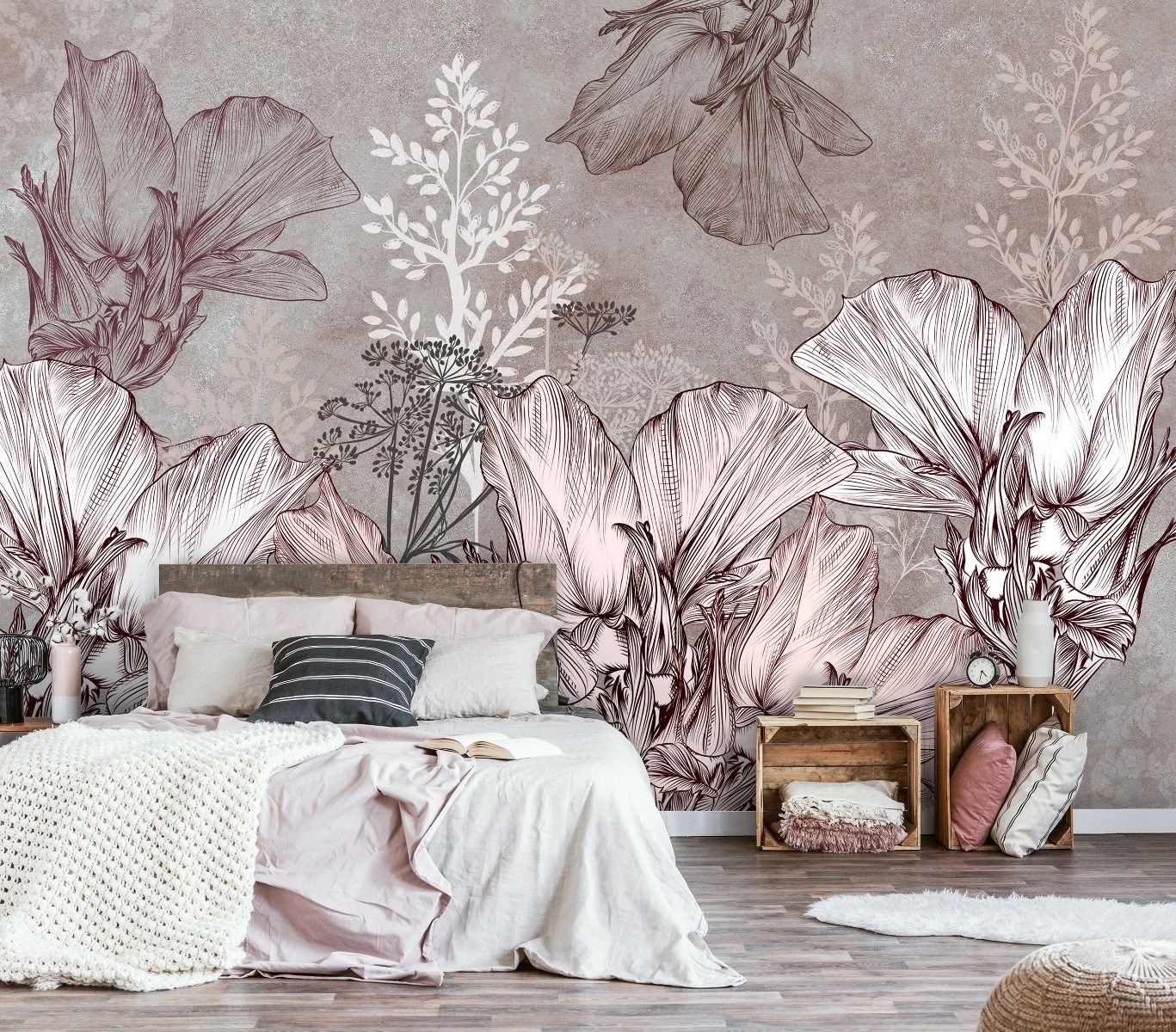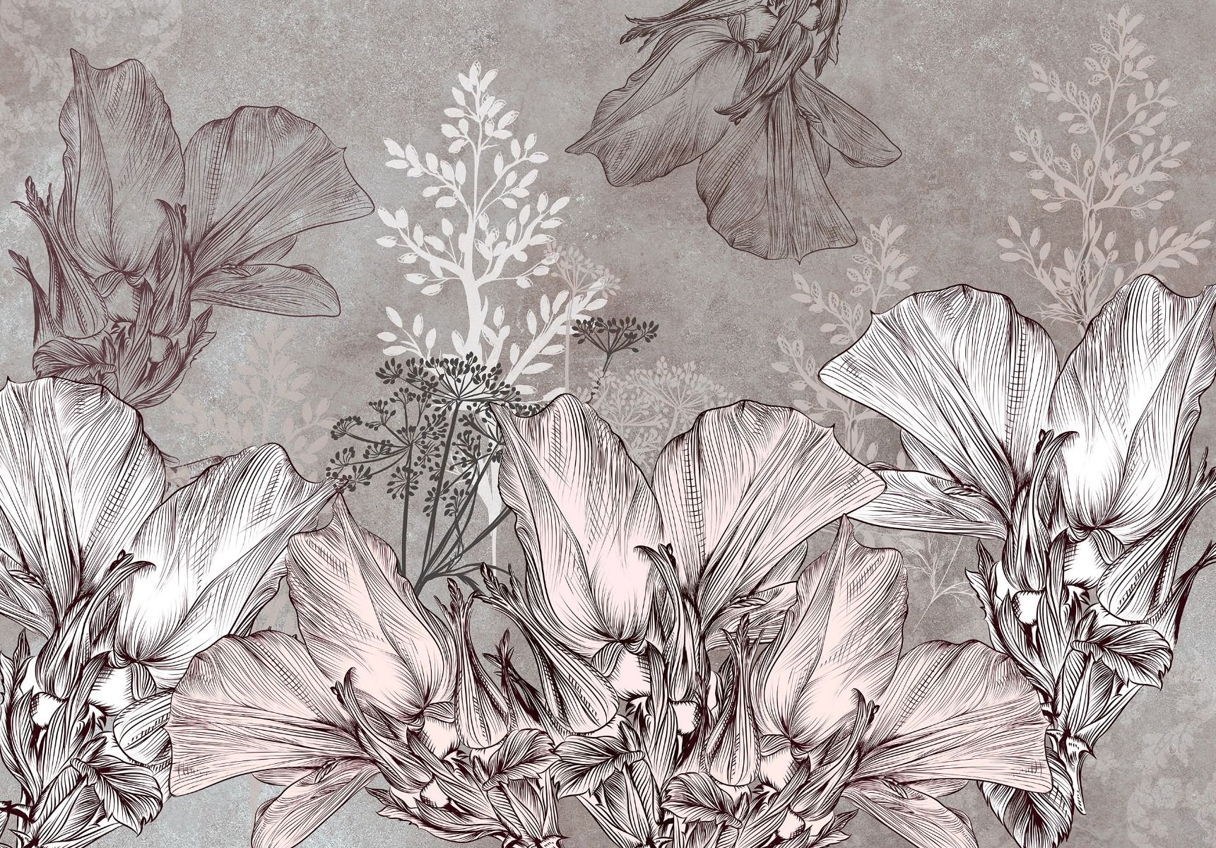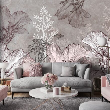 Vintage atmoszférát teremtő virágos fotótapéta, melynek finom rajzolata rózsaszín – szürke árnyalatban jelennek meg.
