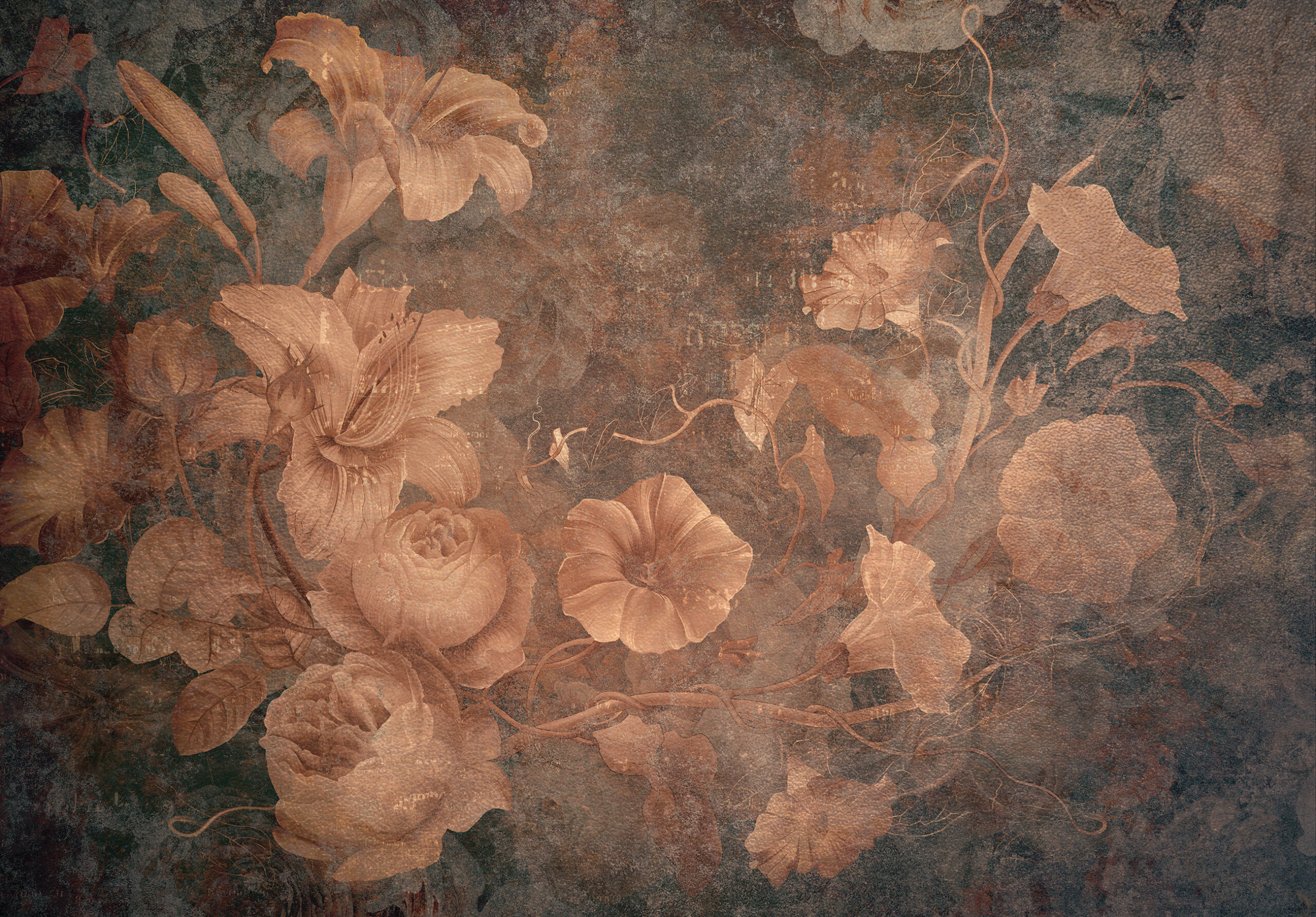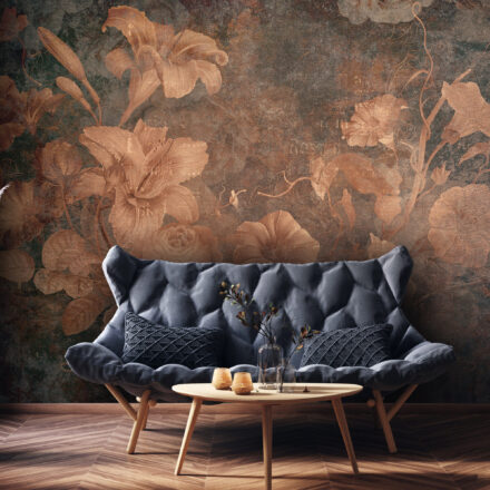 Nagyméretű virágos fotótapéta, melynek antikolt felületet imitáló alapja vintage hangulatot kölcsönöz a tapétának.