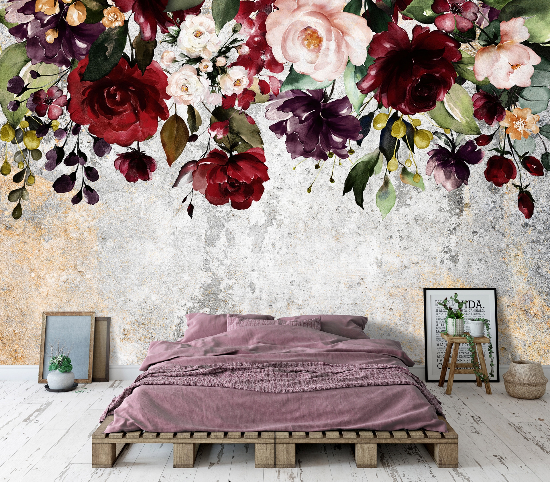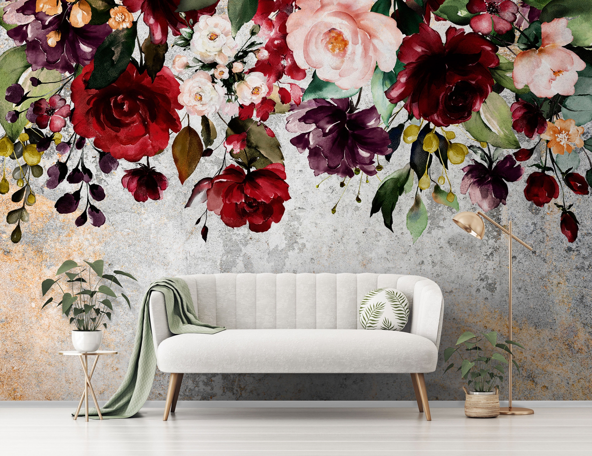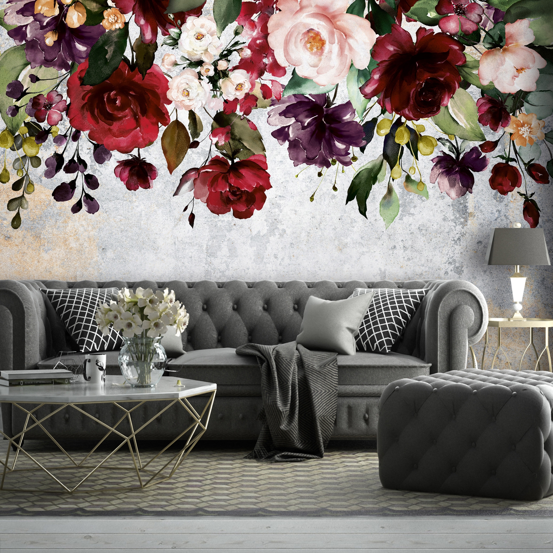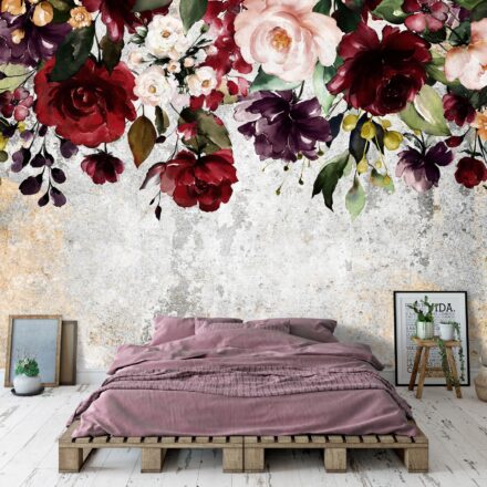 Vintage stílusú, nagyméretű rózsák dekorálják a fotótapétát. A felülről leomló virágminták trendi fali dekorációt teremtenek otthonunkban, tökéletes választás kanapé, ágy mögötti falra.