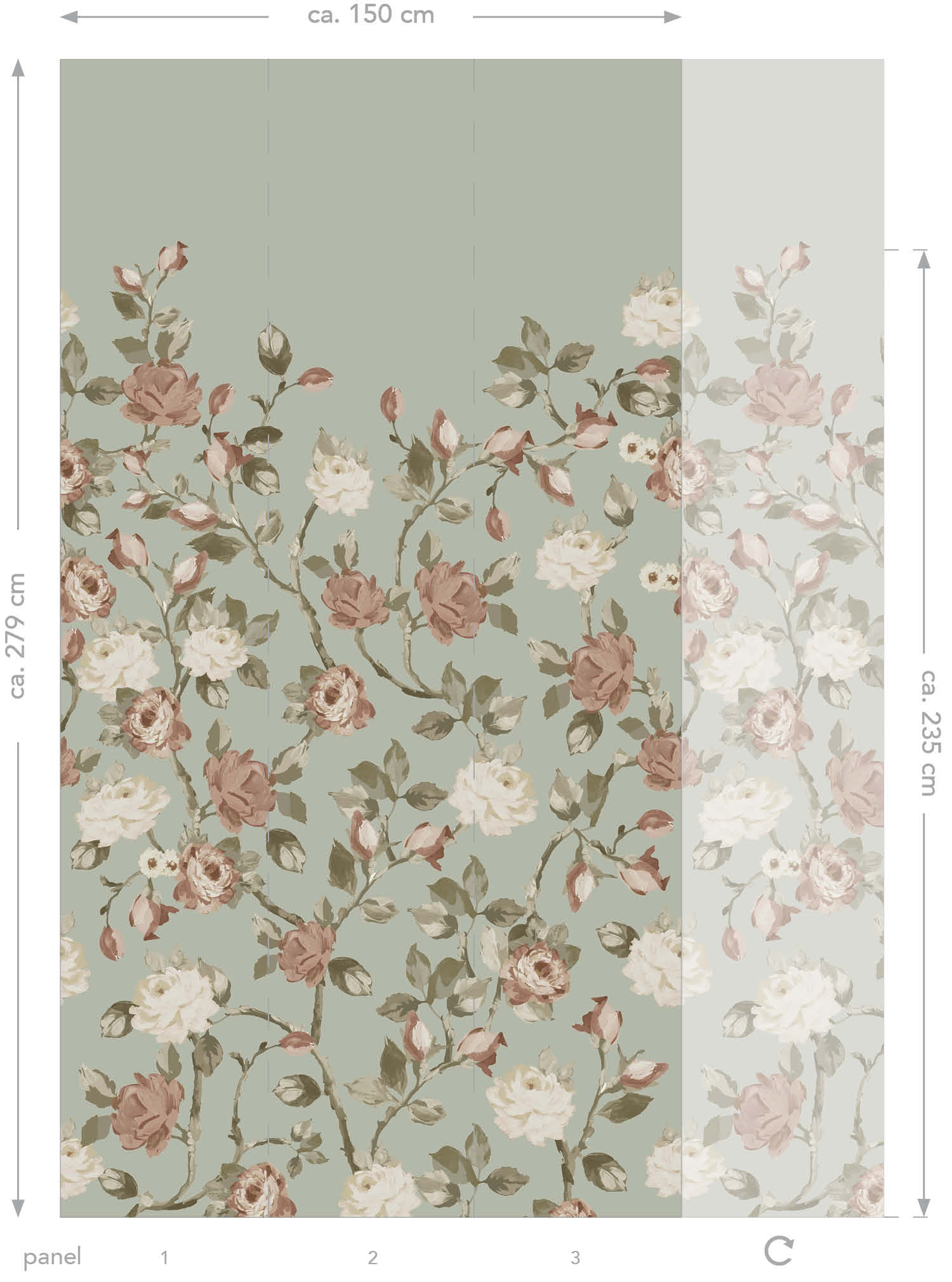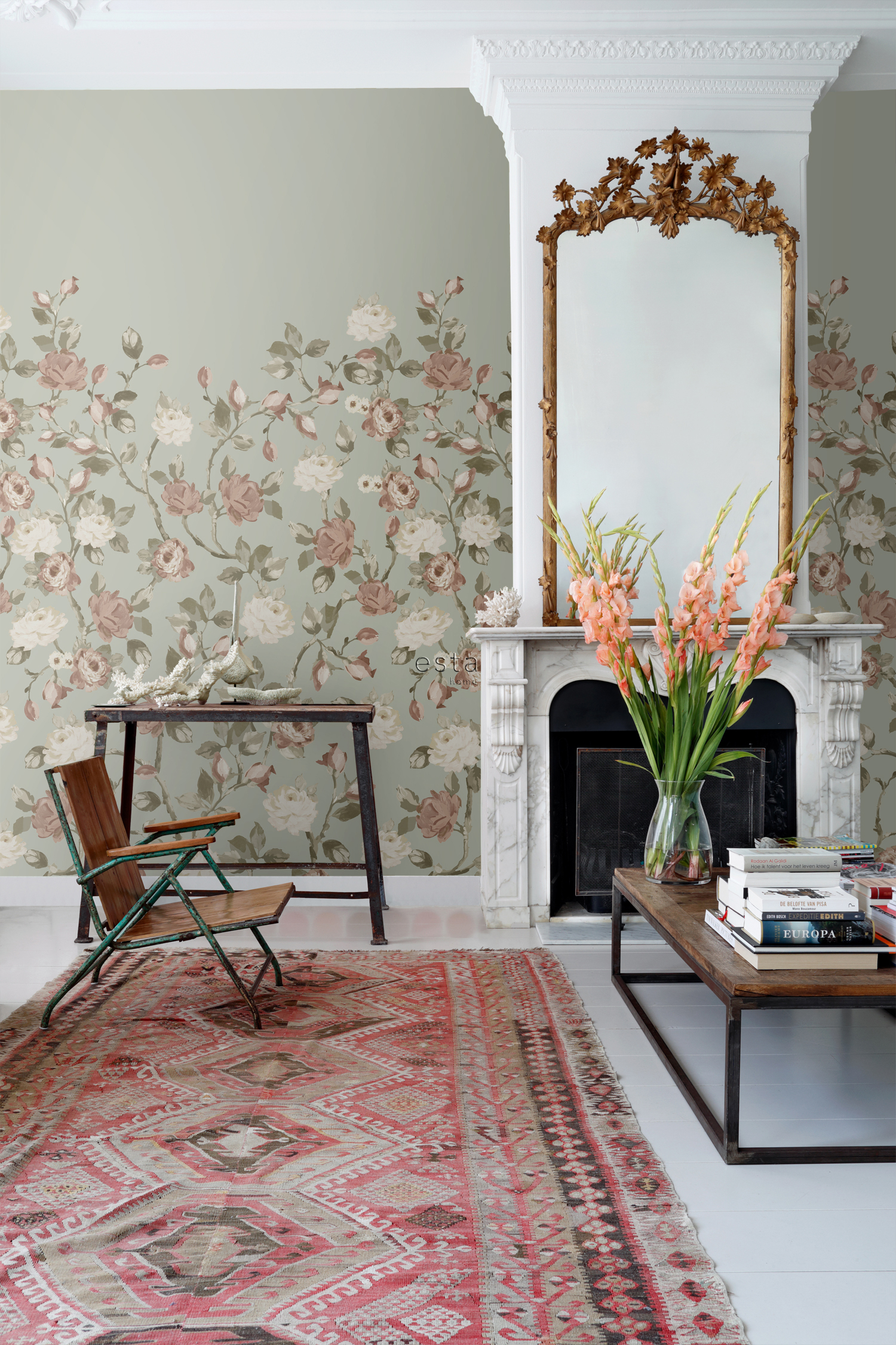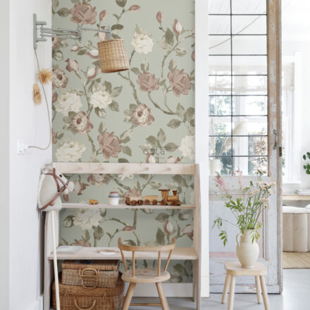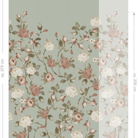 Vintage hangulatot keltő fotótapéta, melynek szürkés zöld alapszínéből emelkednek ki a nagyméretű rózsavirágok.