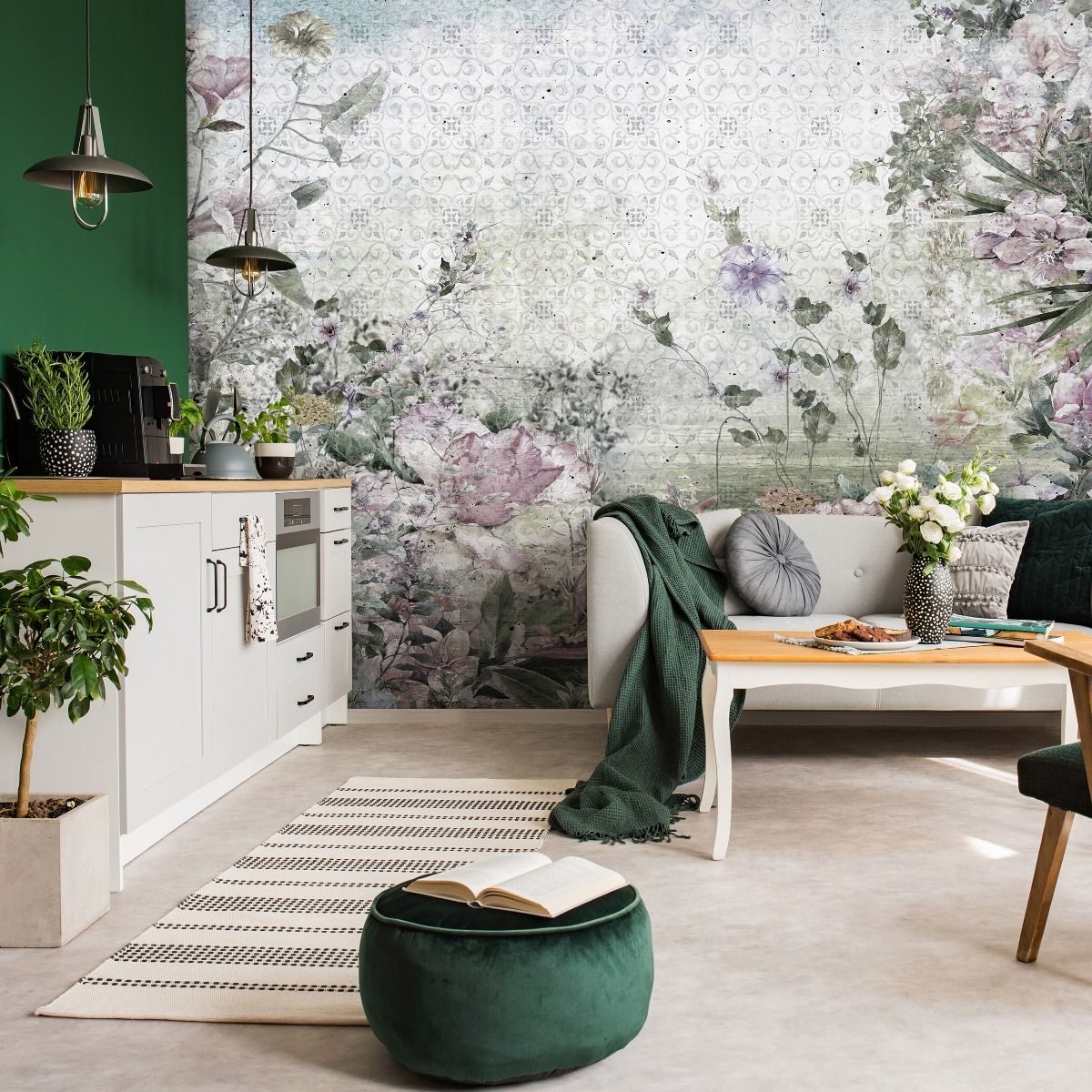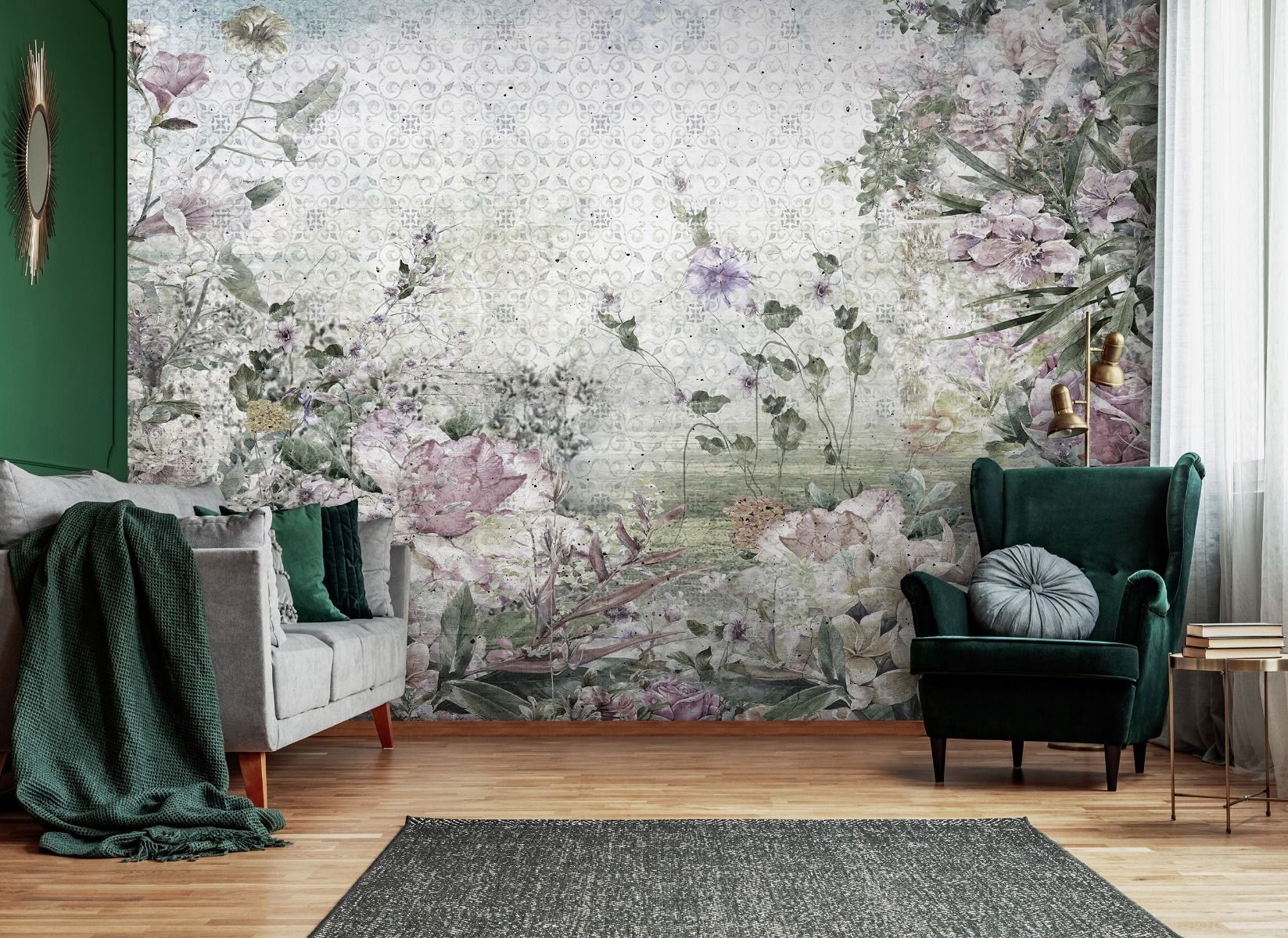 Vintage stílusú fotótapéta rózsaszín virágokkal, melynek üde, friss színei a tavaszt hozza el az enteriőrbe.