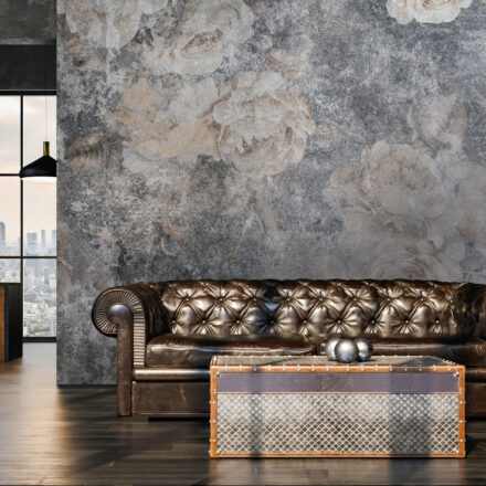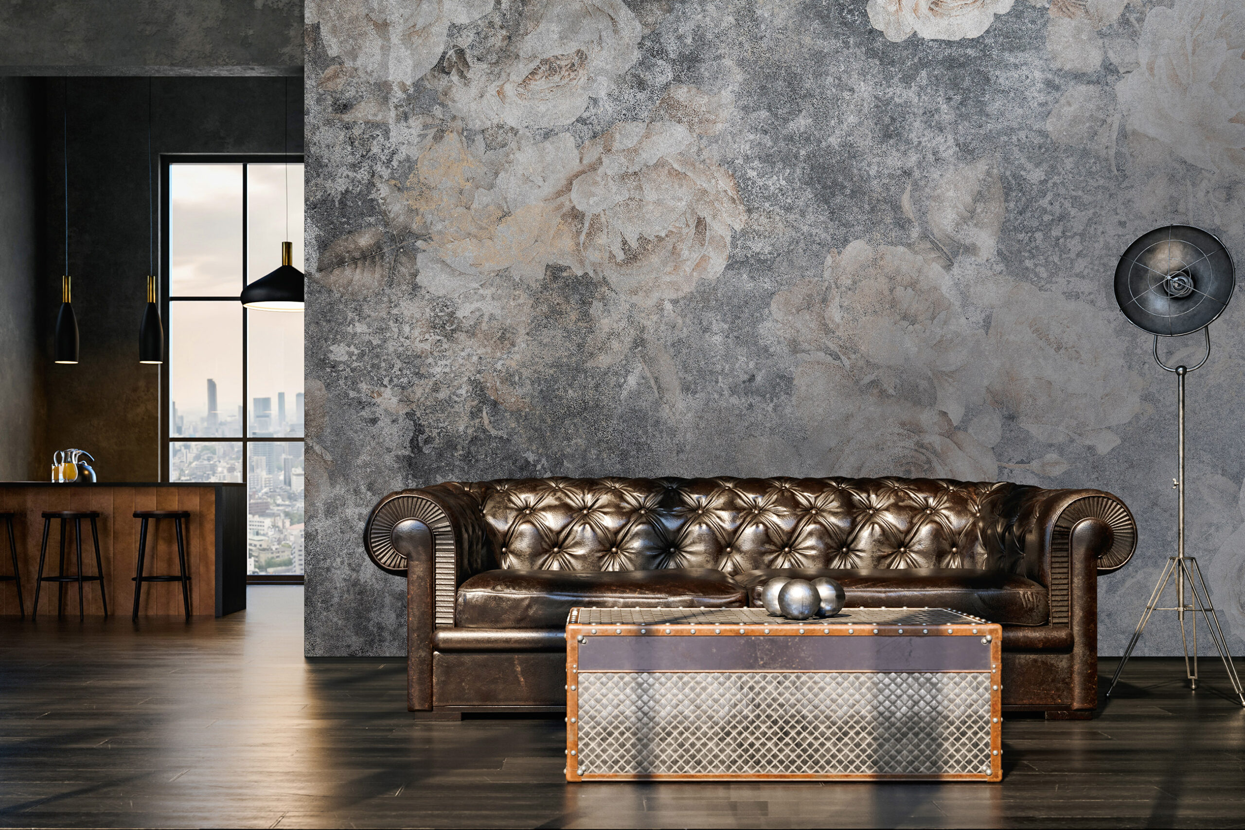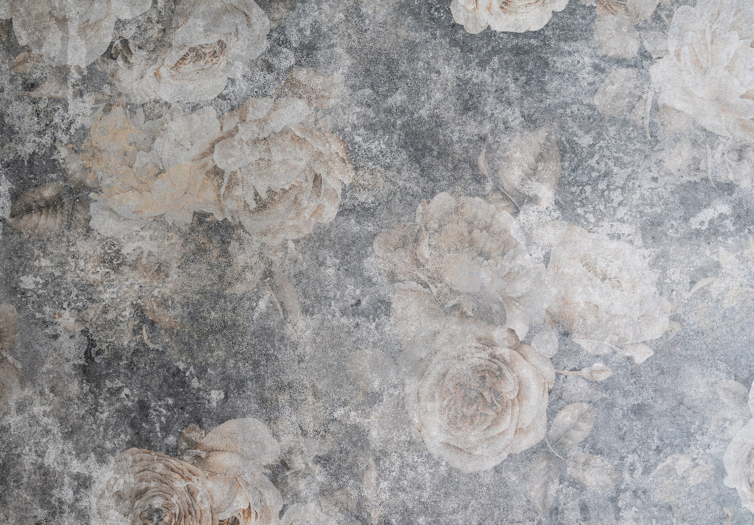A vintage stílus kedvelőinek ajánljuk a fotótapétát, melyen a rusztikus hatású falon jelennek meg halvány körvonallal a rózsavirágok.