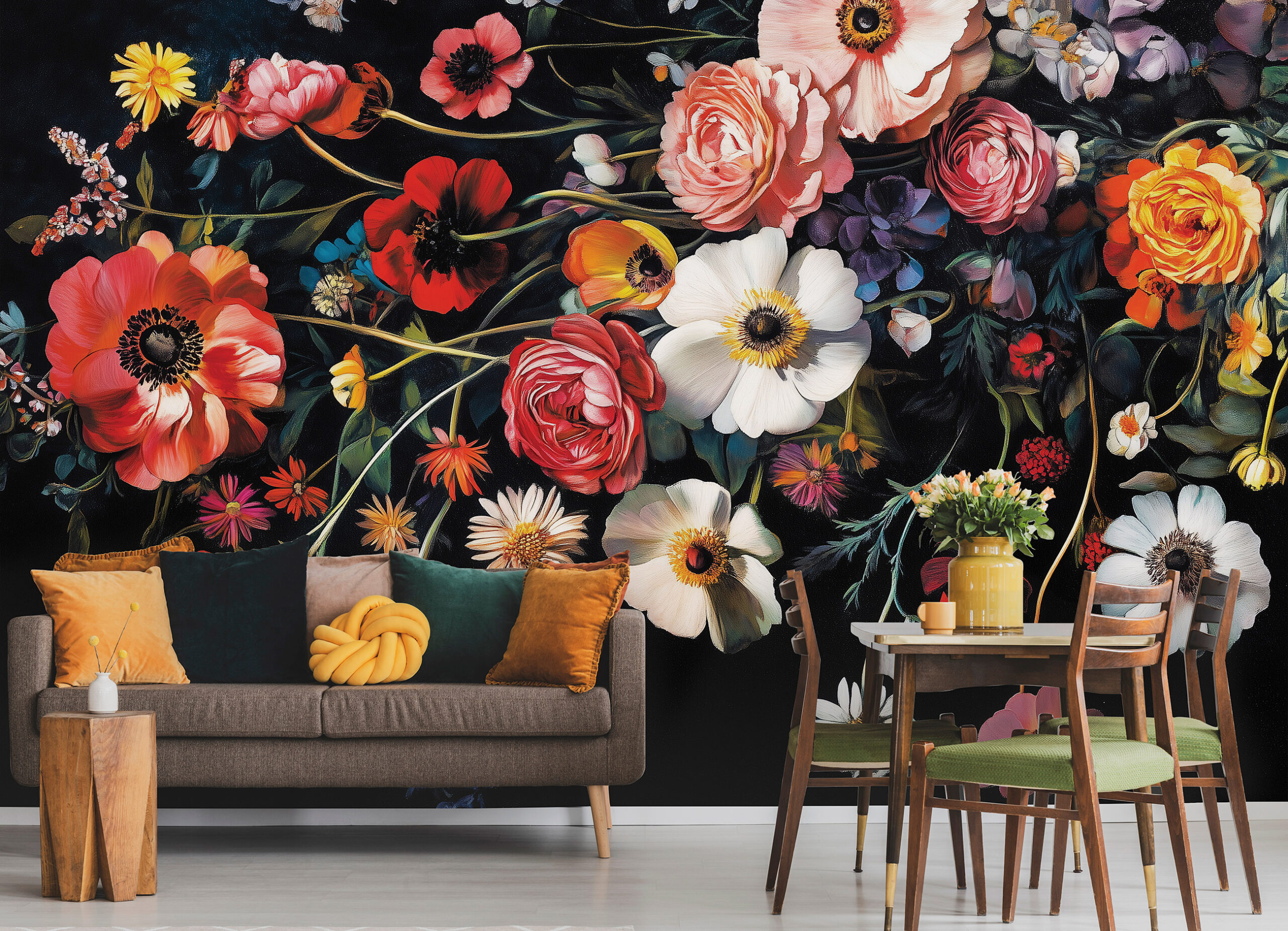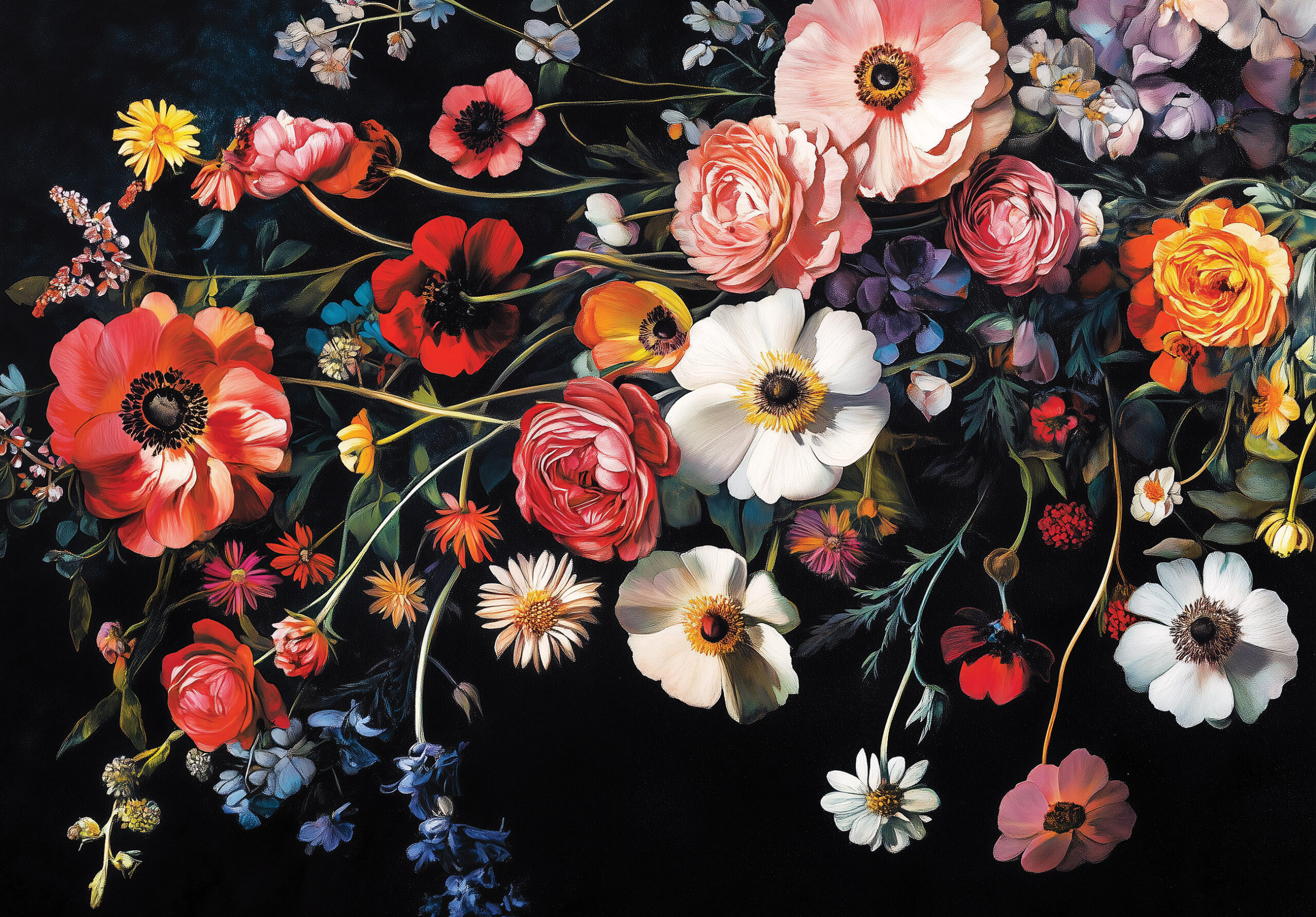 A virágos fotótapéta drámai hatást kelt a vibráló színű virágok és a fekete háttér kontrasztjával. Ez a romantikus és egyben elegáns minta különleges fókuszponttá teszi a falat, amely feldobja a nappali vagy a hálószoba atmoszféráját. Művészi hatású dizájn, amely biztosan magára vonja a figyelmet.