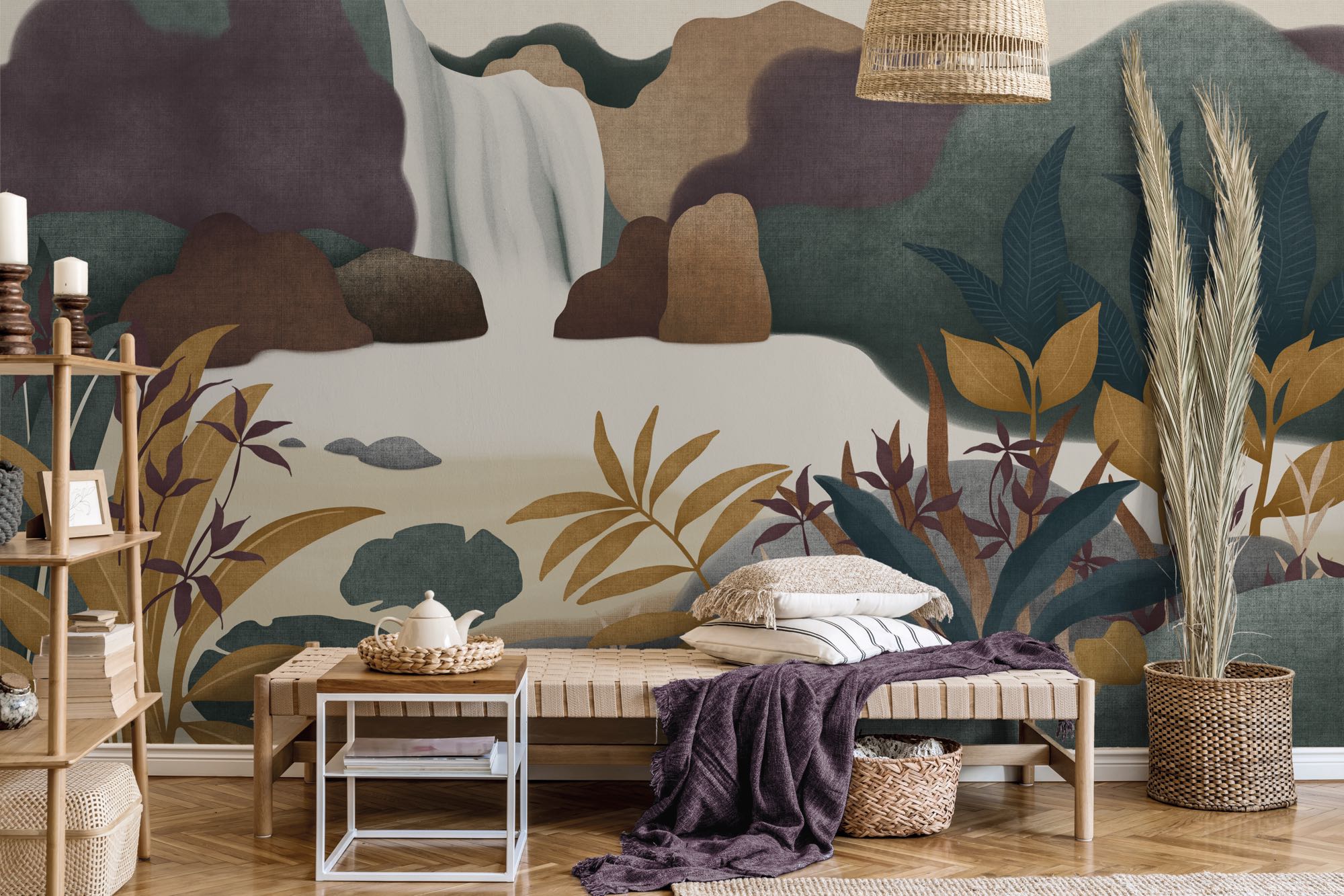 Ez a vízeséses fotótapéta egy festményszerű természeti világba repít, ahol a lágyan áramló víz, az organikus sziklaformák és a buja növényzet harmonikus egységet alkotnak. Az okker, bordó, csokoládébarna és petrol árnyalatok meleg, mély hangulatot teremtenek, miközben a sima felület művészi karaktert ad a falnak.