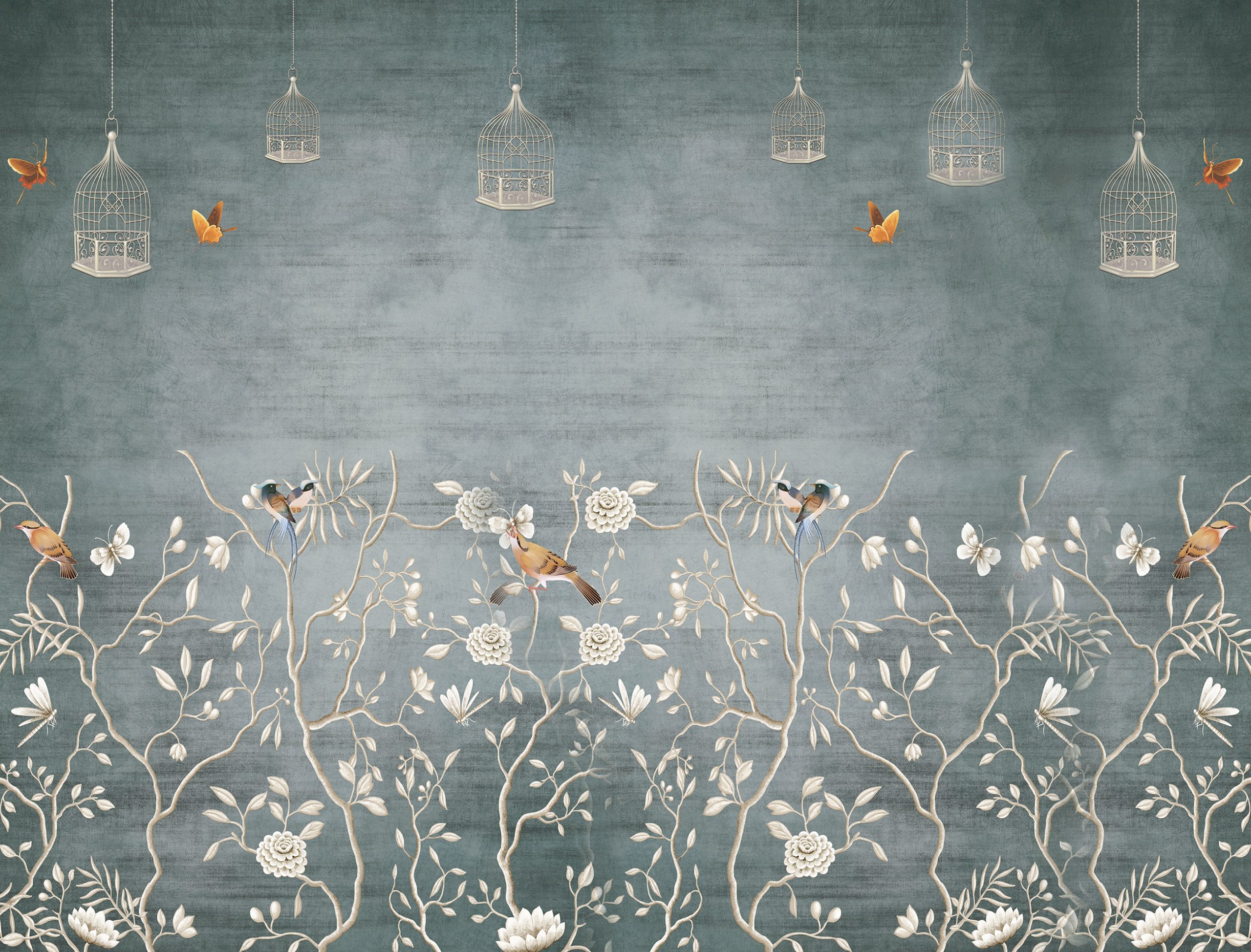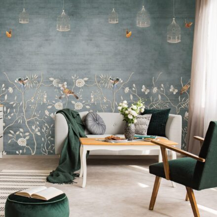 A chinoiserie virágos – madaras minta harmonikus szépsége járja át a fotótapétát, melynek különlegessége a felül megjelenő madárkalitka minta.