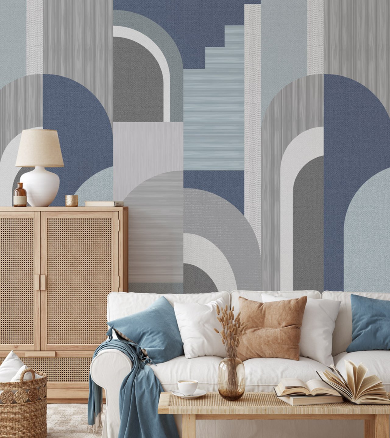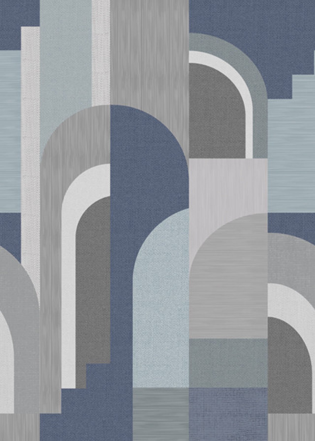 Vlies fotótapéta kék retro mintával, melynek sima felületén a nyomatok szövet struktúrákat mutatnak be. A félköríves minták kombinálása a szövet imitációkkal otthonos melegséget áraszt, miközben trendi falidekorációt teremt.