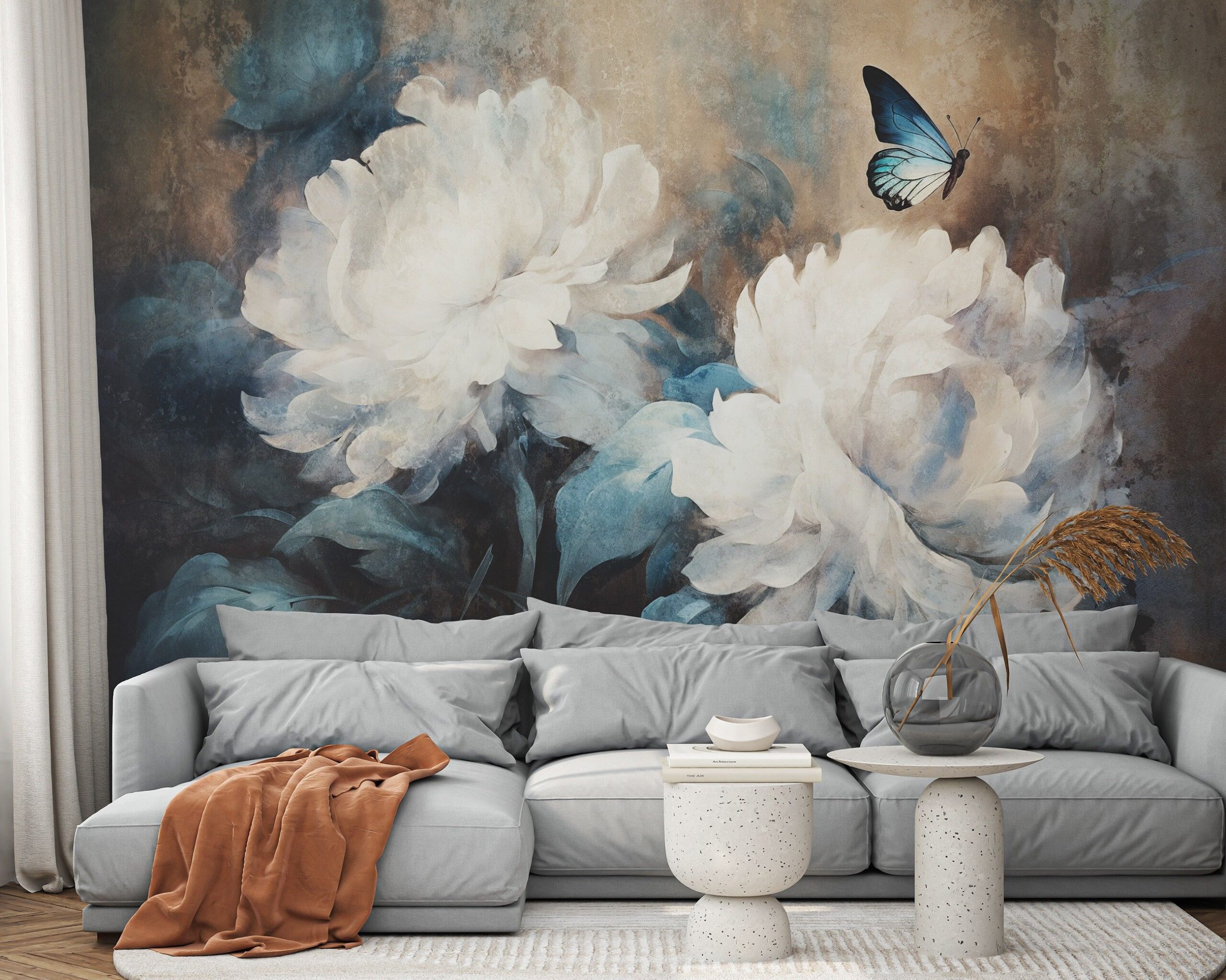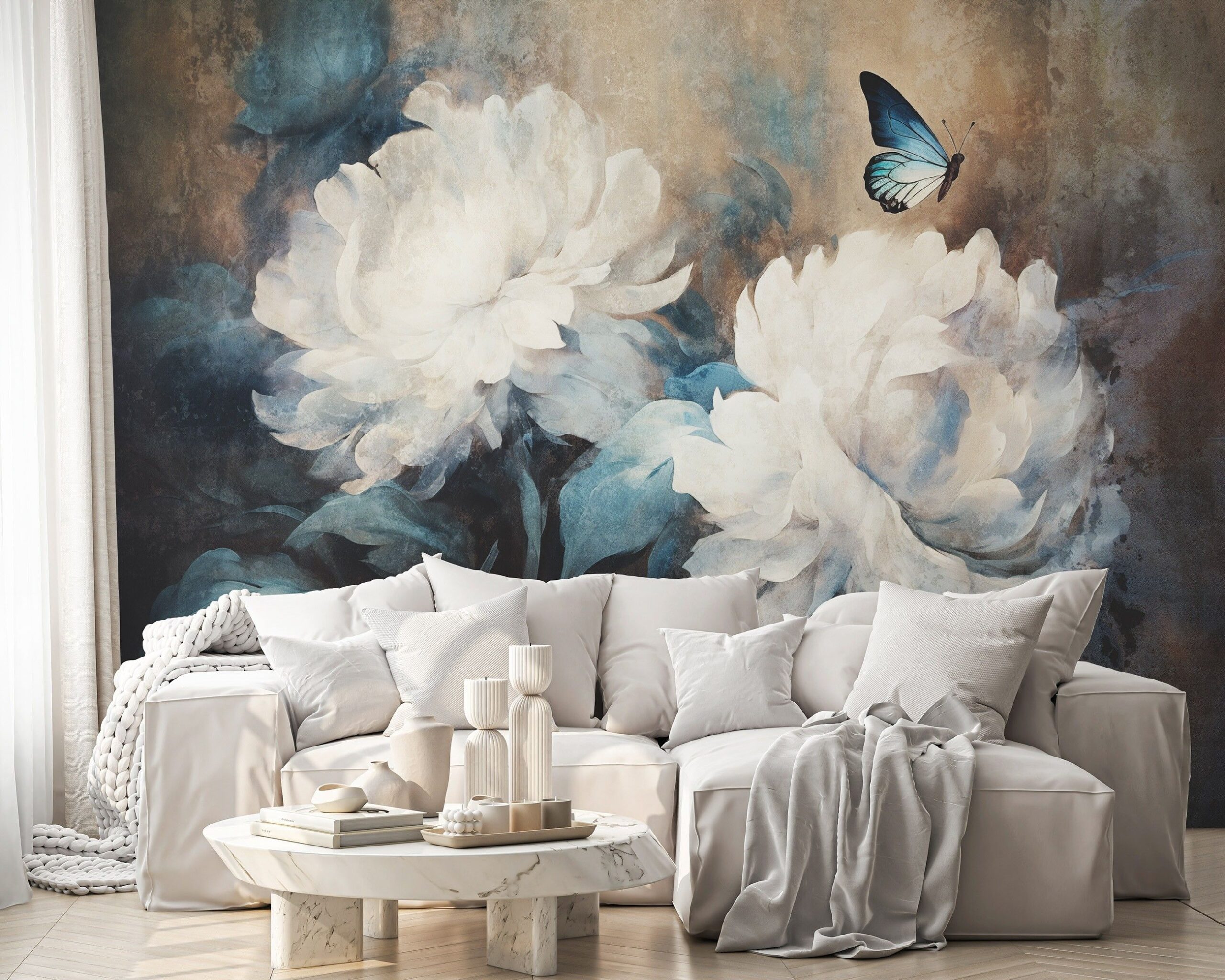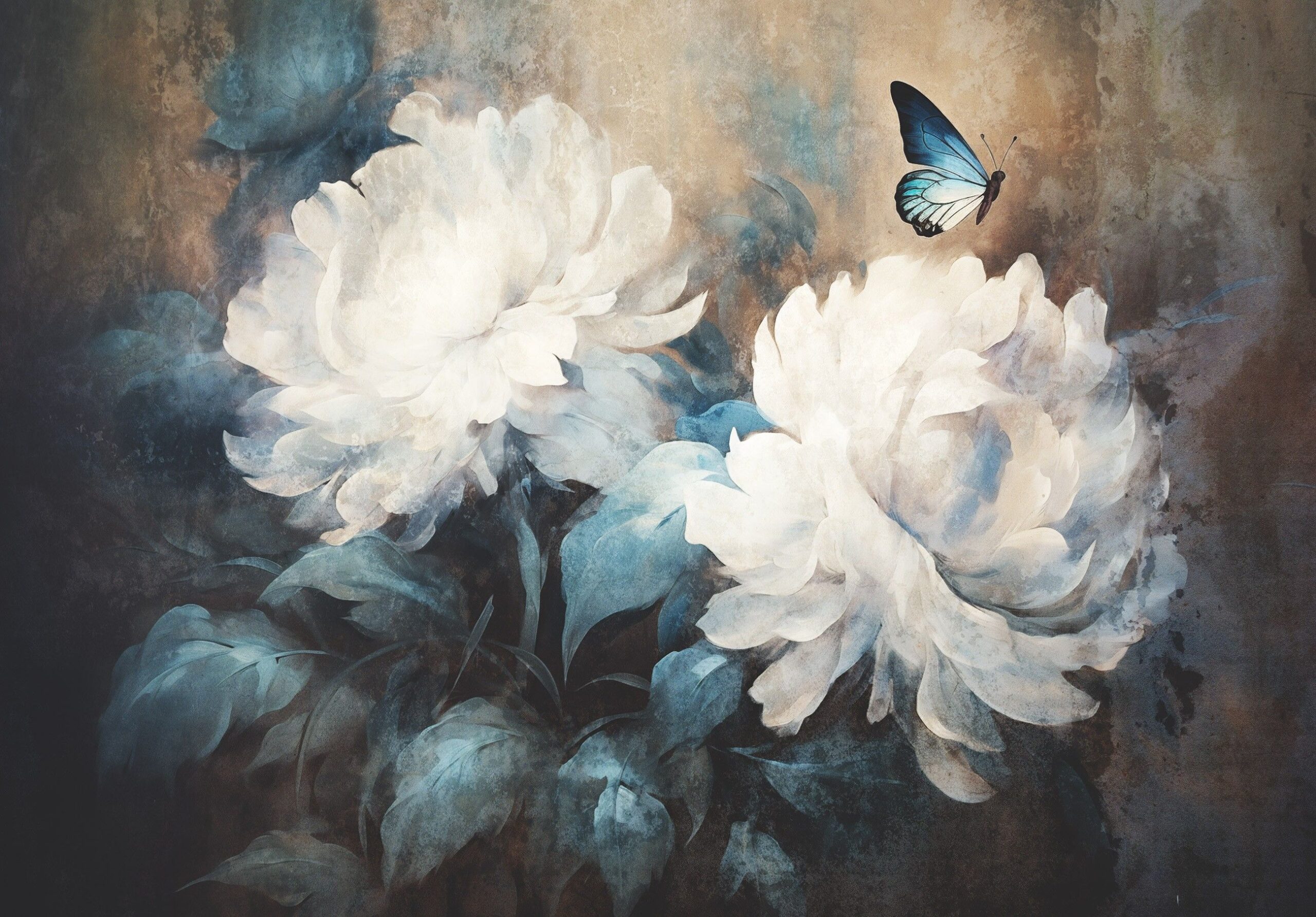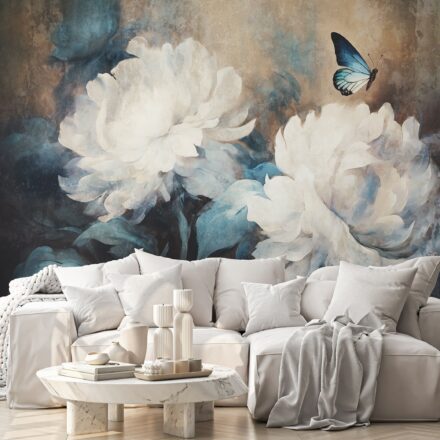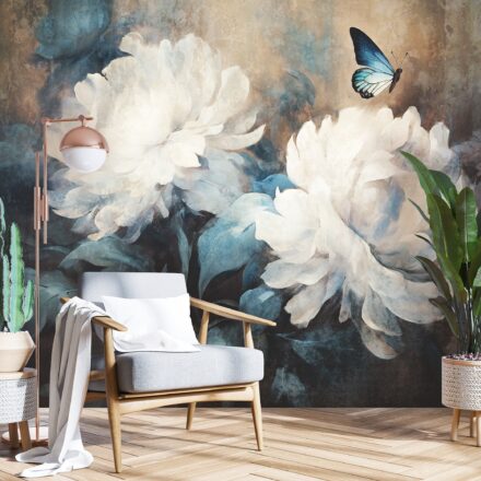 Vlies fotótapéta nagy méretű fehér virágokkal, melynek egyedi, romantikus külsőt kölcsönöz az arra repülő pillangó. A kékes árnyalatú kiegészítés hangulatossá varázsolja a fotótapétát.