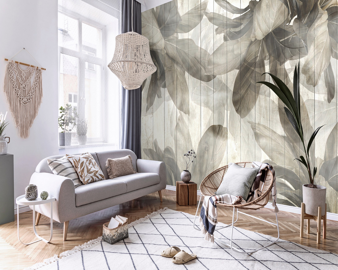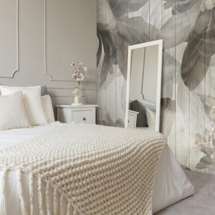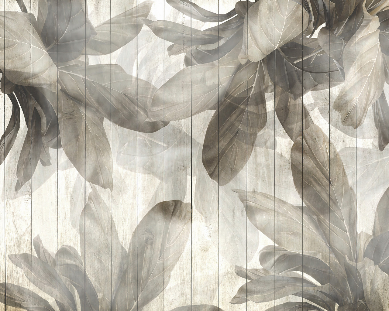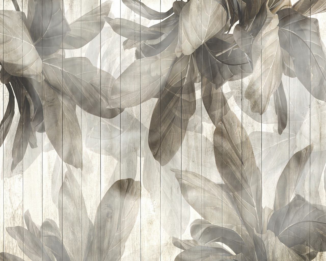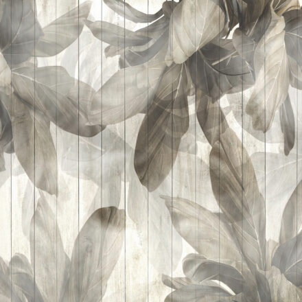 Fa alapot imitáló fotótapéta, melyet nagyméretű levelek borítanak be. Hangulatos fotótapéta, mely harmóniát és nyugalmat sugároz kellemes színeivel.