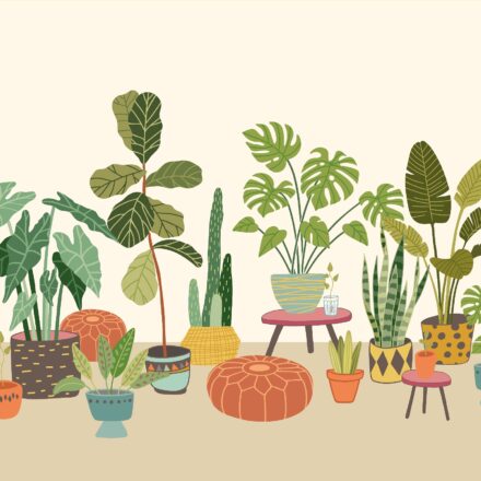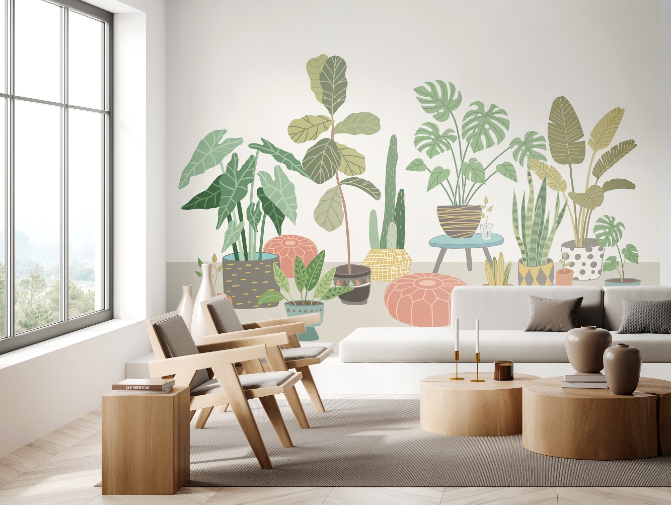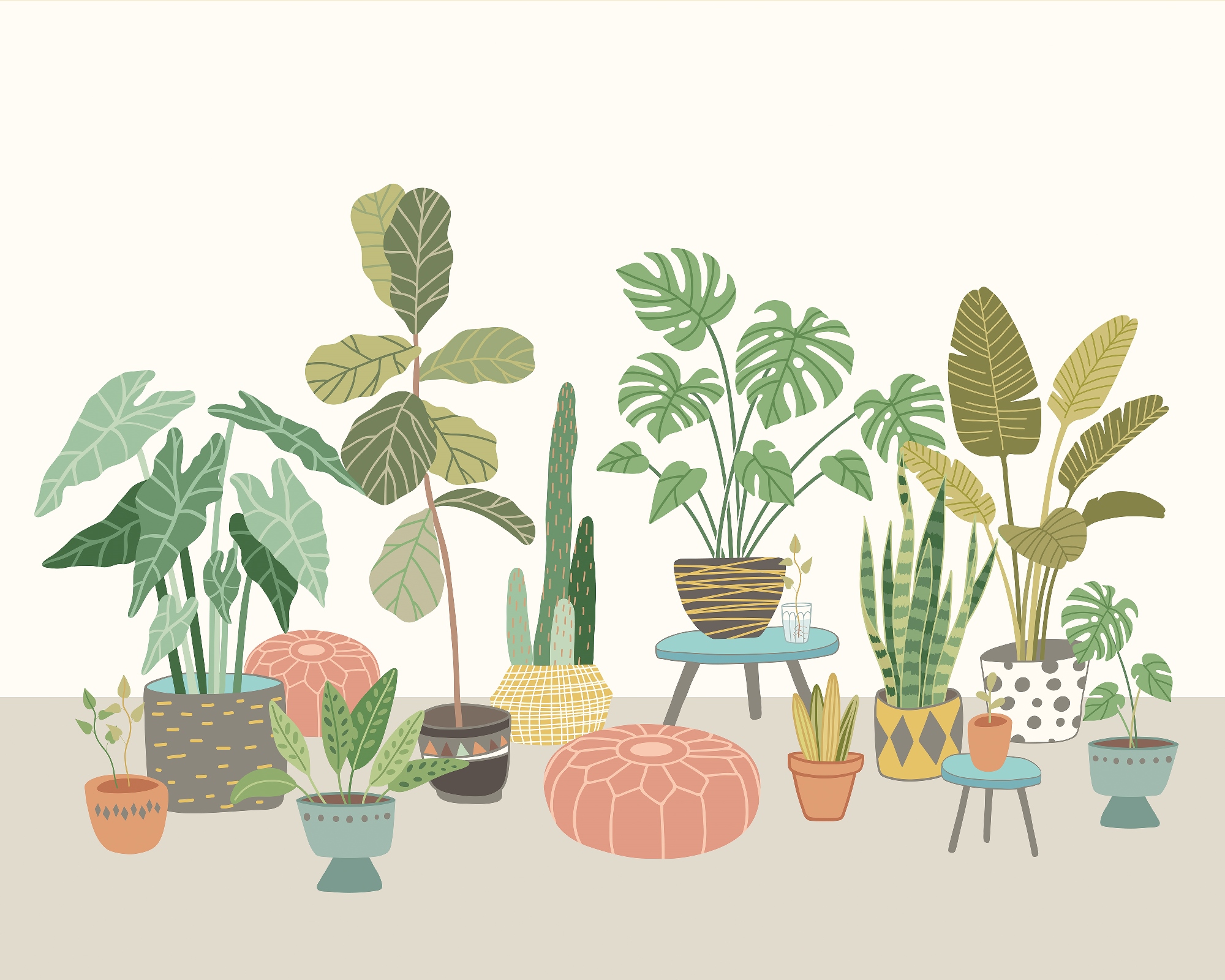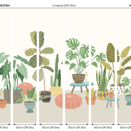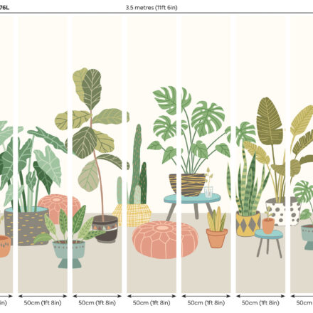Ez a különleges hangulatot árasztó fotótapéta különböző méretű szobanövényeket ábrázol, melyek dekoratív cserepekben foglalnak helyett a szobában. Tökéletes kompozíció, melyben a kis méretű kaktuszokat nagy levelű szobapáfrányok egészítenek ki.