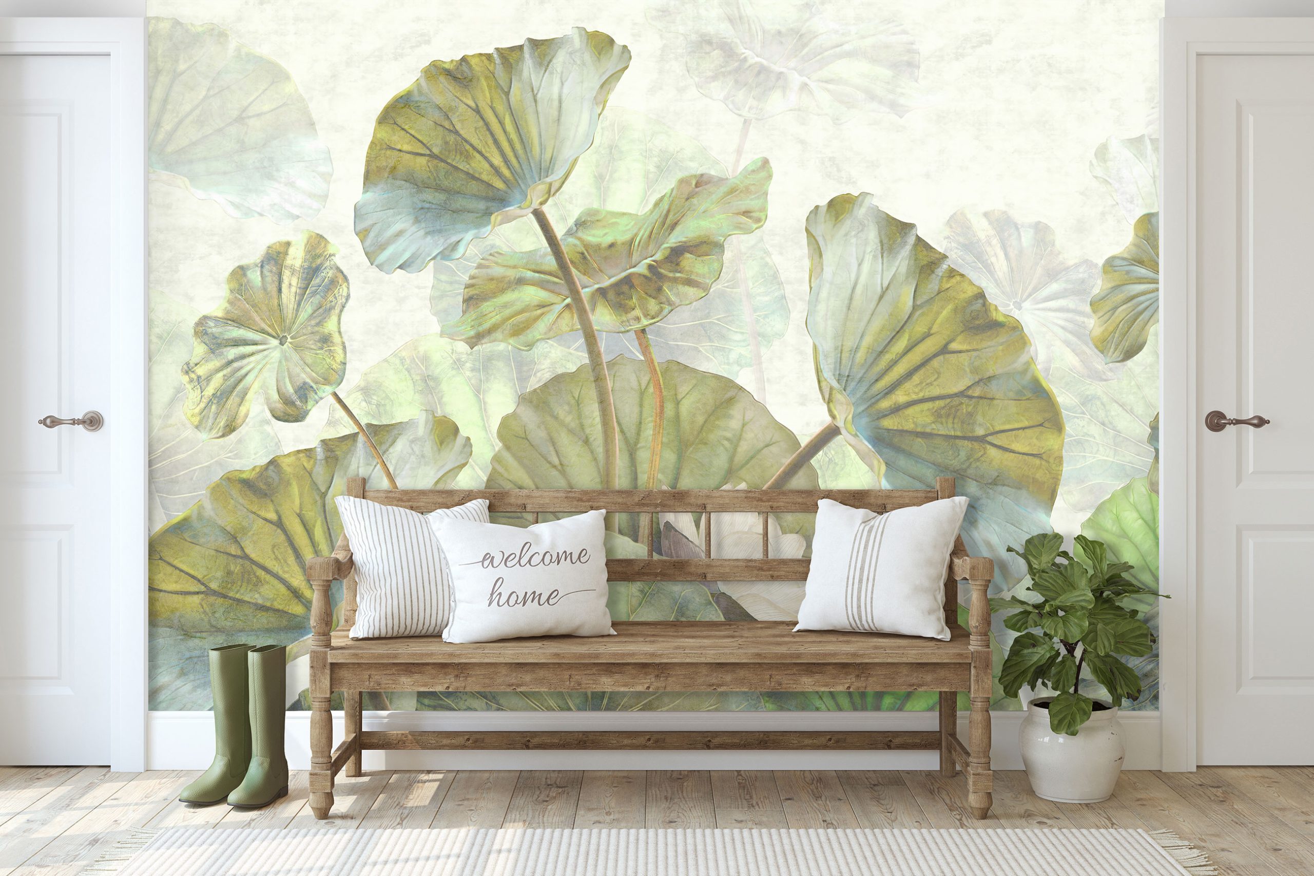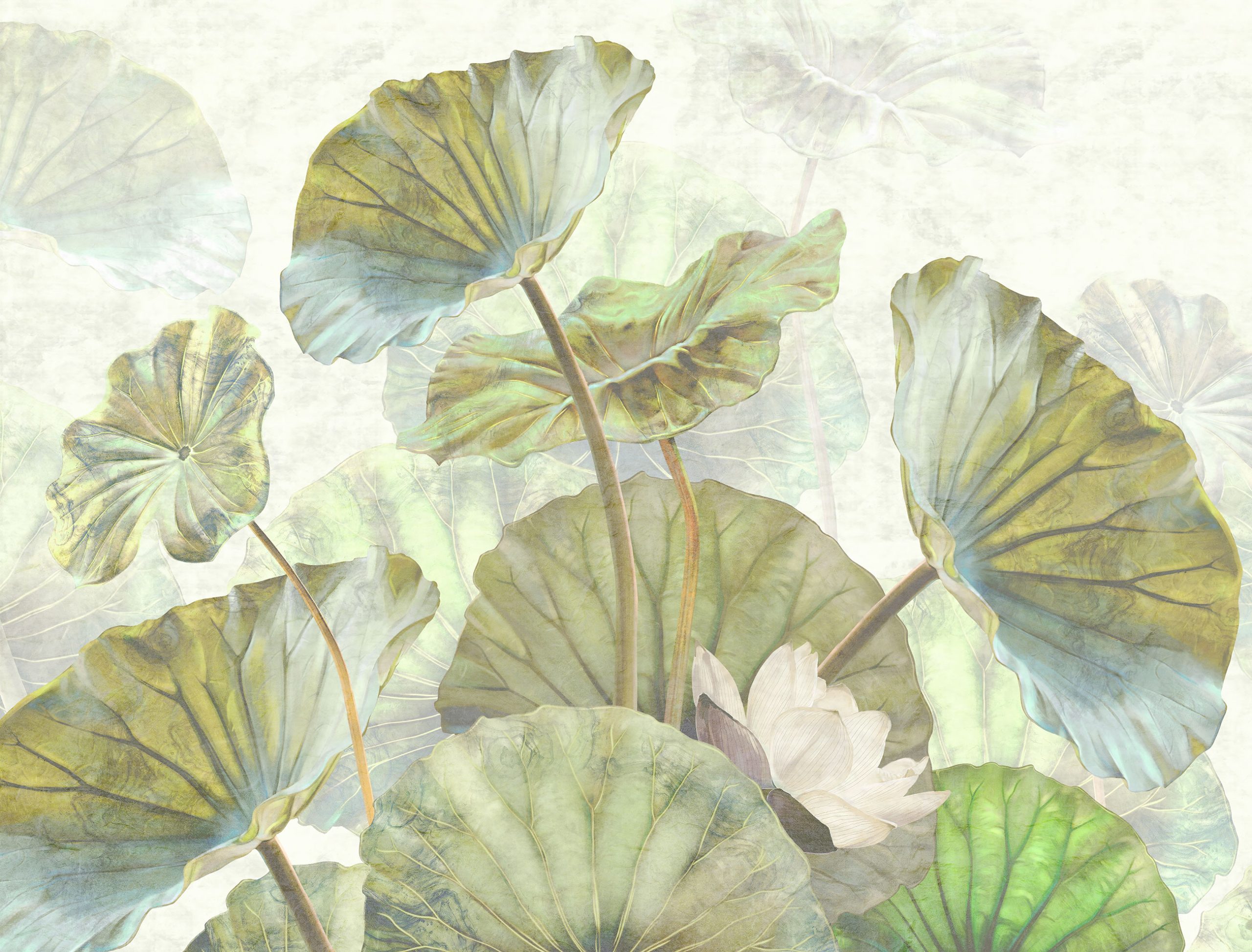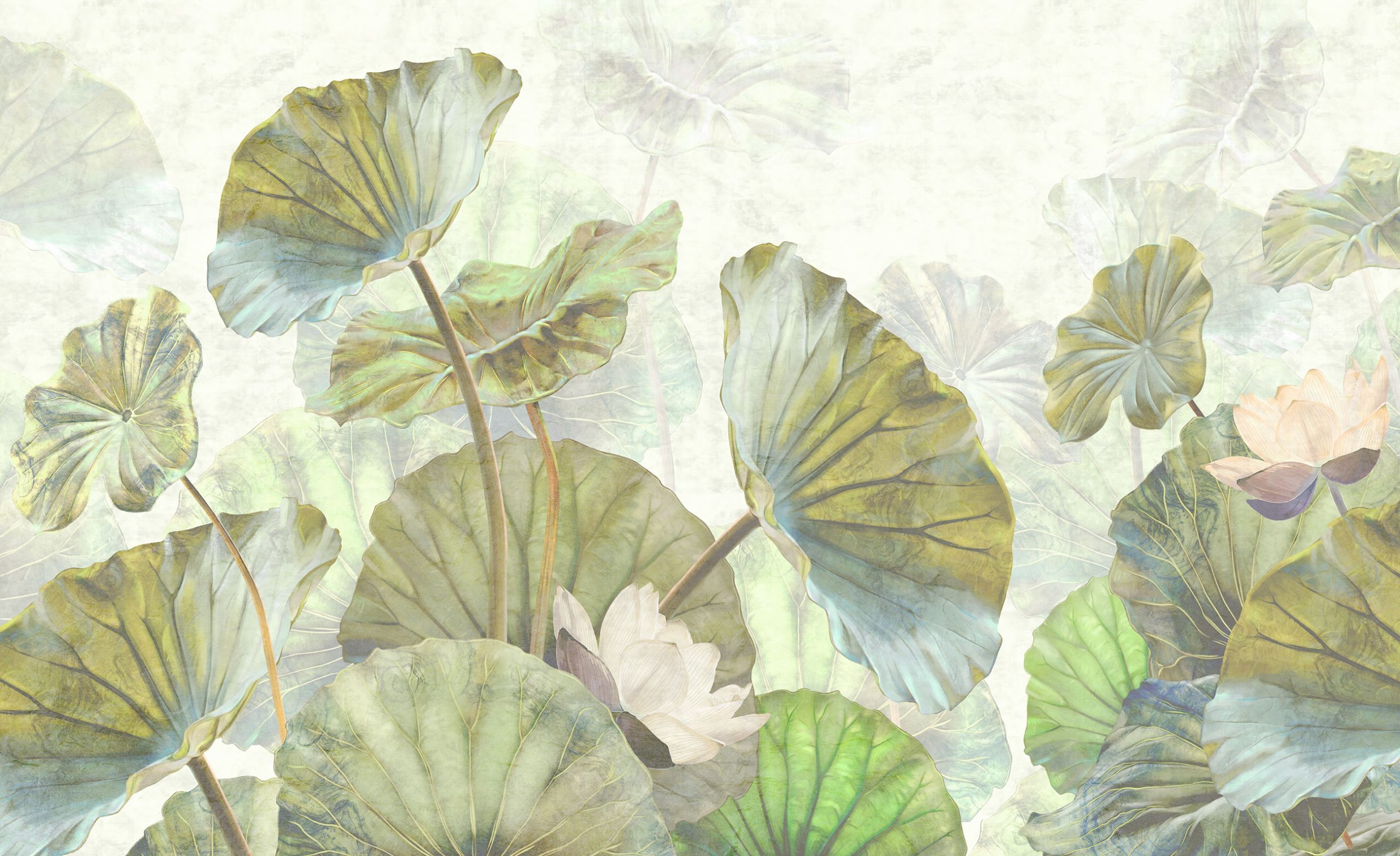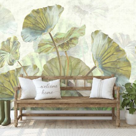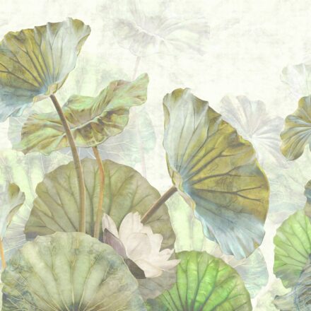 Nagyméretű tavirózsa levelek dekorálják a vlies fotótapétát, melynek orientális stílusa harmonikus nyugalmat áraszt az enteriőrben.