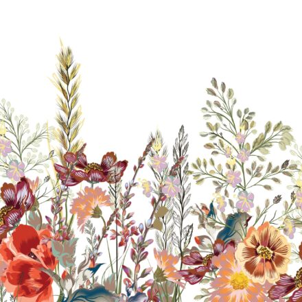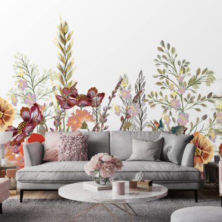 Vlies fotótapéta vadvirágokkal, melyek elegáns rajzolattal jelennek meg a fehér alapon. A fotótapéta élénk színei a tavasz üde frissességét hozzák el otthonunkba.