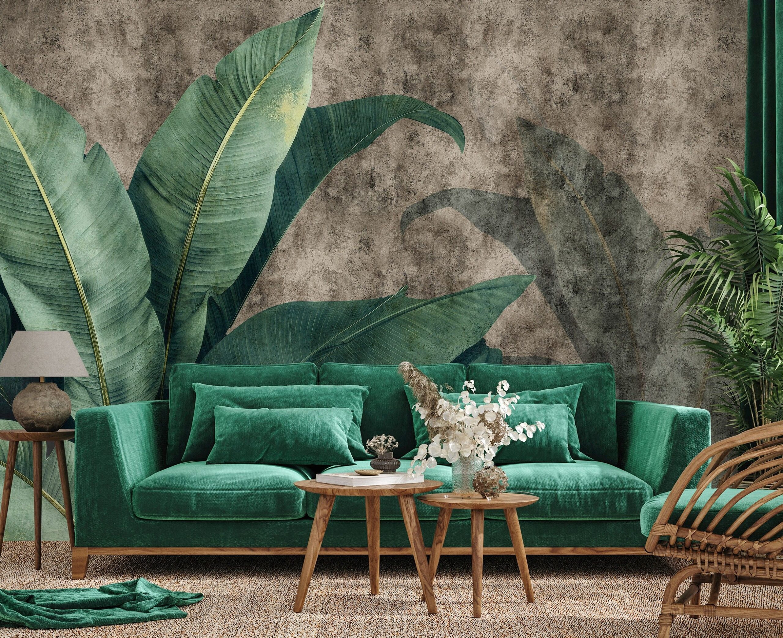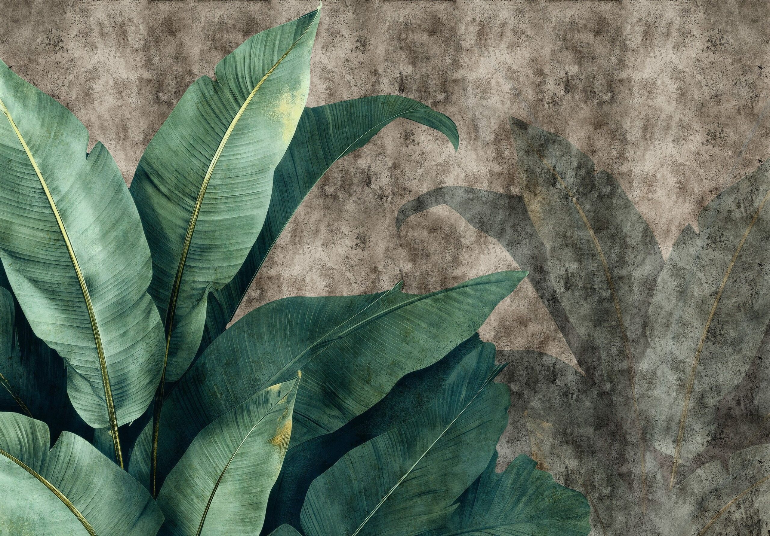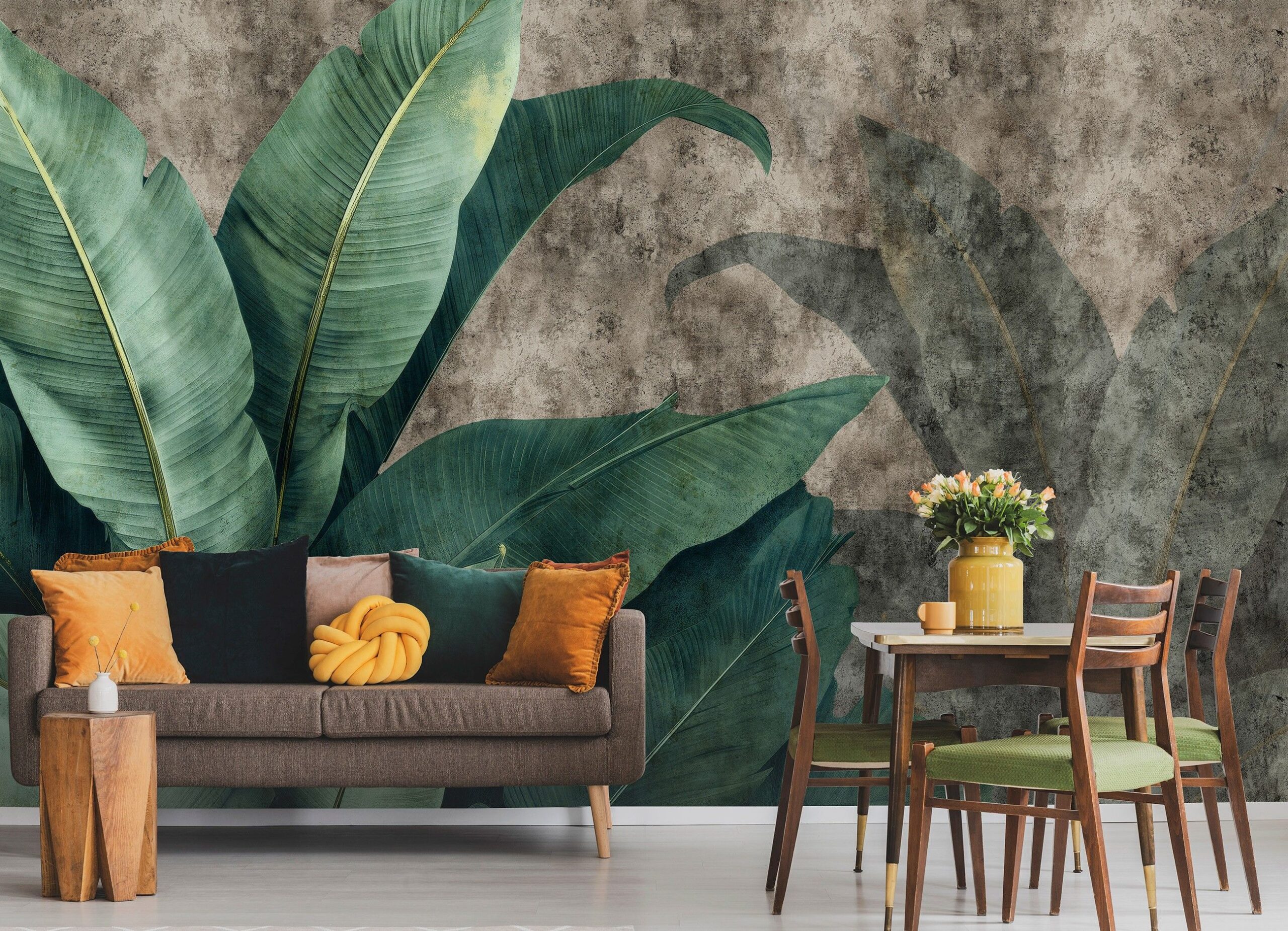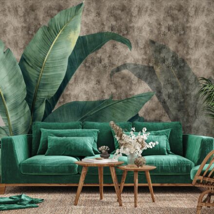 Banánlevél fotótapéta – élettel teli, nagy zöld banánlevelek díszítik ezt a faldekorációt, amely trópusi hangulatot visz bármely helyiségbe. Természetközeli és modern választás nappaliba, étkezőbe vagy dolgozószobába.